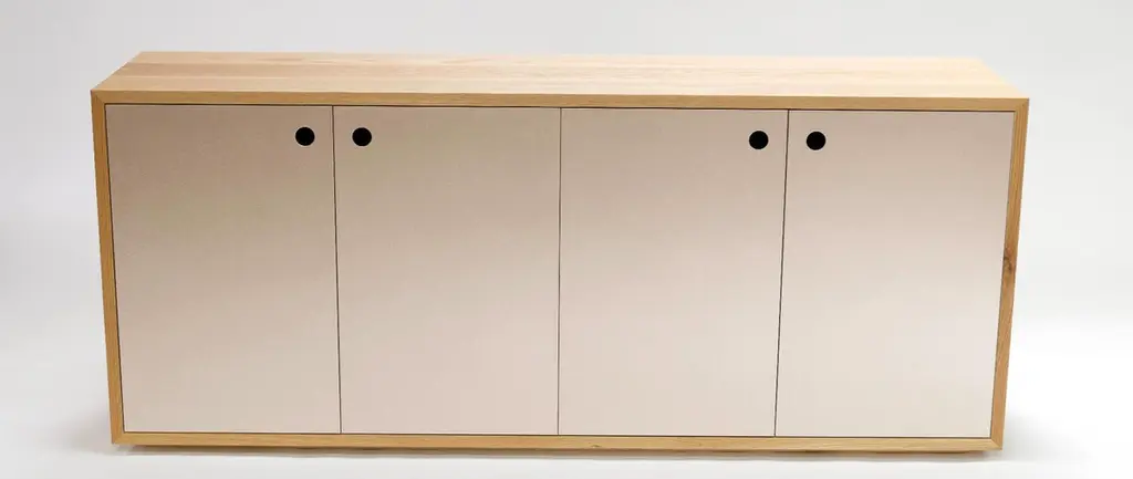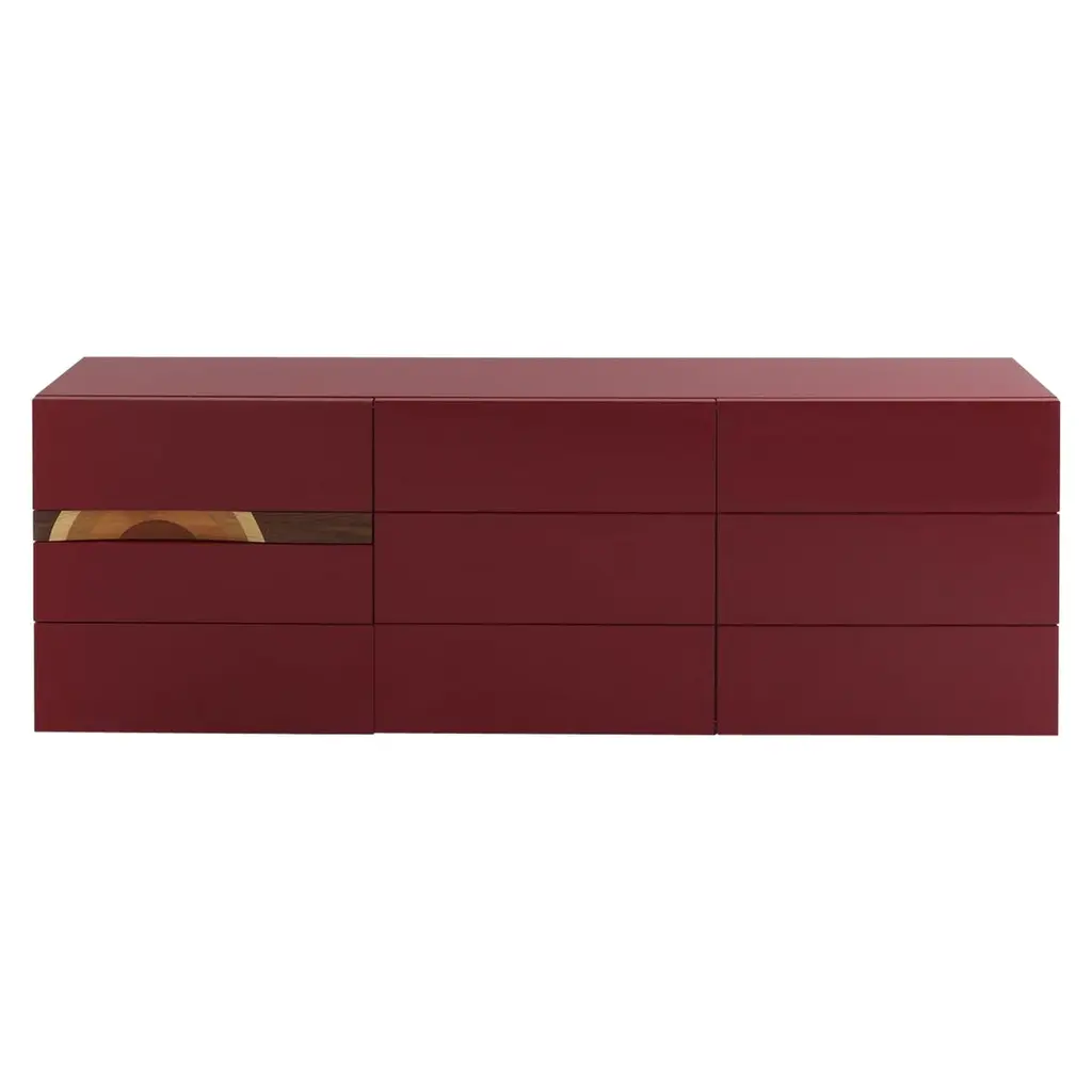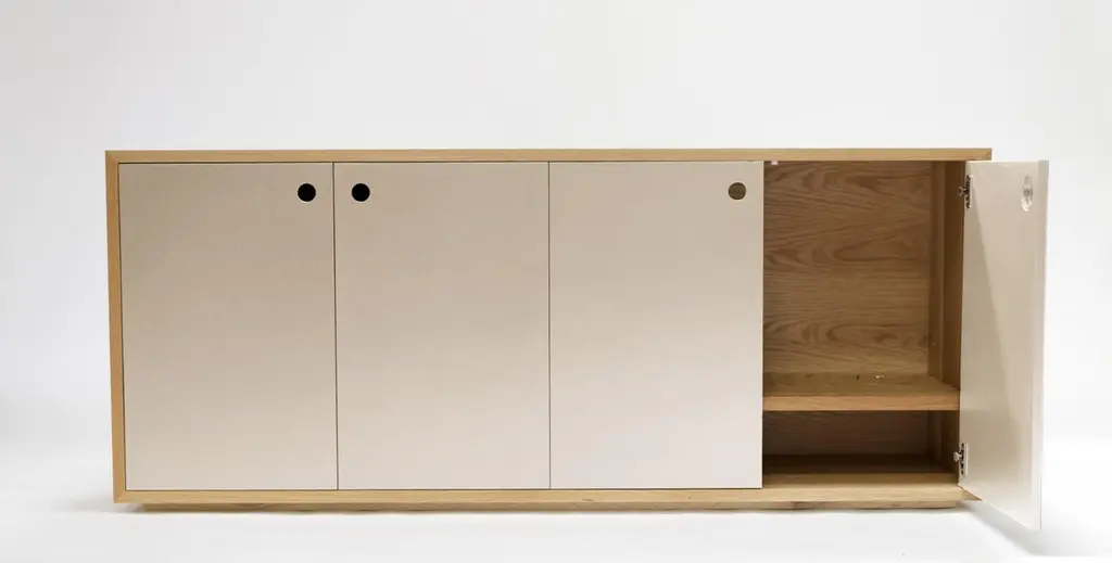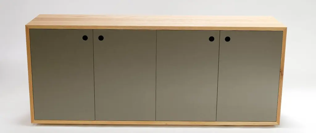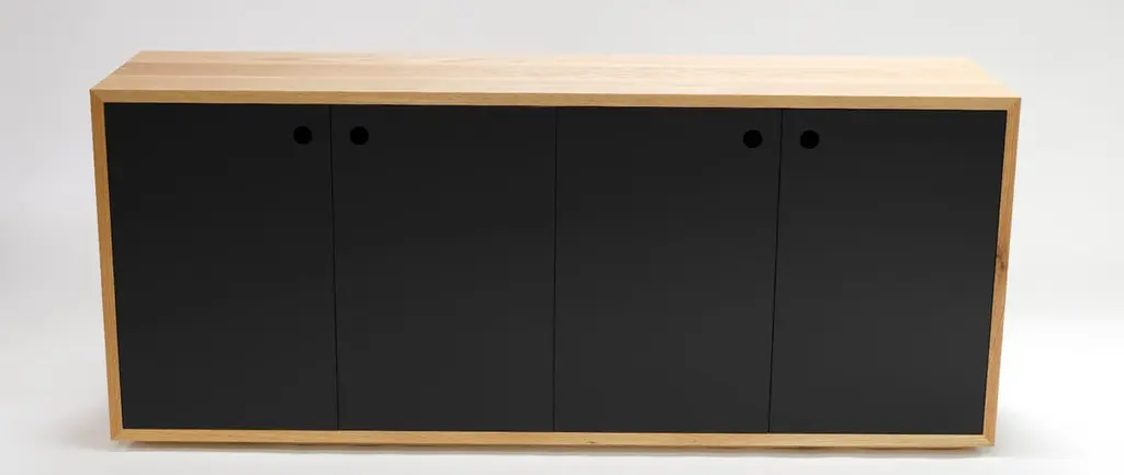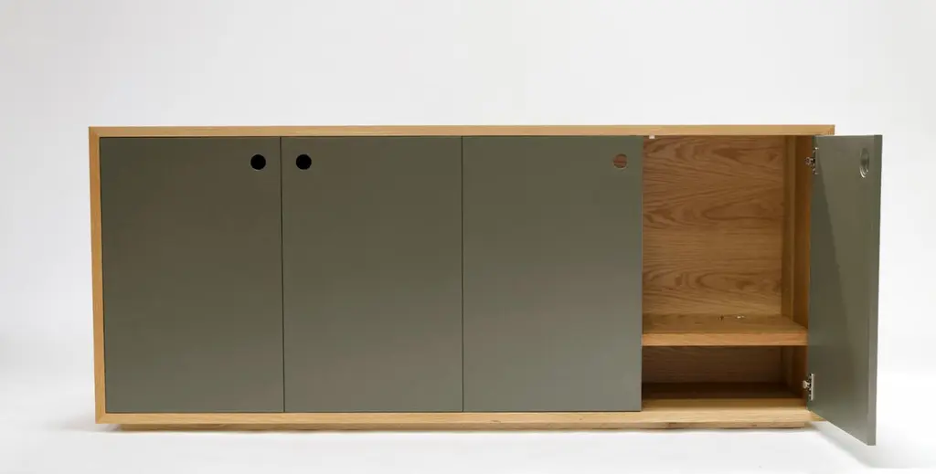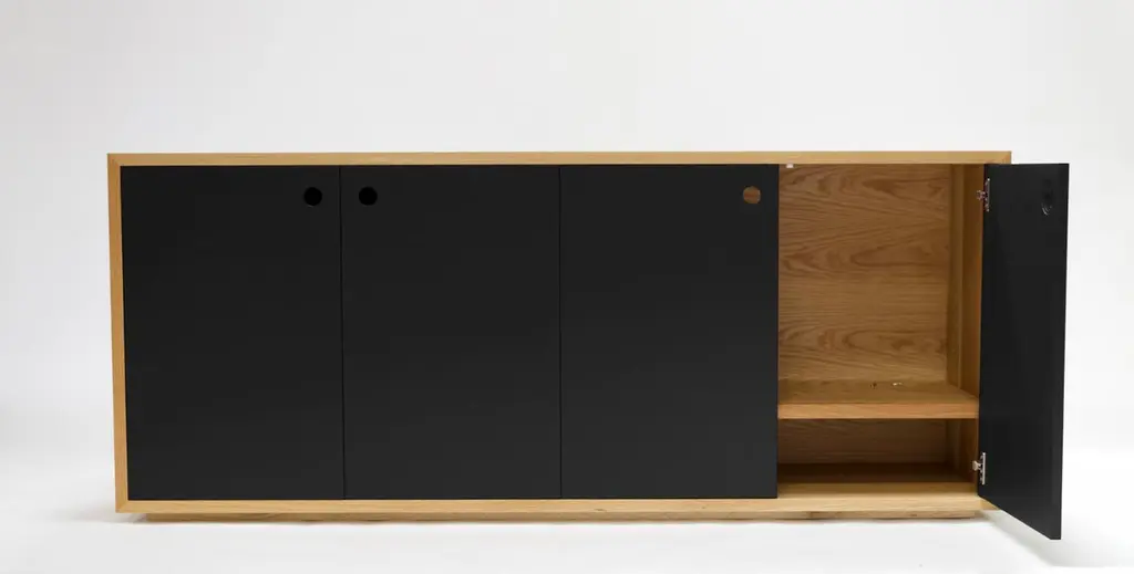 Custom Sonoran Credenza by FDP Collection.The Sonoran Credenza is hand-crafted from solid Oak in an oil-rubbed finish and custom-colored doors. Color door options are Japanese Red, Black, Blanco, Gris, and Prouve Blue. Each credenza features an adjustable interior shelf for storage.The pricing is for the credenza shown crafted in solid Oak, with 1 interior shelf in each bay. Dimensions are 18" D x 30" H x 72" W. The credenza is customizable and is available in different wood species(oak, walnut, or pine), wood finishes, and interior shelving/drawer layouts. Each credenza is intricately hand-crafted from our workshop in Northern California.