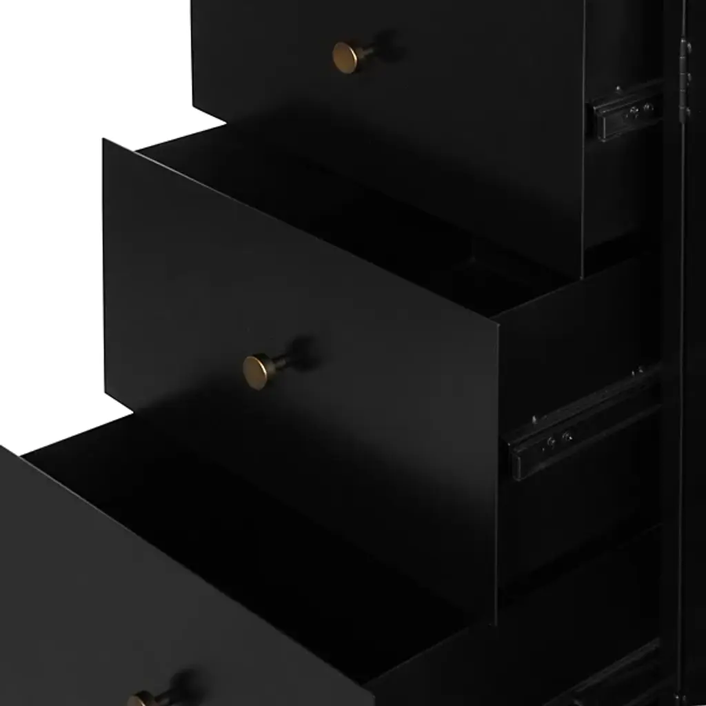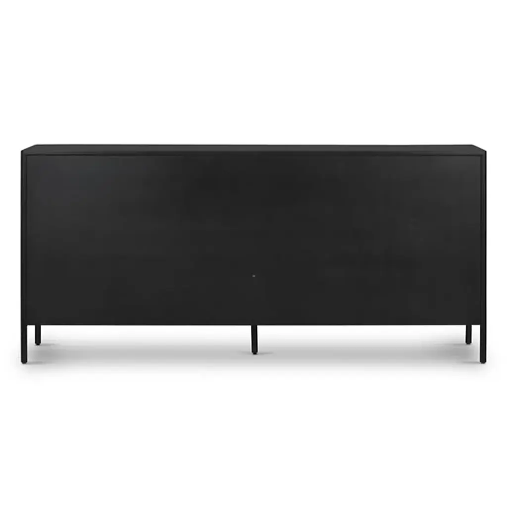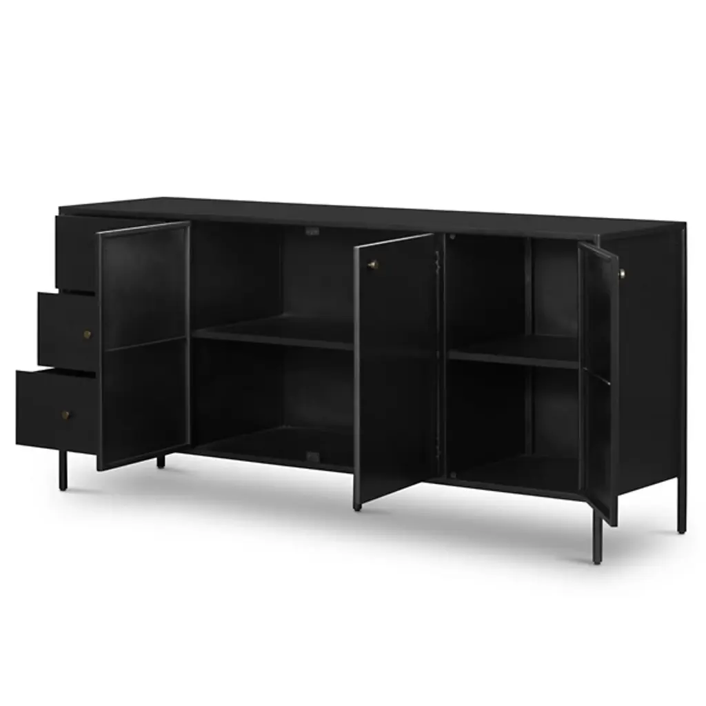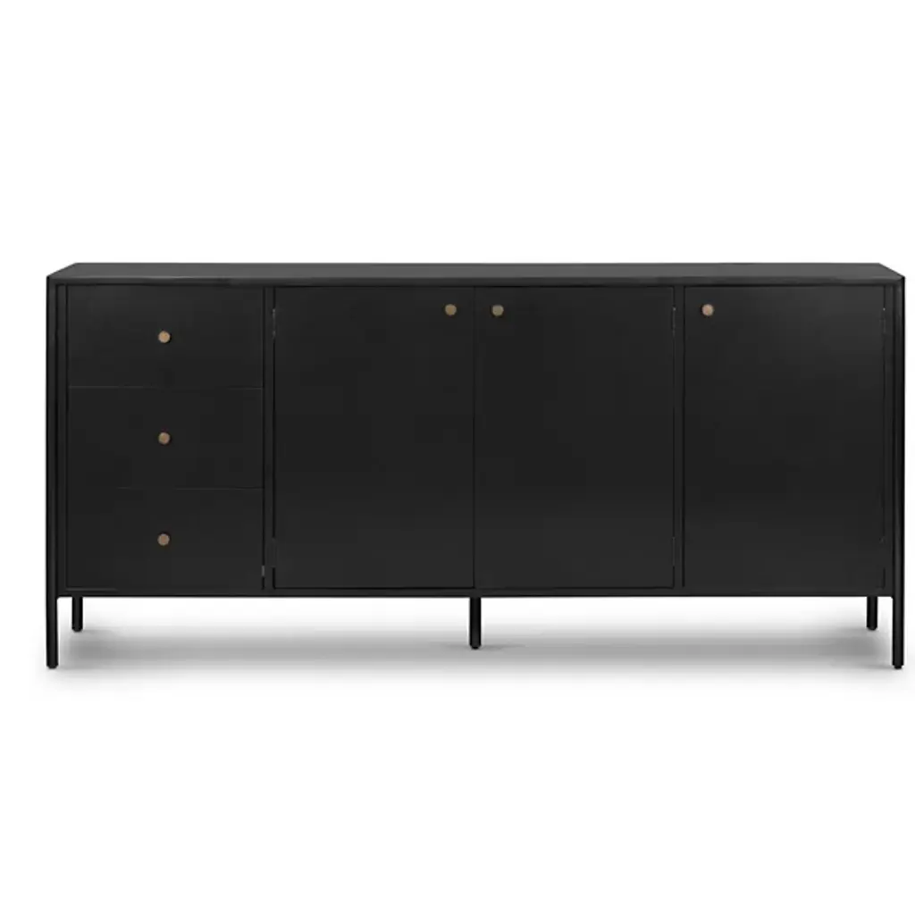 The Soto Sideboard from Four Hands introduces a vintage industrial presence to living spaces with its stark, black-finished iron construction and bronzed hardware. Made in Vietnam and featuring three spacious drawers and generous closed cabinetry, it also has two fixed shelves providing plenty of storage for linens, serving plates, and seasonal decor. The contrasting brass-finished drawer pulls add a touch of elegance.