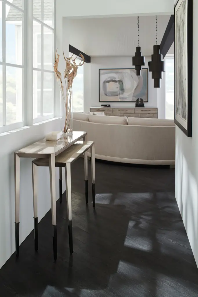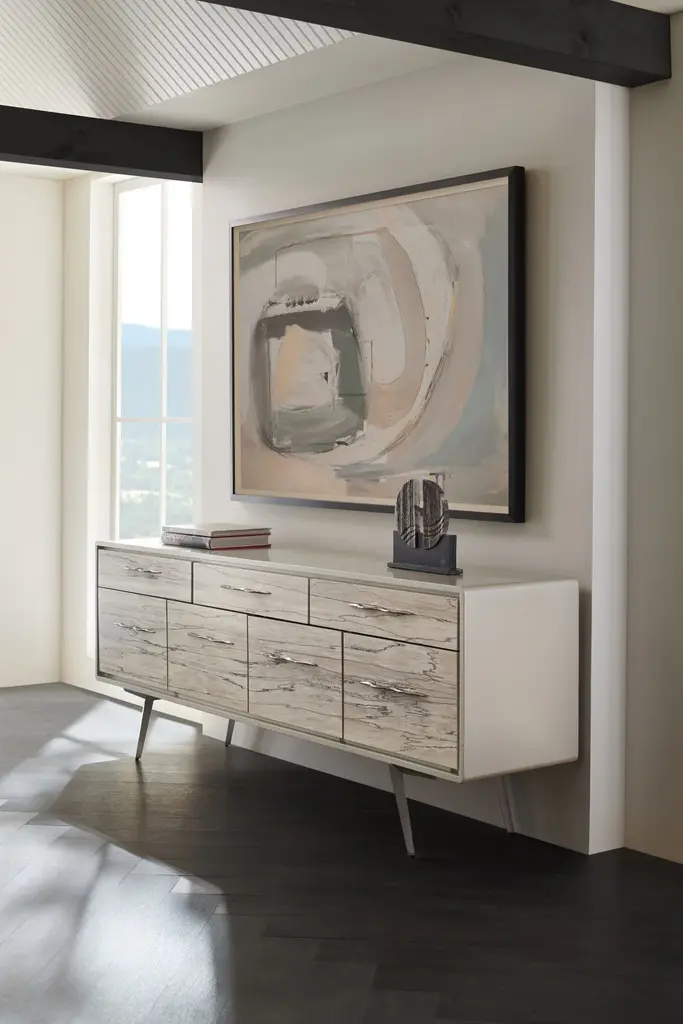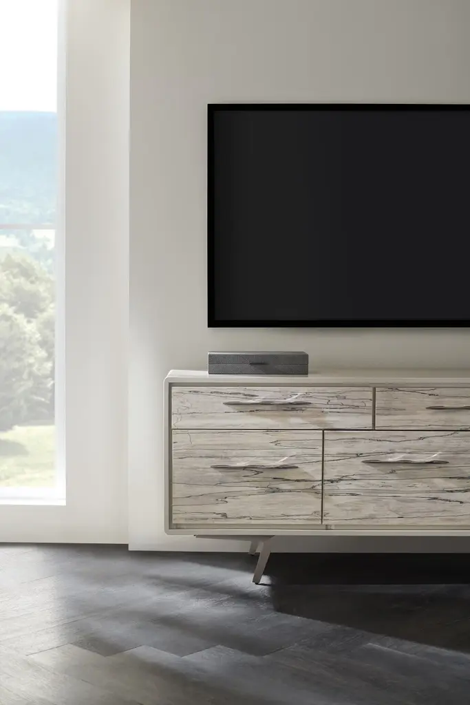 An artful interpretation of found beauty in the natural world, this clean-lined credenza brings a look of casual luxury to living interiors. Masterfully crafted with top drawer fronts and bottom doors in Snowcap Organic–our exclusive, bleached white printed spalted maple veneer–and encased in a Matte Pearl finish for a hint of shimmer. Custom hardware adds interest and emulates the marble-like veining of spalted maple. Features cutouts in the back for wire management, and adjustable metal legs that allow you to raise the height for a more traditional console, or lower it to accommodate media.Download Assembly Sheet