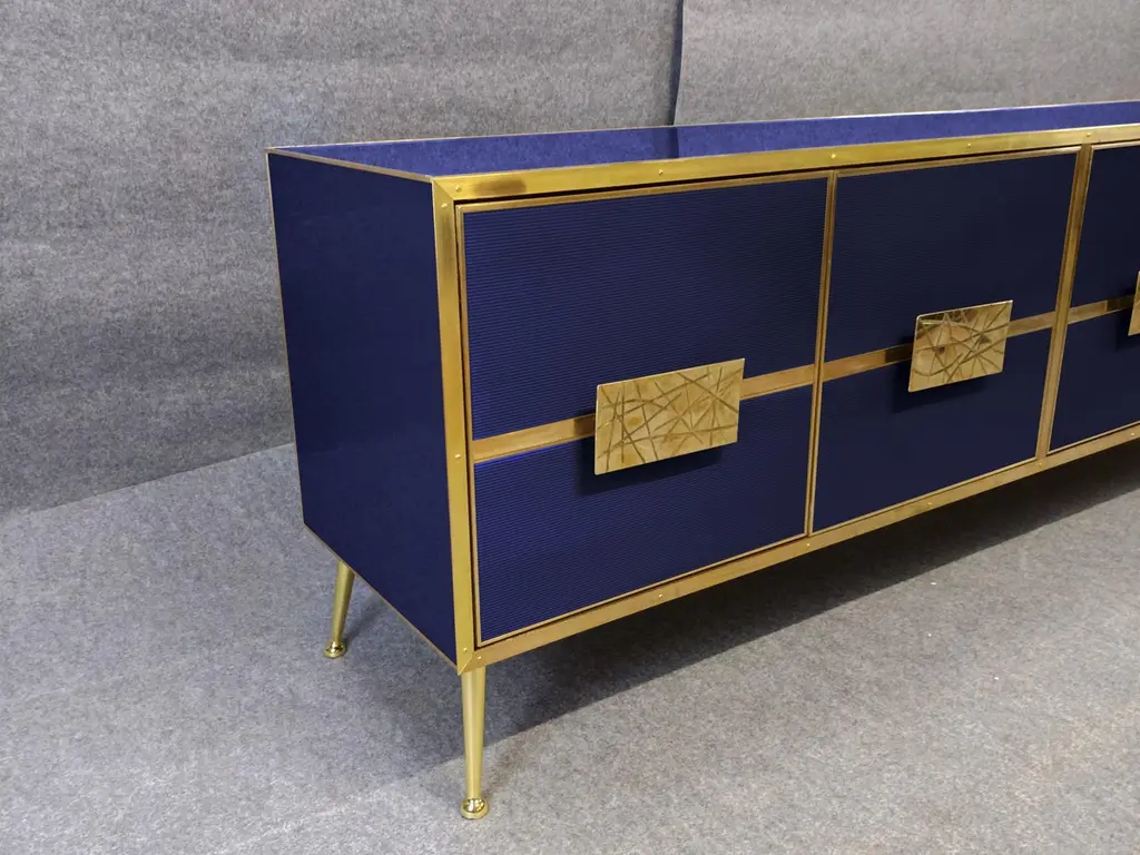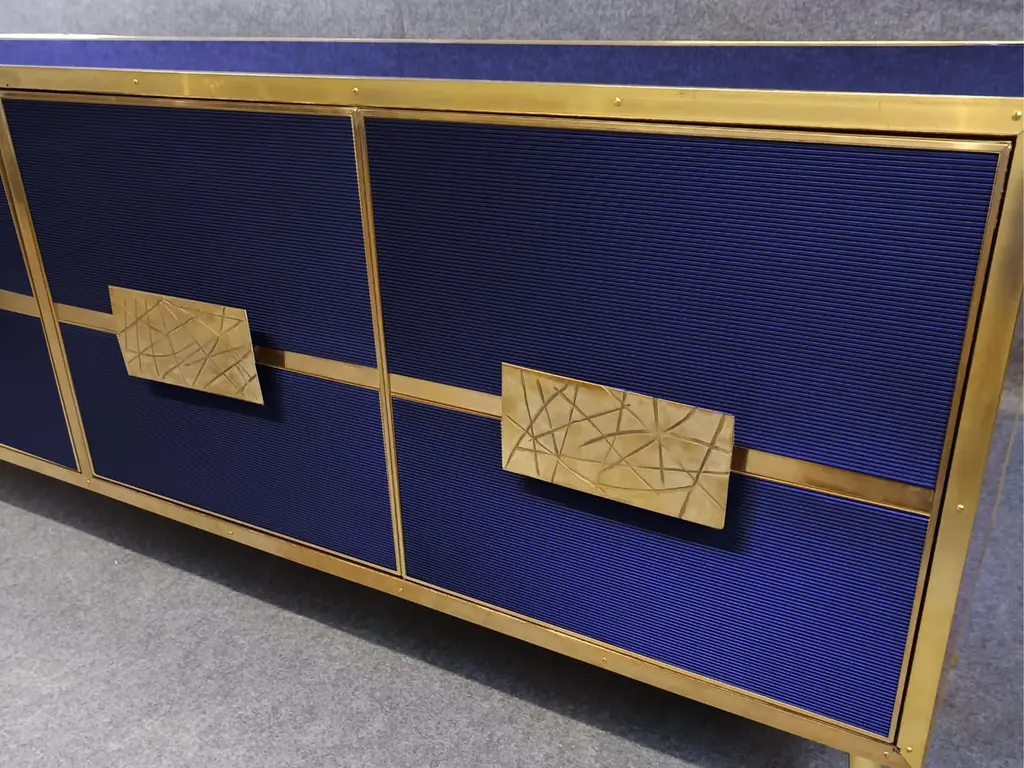 Spectacular Sideboard With Blue "Grisinato" Glass And Brass Trim, Made In Italy