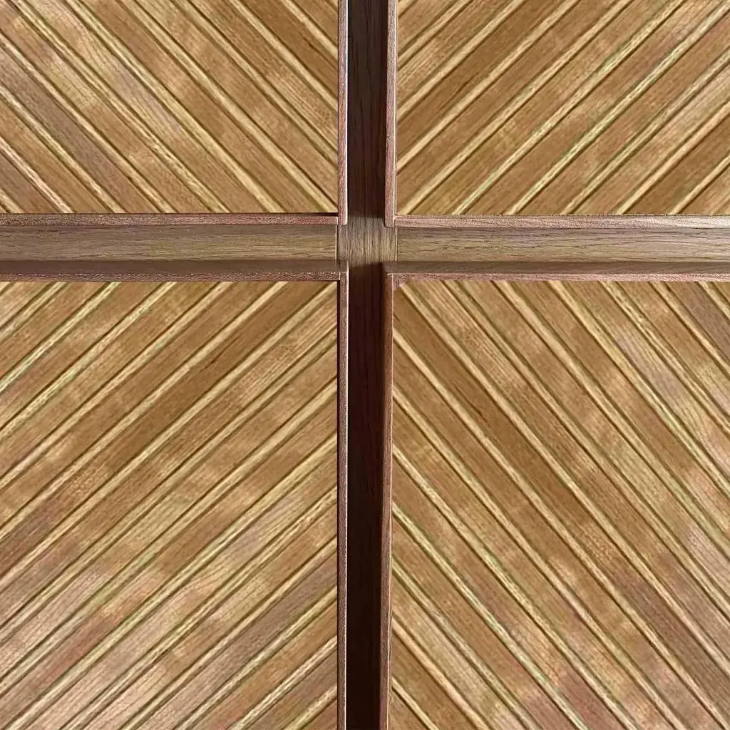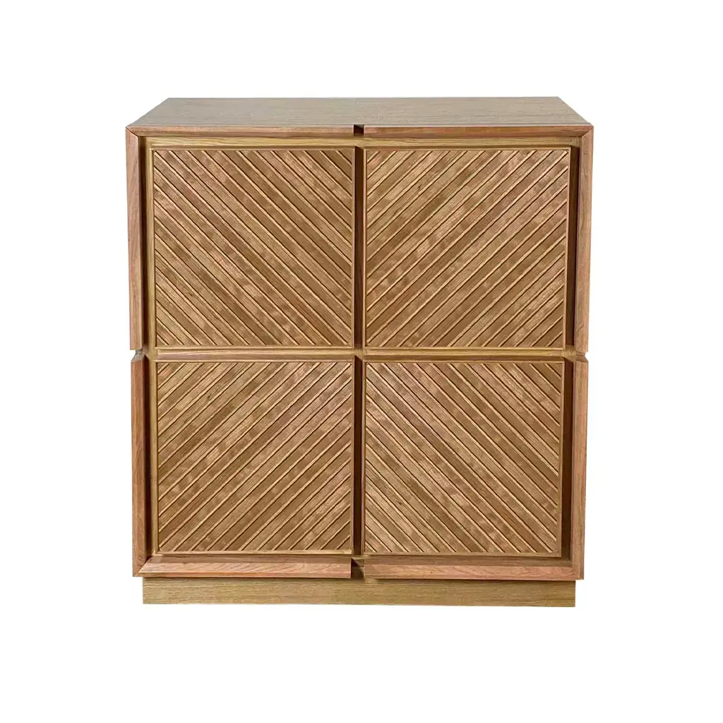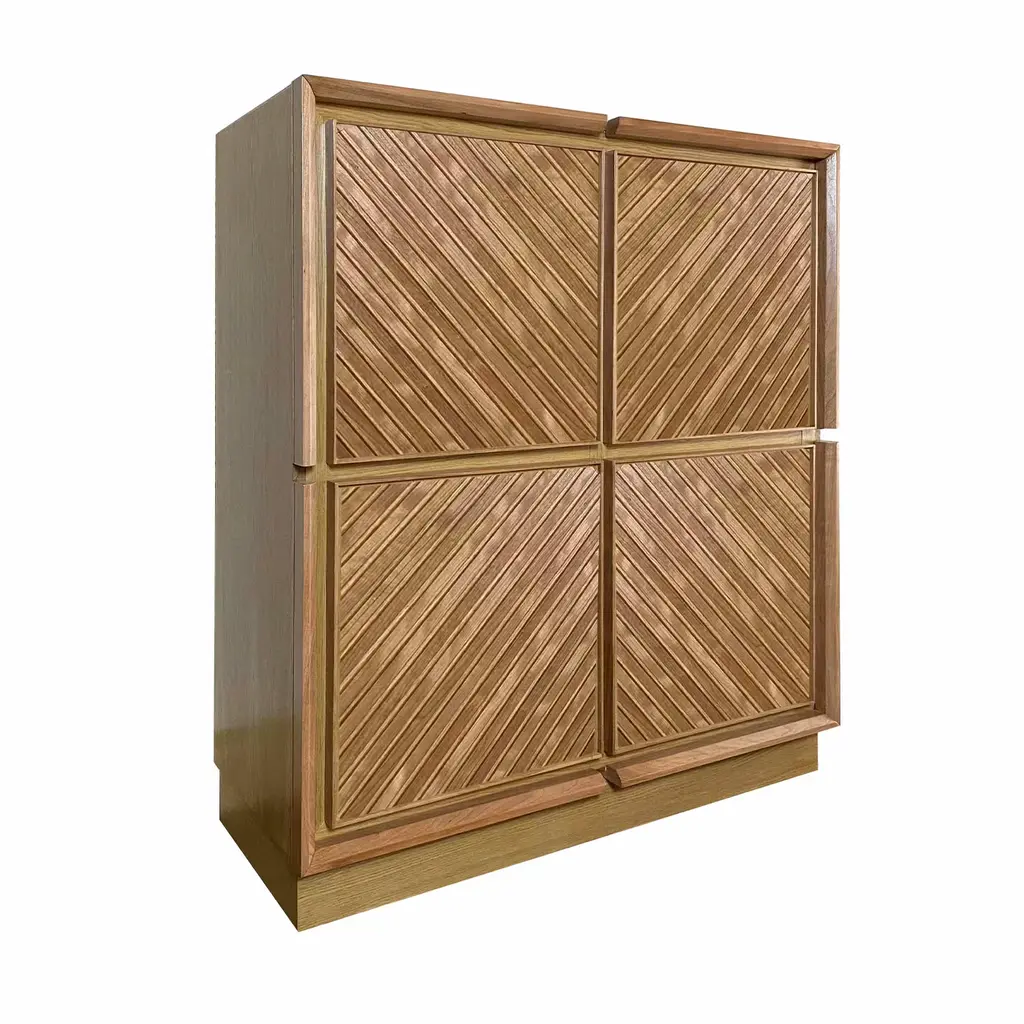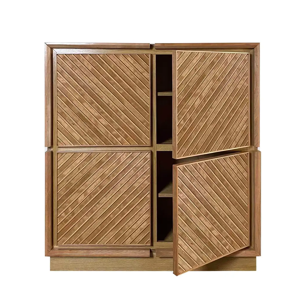 Brimming with sophisticated contemporary character, this exclusive sideboard is part of a 2022 Collection designed by Mascia Meccani. Minutely handmade of durmast wood finished in walnut and cherry essences, it features four doors with shelves enriched with concentric grooves in cherry wood. Please consult the Concierge for other available designs from this series.