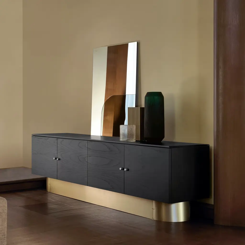 Square sideboard by Daytona has a structure in plywood with 10/10 ash interior and exterior, open pore matt black finish. Soft metal guides and hinges, base in curved lined with satin brass sheet. Equipped with 2 internal drawers upholstered in fabric, this creation will make every living-room unique. The top is available in wood finish and other types of marble.