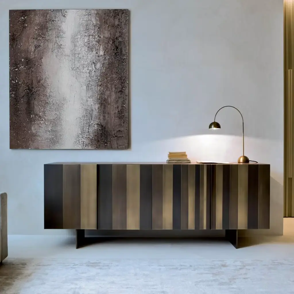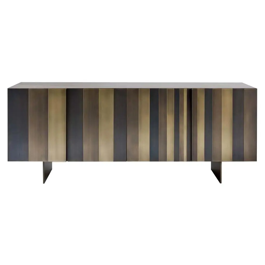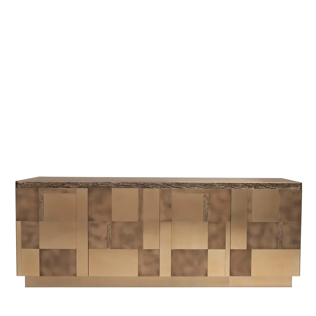 This horizontal sideboard sits atop thin yet sturdy legs and is equipped with four inner drawers. Its sides, doors and legs are covered in metal, while its interior and top have a walnut finish. Its top can also be covered in metal. The use of metal rectangles on its surface design create a striking effect.