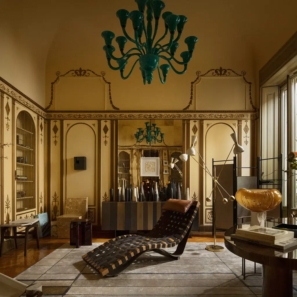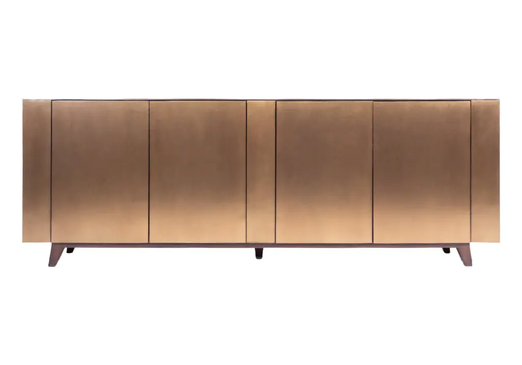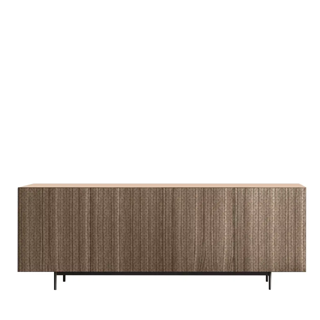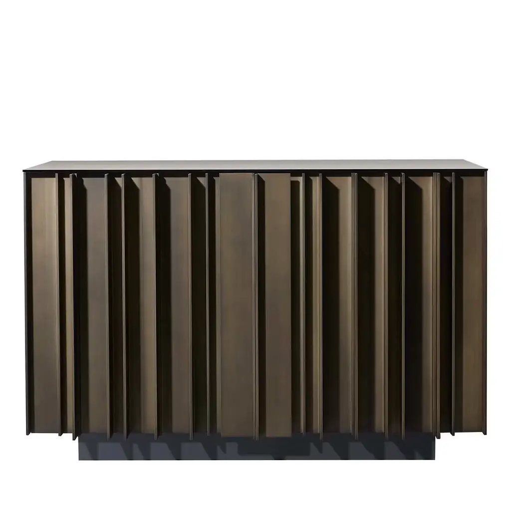 This horizontal sideboard sits atop thin yet sturdy legs and is equipped with four inner drawers. Its sides, doors and legs are covered in metal, while its interior and top have a walnut finish. Its top can also be covered in metal. The use of metal rectangles on its surface design create a striking effect.