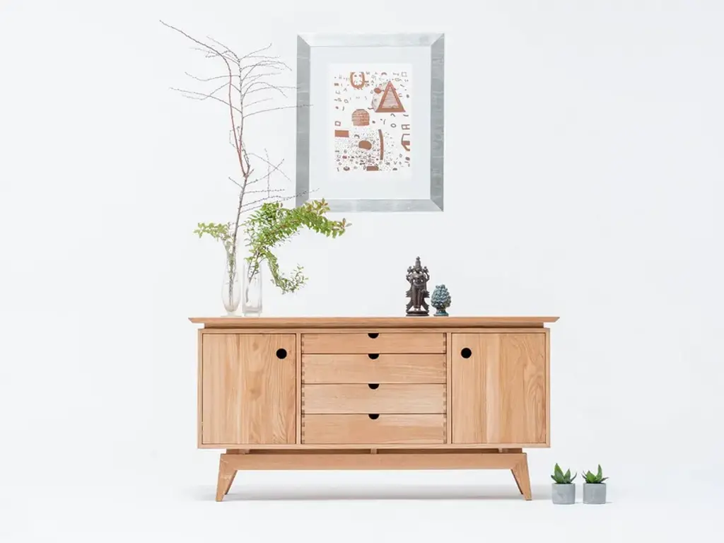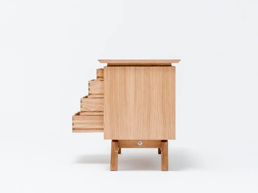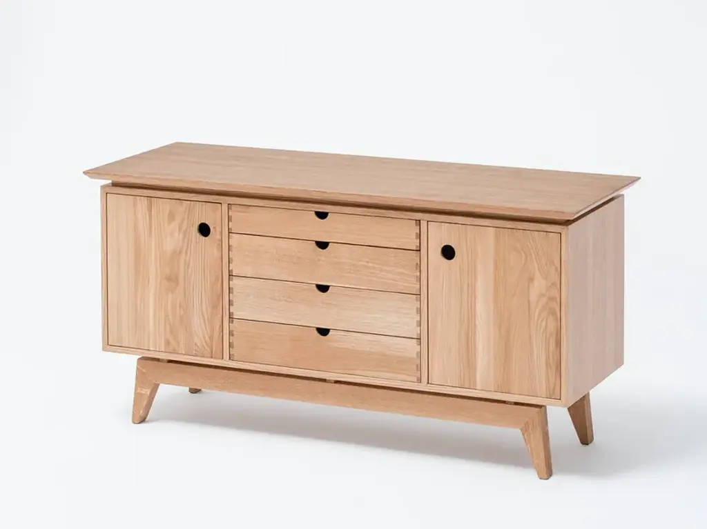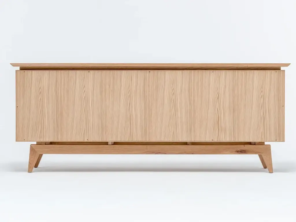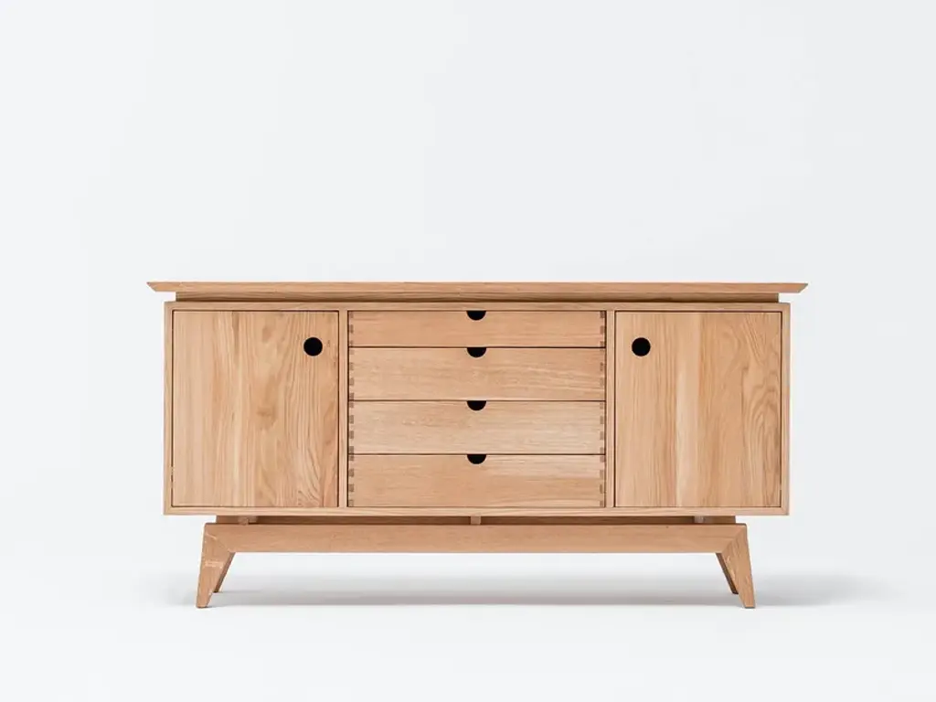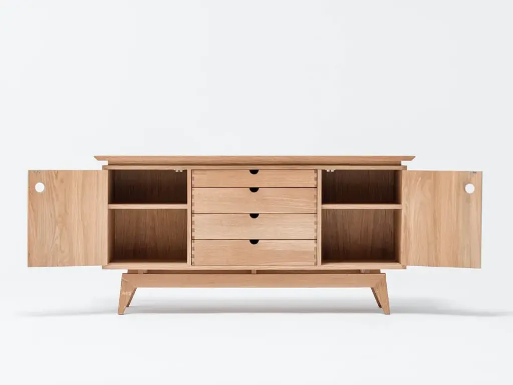 ST Sideboard is a masterpiece of craftsmanship. The high quality elements are made of solid wood. The carpenters’ classic joint “dove tail” was used to make the wooden drawers.The designer wanted to challenge the classic carpentry and create a timeless yet modern design with the use of traditional methods and joints. The ST Sideboard was rewarded with MUST HAVE by LDF.Material: Corpus 1.6 mm oak solid wood. Legs, doors, drawers oak solid wood. Finished with biological oil natural. Doors with hidden hinges.