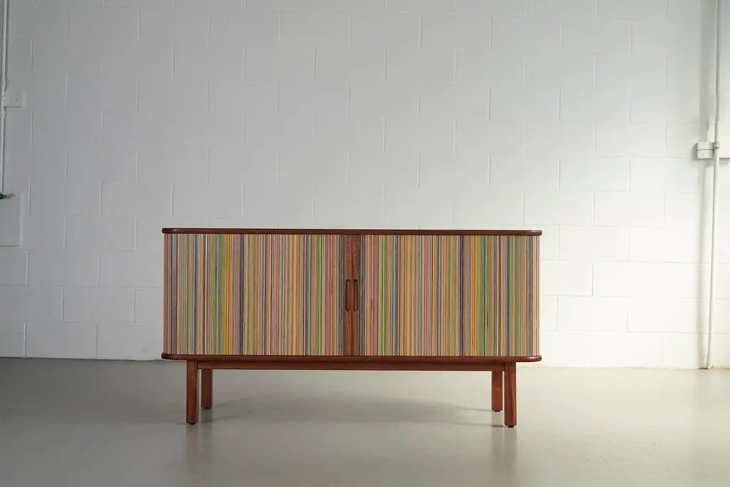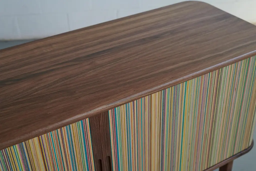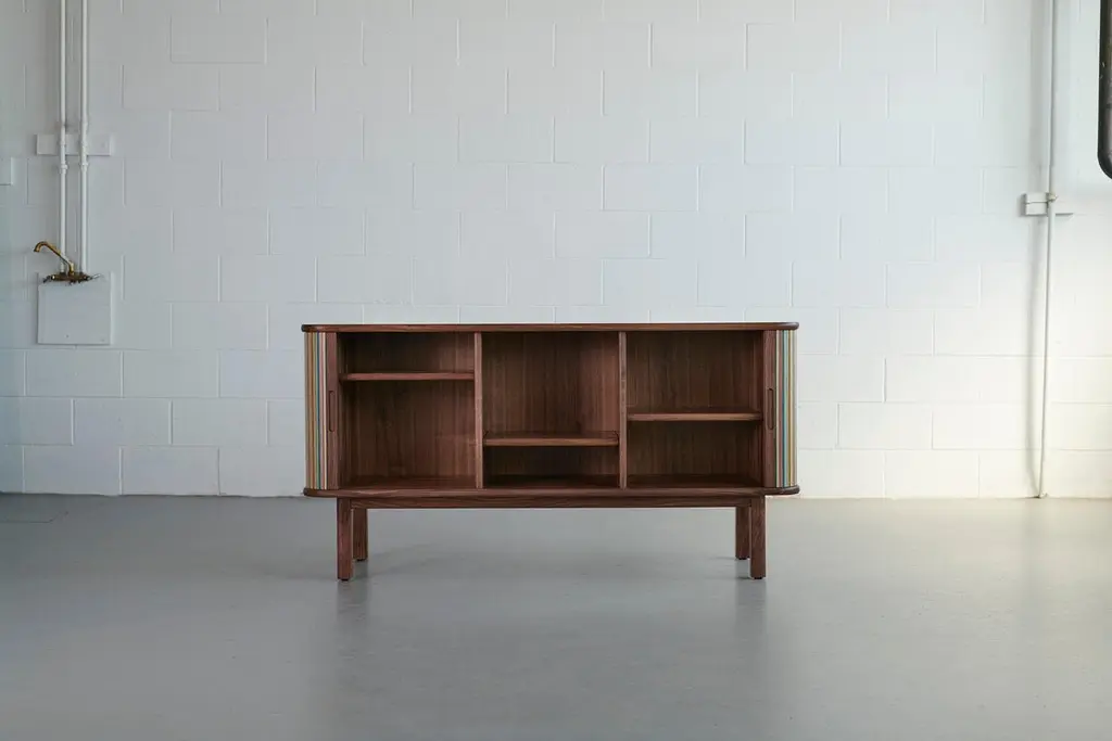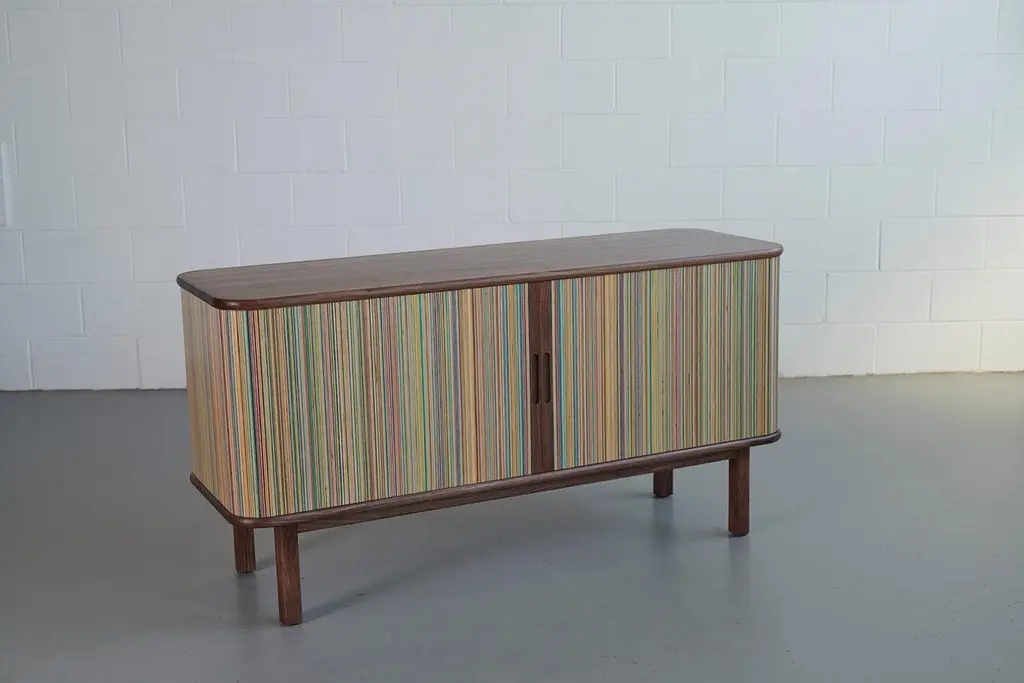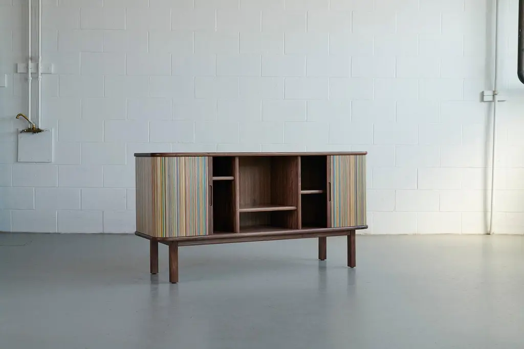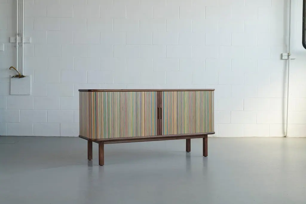 Our award winning Stackton credenza features sliding repurposed skateboard tambour doors and beautiful sapele wood. Reminiscent of Mid-century modern design, the classic design inspiration has been reimagined in a unique piece of colourful, yet elegant piece of highly functional furniture. This piece showcases the creativity and craftsmanship in repurposing skateboards, making it not only a highly functional storage solution, but also a conversation starter in any room.Measurements: Height: 31" Length: 59" Depth: 19" This listing is for Sapele wood (reddish brown) in the above dimensions. Walnut option is also available. Please see last 8 photos for walnut option. Customizable with sizes ranging in height, width and length (up to 80" long)Features three interior sections with adjustable shelves. Section measurements: Side sections: 16" (W) 18 1/2" (H) Centre section: 17" ( 18 1/2") Cable management customizations also available. Finished with a durable high quality polyurethane. Repurposing old, broken skateboards that are made from seven layers of vibrant maple wood, offers a unique opportunity to create stylish furniture and housewares. By creatively pushing the boundaries of this material, we not only give new life to discarded skateboards, but also contribute to an environmentally friendly approach to design, showcasing the beauty and durability of reclaimed wood in innovative ways.