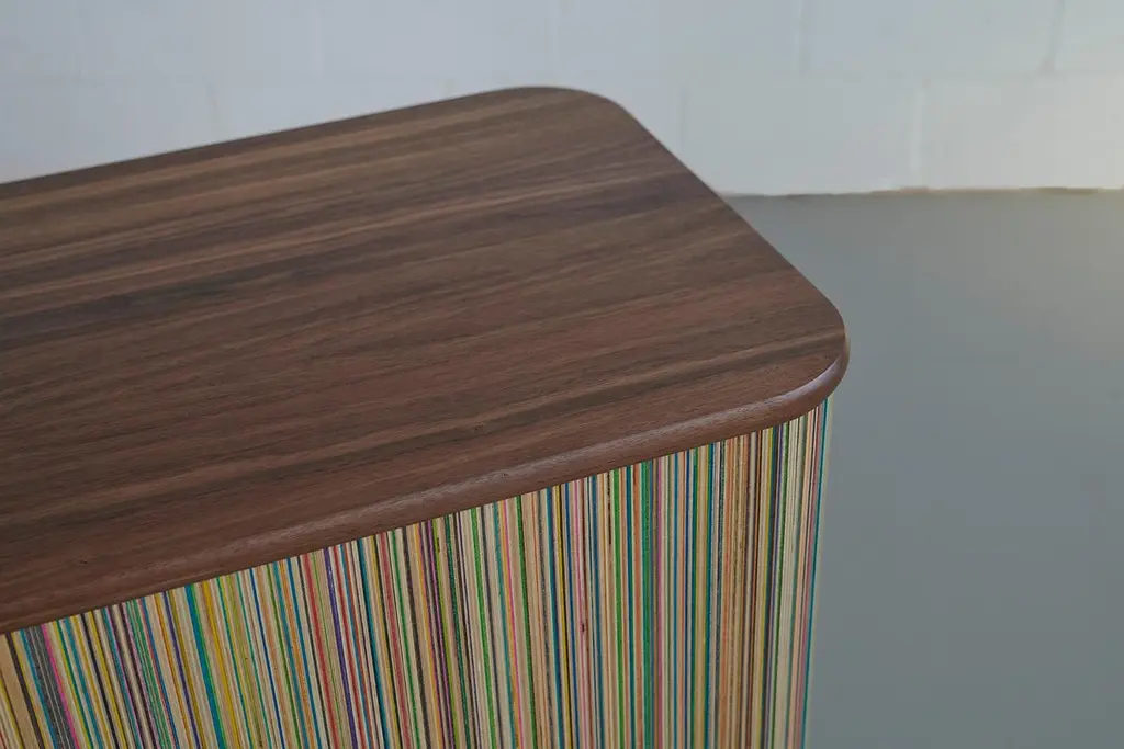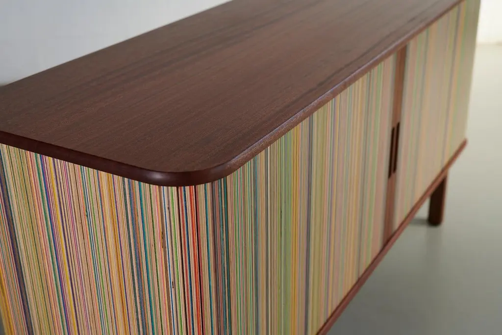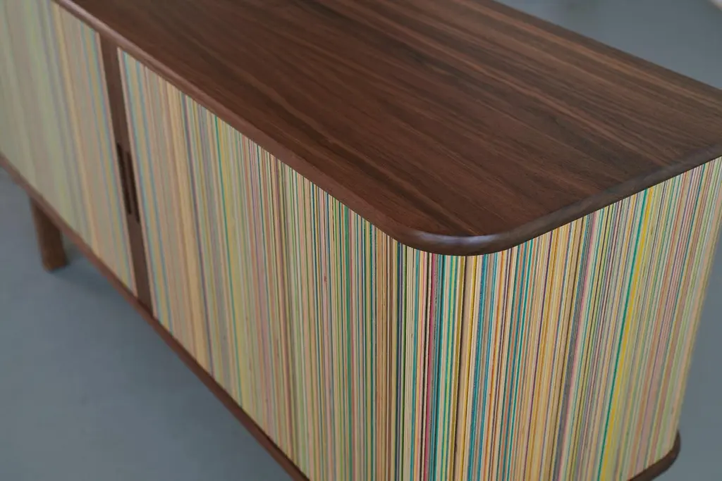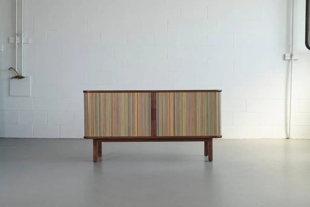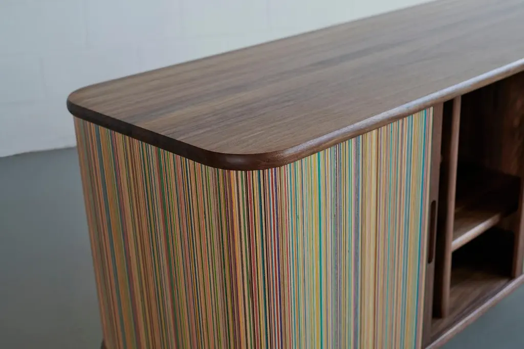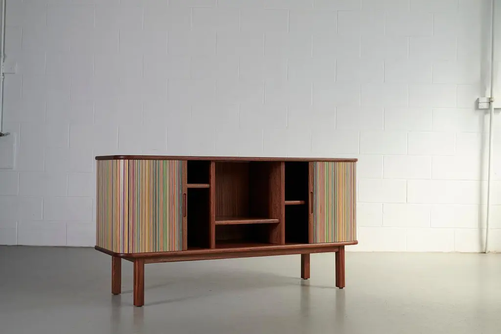 Our award winning Stackton credenza features sliding repurposed skateboard tambour doors and beautiful sapele wood. Reminiscent of Mid-century modern design, the classic design inspiration has been reimagined in a unique piece of colourful, yet elegant piece of highly functional furniture. This piece showcases the creativity and craftsmanship in repurposing skateboards, making it not only a highly functional storage solution, but also a conversation starter in any room.Measurements: Height: 31" Length: 59" Depth: 19" This listing is for Sapele wood (reddish brown) in the above dimensions. Walnut option is also available. Please see last 8 photos for walnut option. Customizable with sizes ranging in height, width and length (up to 80" long)Features three interior sections with adjustable shelves. Section measurements: Side sections: 16" (W) 18 1/2" (H) Centre section: 17" ( 18 1/2") Cable management customizations also available. Finished with a durable high quality polyurethane. Repurposing old, broken skateboards that are made from seven layers of vibrant maple wood, offers a unique opportunity to create stylish furniture and housewares. By creatively pushing the boundaries of this material, we not only give new life to discarded skateboards, but also contribute to an environmentally friendly approach to design, showcasing the beauty and durability of reclaimed wood in innovative ways.