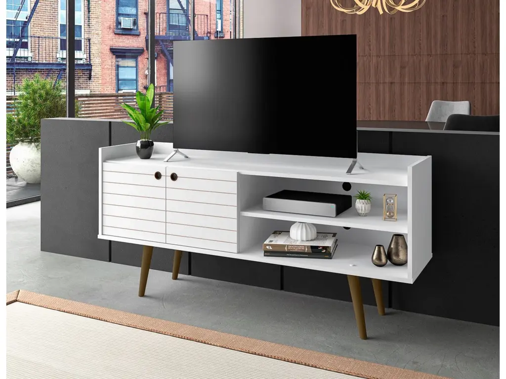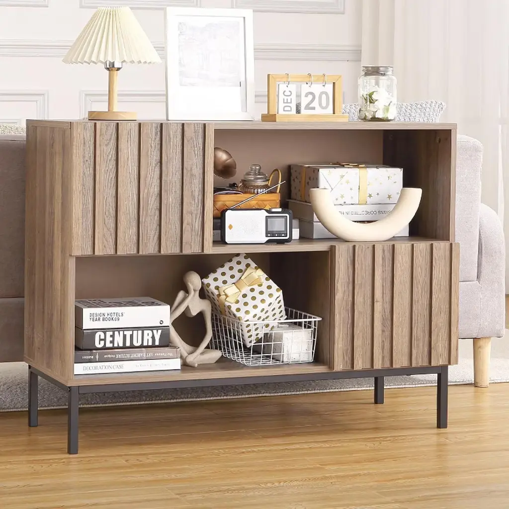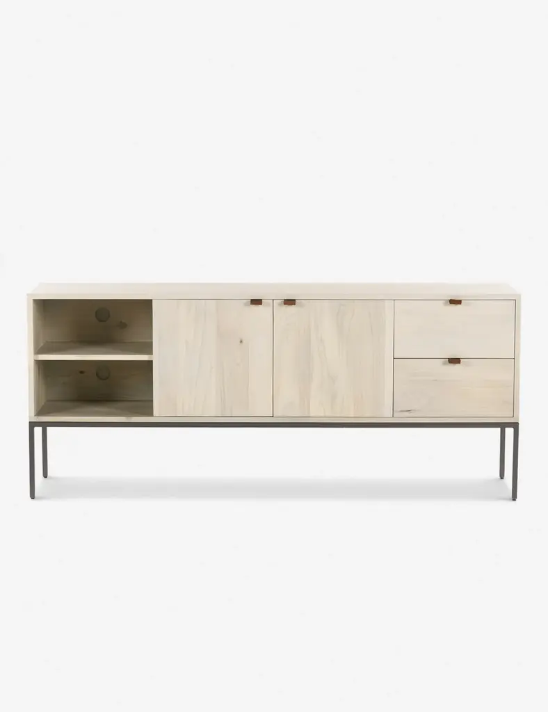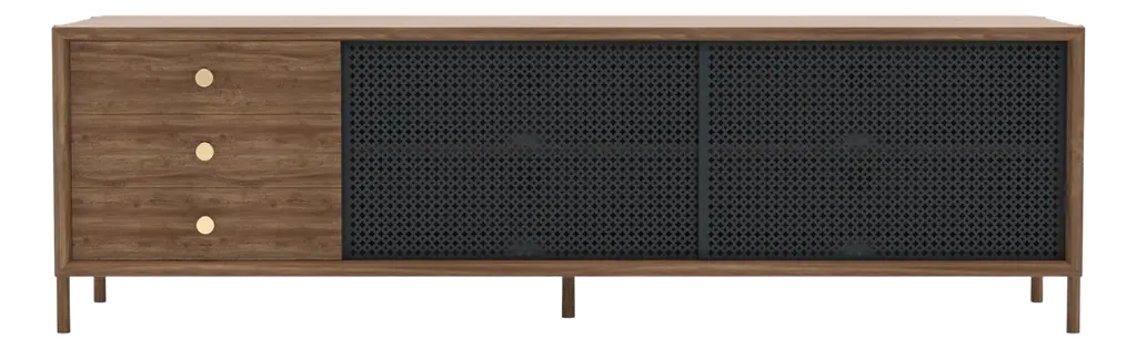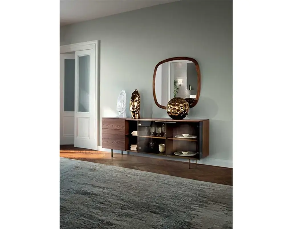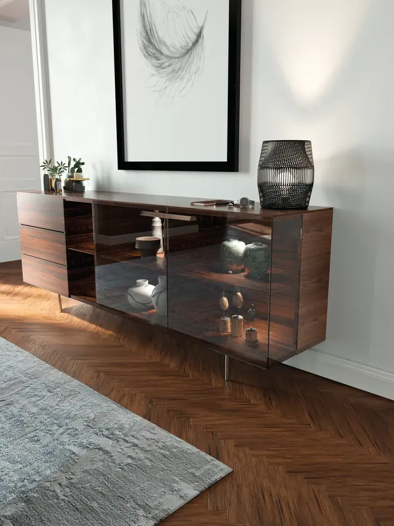 STAR is a living room sideboard that steals the spotlight — a masterpiece of balance between the transparency of glass and the warmth of wood.Its canaletto walnut structure rests lightly on a brass-painted metal base, matching the handles.The drawers conceal your belongings from view, while the open compartment and glass shelves showcase what you love to display — all combined in a harmonious mix that recalls the classic sideboards of the past, now reimagined with a modern and elegant twist.The standout feature is a special angled-opening hinge on the right door, a refined detail that surprises and elevates the piece as a true focal point in the living room.Sideboard with canaletto walnut veneered structure.Drawers, open compartment with glass shelf, and storage compartment with canaletto walnut veneered shelves.Glass doors. The right door features a special angled-opening hinge. Handles and base in brass-painted metal.