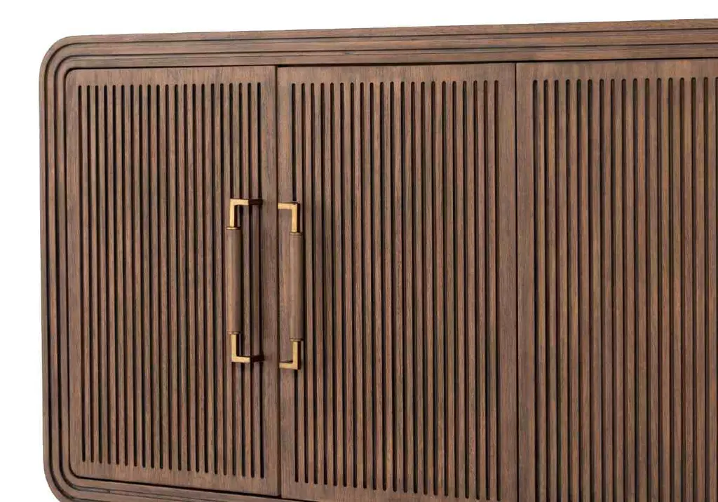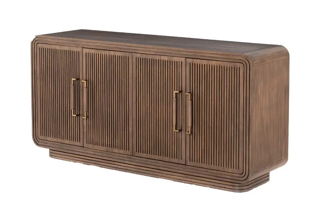 The Stark boasts an incredibly textured design with its ribbed cabinets beautifully contrasted by a smooth top and sides. Dual interior shelves provide ample hidden storage, complimented by elongated brass pulls. Its curved form styles well into offices and living rooms.