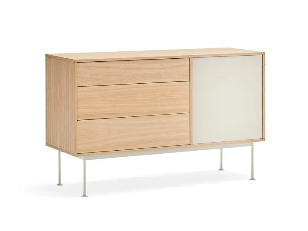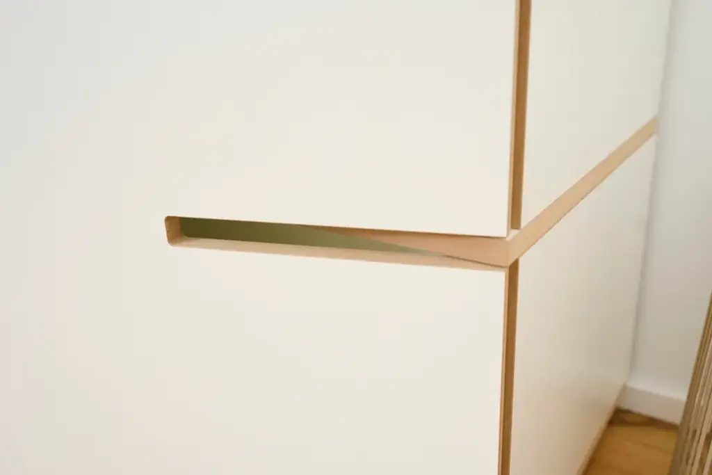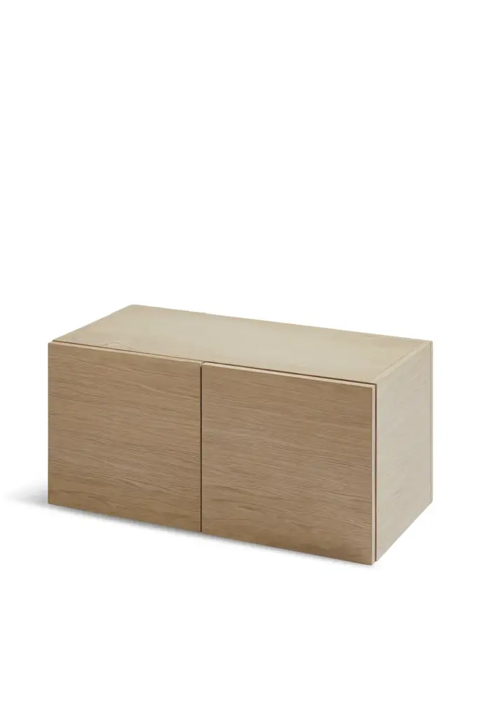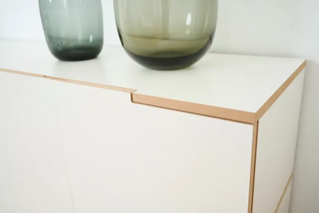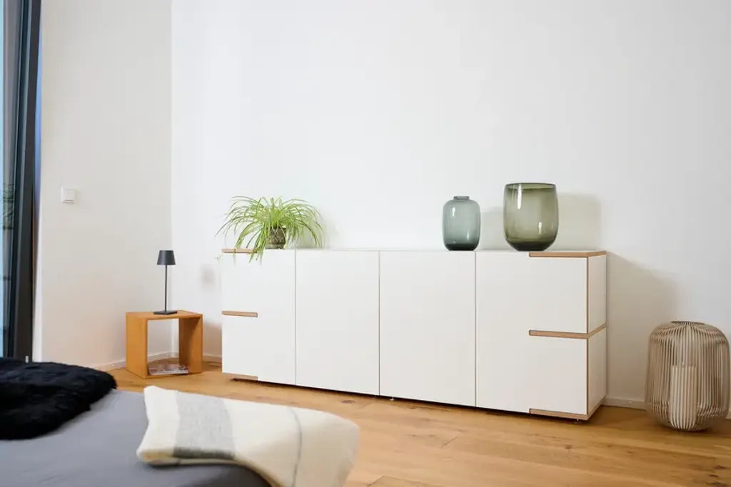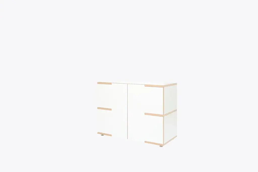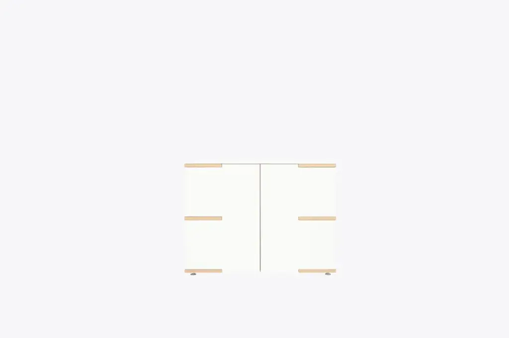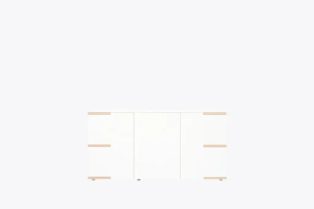 Stau is a puristic sideboard. It will be available in three different sizes and finds its individual use through this diversity. There are three different widths in 3 height variants each to choose from. Tojo-stau is perfect for any move and becomes a long-lasting companion - whether in the living room, dining room or study. The doors can be opened by a recessed handle at the top which supports the reduced look. The sides and outer doors are visually broken by the shelves and illustrate the shelf heights, which are also suitable for file folders. As flat-pack furniture and component-optimized, the carcass can be assembled and disassembled by one person without tools. Only for the fastening of the hinges a tool insert is necessary.