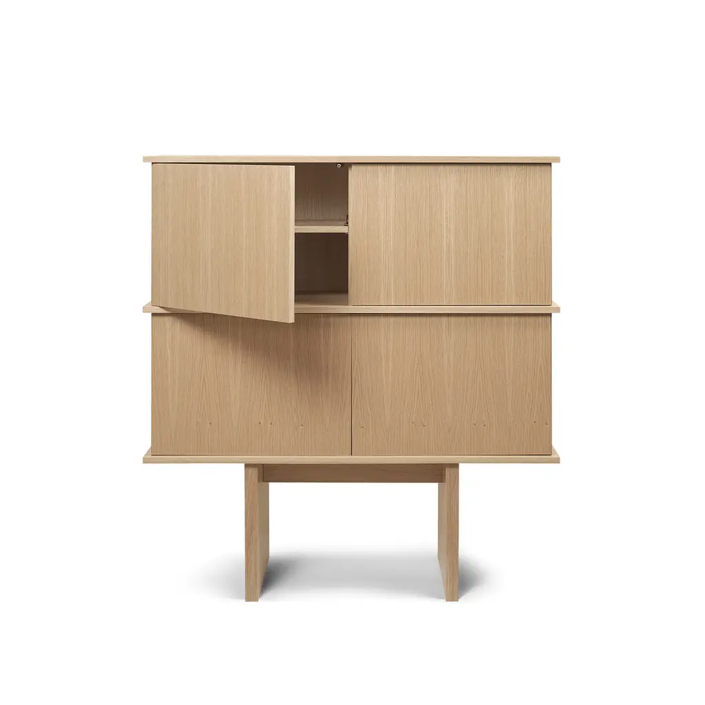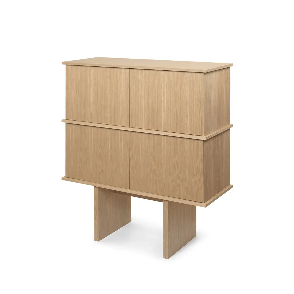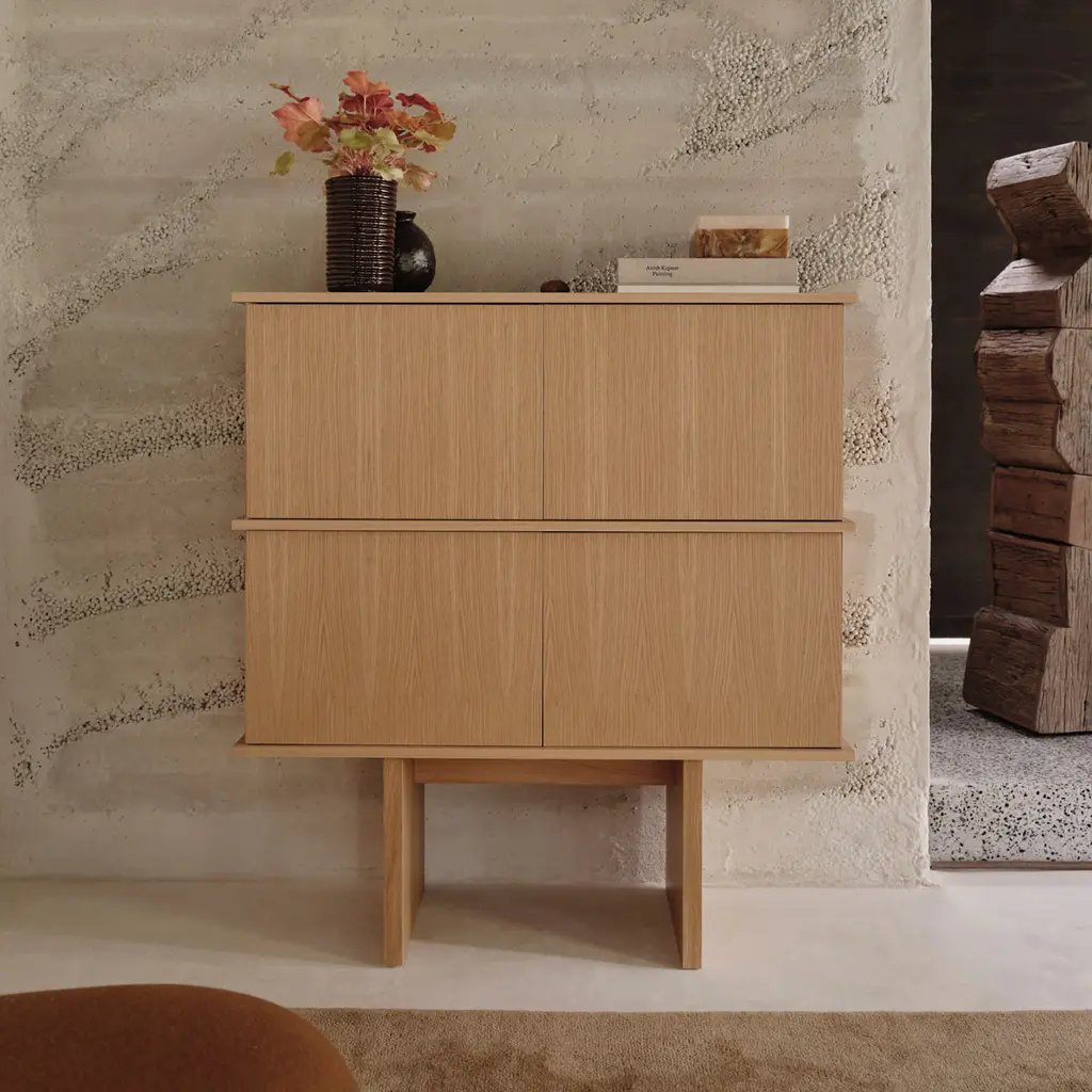 Offering extra storage but the same elegant minimalist design as the single version, the Ferm Living Stilt Sideboard Double enhances any décor while helping you unclutter your home. The design draws inspiration from the pillars that elevate coastal buildings above the water, featuring wide legs that look slim and dainty when admired from the front. The cabinets offer generous storage spaces with separate shelves that make organizing a variety of items as easy as possible. For example, you can use the Ferm Living Stilt Sideboard Double to store anything from bedding and towels in a bedroom to plates and glassware in a dining room or books, magazines and gadgets in a living room. Referencing the concept of apricity, or the “warmth of the sun in winter”, this sideboard is made with a light oak veneer that boasts a beautiful texture with vertical lines. Every Ferm Living Stilt Sideboard Double comes with a bracket for easy wall-mounting that keeps the cabinet firmly in place.