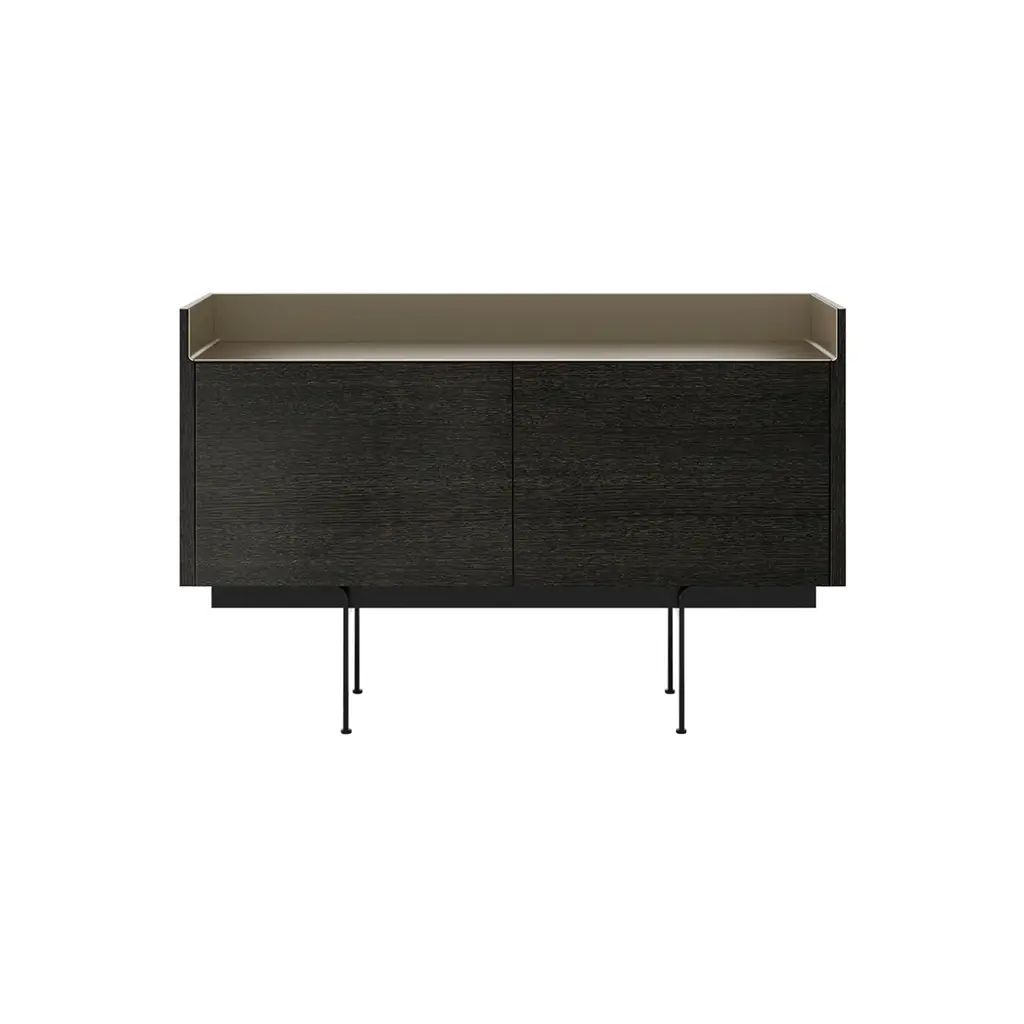 In the compact 2-door Stockholm Sideboard, like its larger sister versions, designer Mario Ruiz for Punt offers a clean-lined storage solution in a contrast of rich oak or walnut veneer with the collection’s signature gleaming metallic top in a choice of anodized aluminum hues. The sleek, flush-front cabinet features a height-adjustable shelf in each interior compartment as well as optional cable management and it sits on a plinth-style metal base in black or bronze.