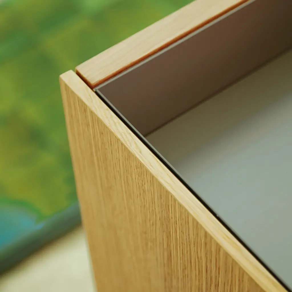 In the compact 2-door Stockholm Sideboard, like its larger sister versions, designer Mario Ruiz for Punt offers a clean-lined storage solution in a contrast of rich oak or walnut veneer with the collection’s signature gleaming metallic top in a choice of anodized aluminum hues. The sleek, flush-front cabinet features a height-adjustable shelf in each interior compartment as well as optional cable management and it sits on a plinth-style metal base in black or bronze.