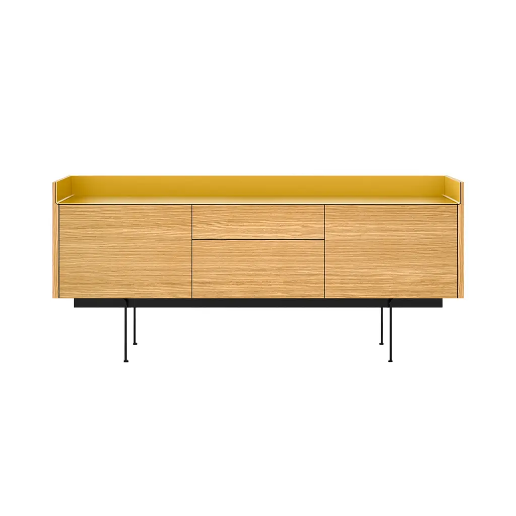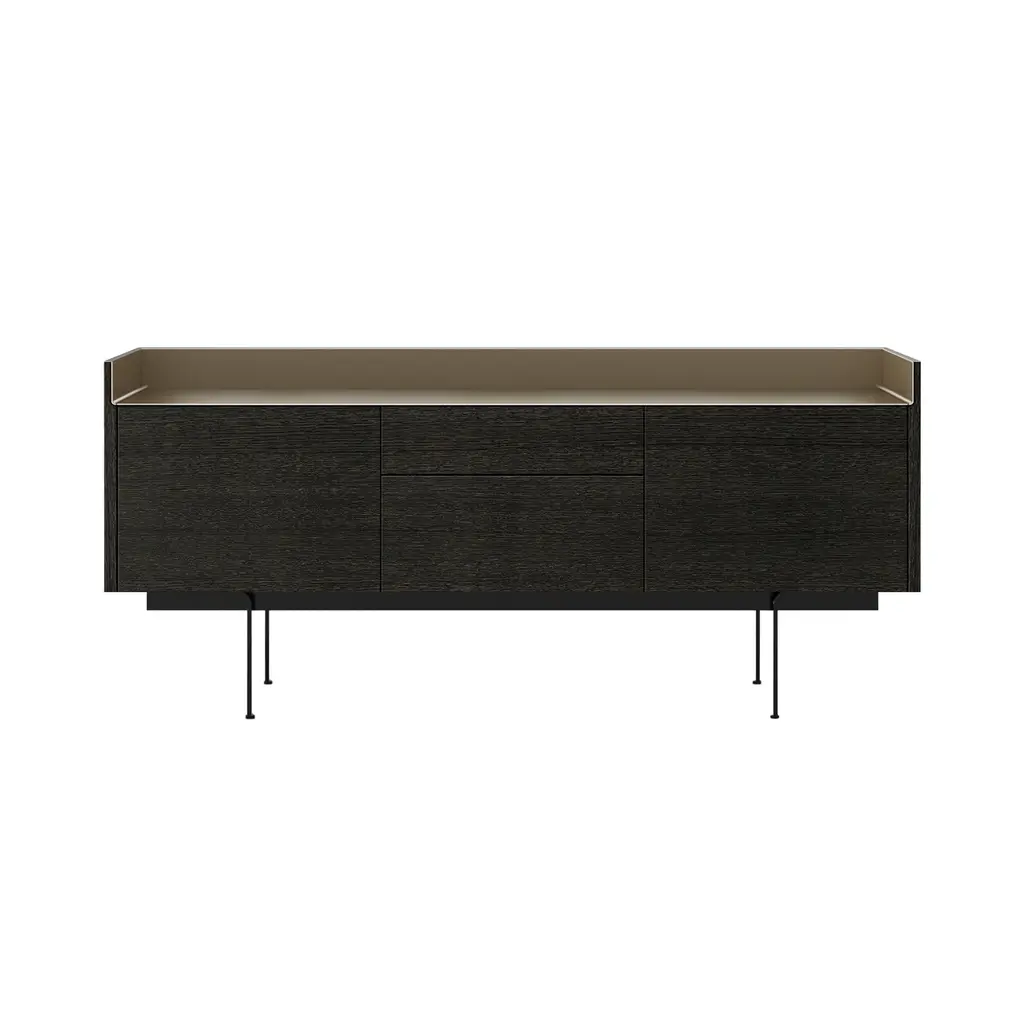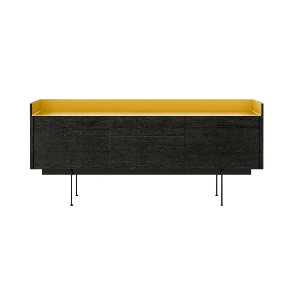 The STH302 Sideboard is a refined storage piece featuring two doors and two drawers, all handle-free for a sleek appearance. Inside, adjustable shelves provide customizable storage. An anodized aluminum top adds sophistication, available in 5 finishes. The sideboard stands on powder-coated steel legs with adjustable feet for stability. This design exemplifies a harmonious blend of aesthetics and practicality.
