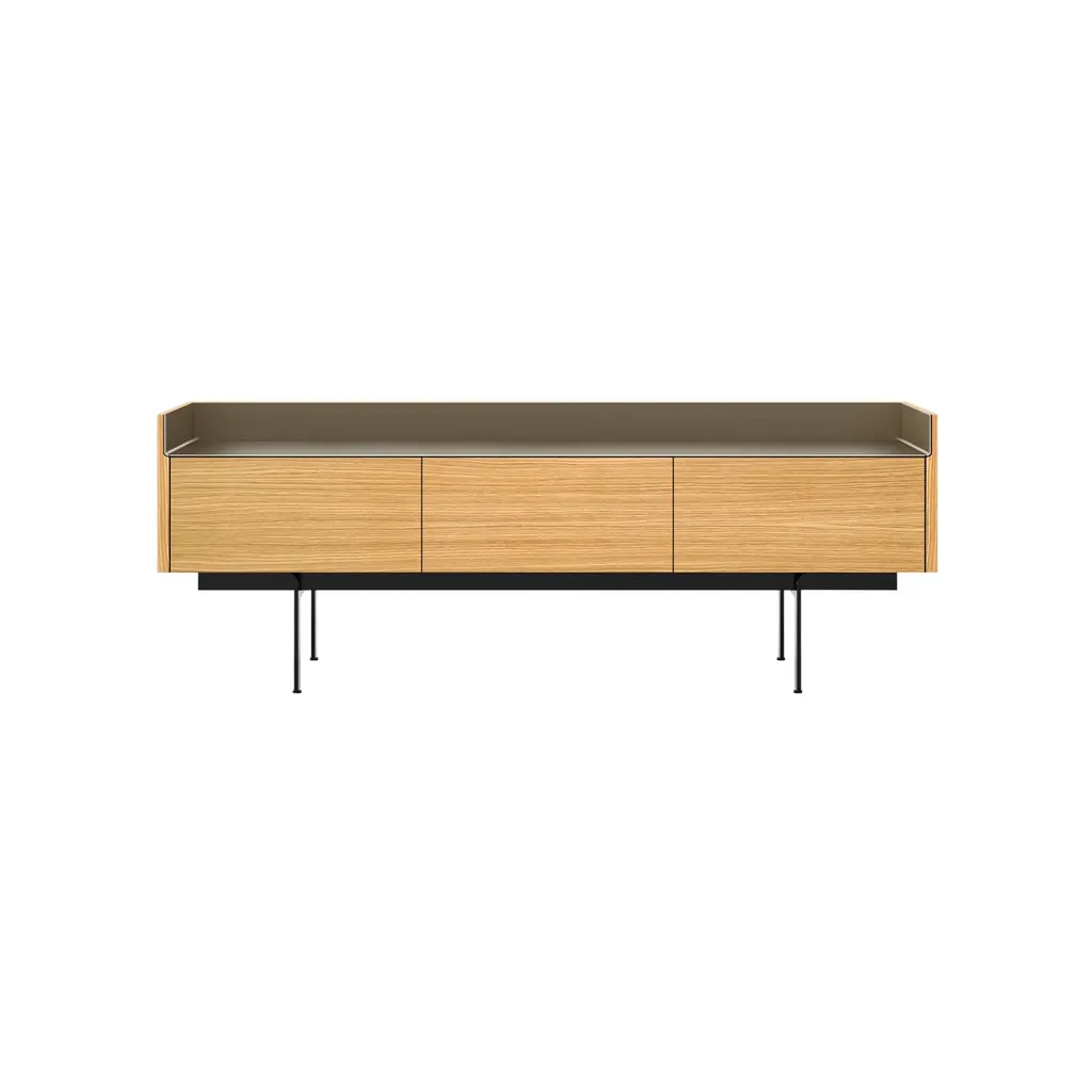 Three drop-down solid doors give a smooth look to Punt’s mid-size version of Stockholm Slim, with its lower TV-friendly height and triple storage compartments, each with a height-adjustable shelf. Designer Mario Ruiz appoints his crisply proportioned sideboard in oak or walnut veneer with a slender metal base and the series' signature aluminum top.