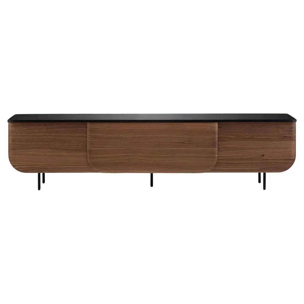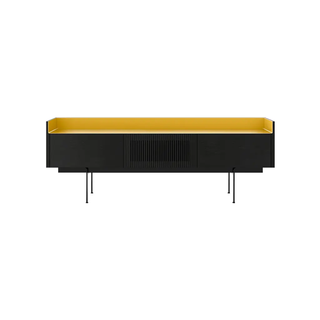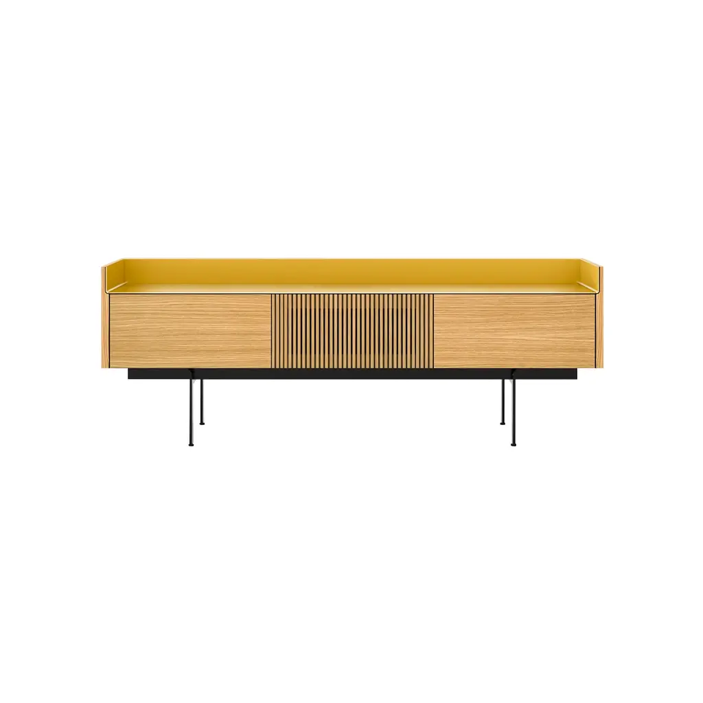 In a slenderized offshoot, designer Mario Ruiz’ Stockholm Slim collection adds a midsize version with a center drop-down slatted TV door and solid counterparts at the outside, each camouflaging a height-adjustable shelf and interior cable management. Paired with the signature aluminum top in a range of lustrous shades, Punt’s sleek cabinet comes in various oak or walnut finishes and is set on a metal base with an epoxy powder coat.