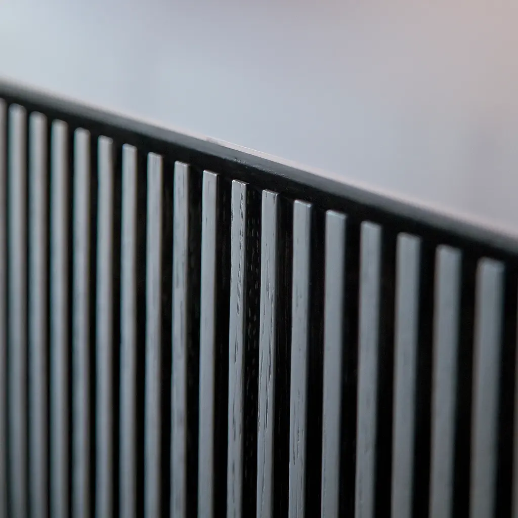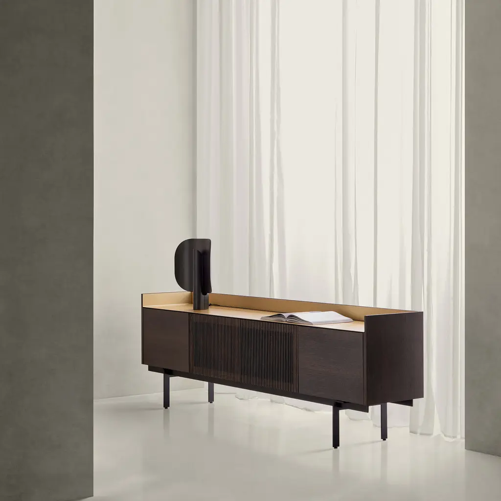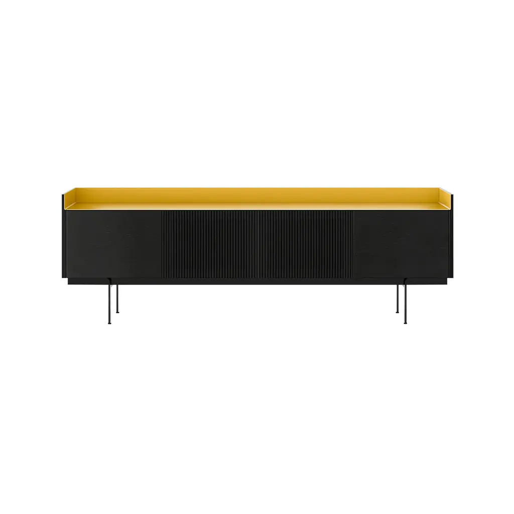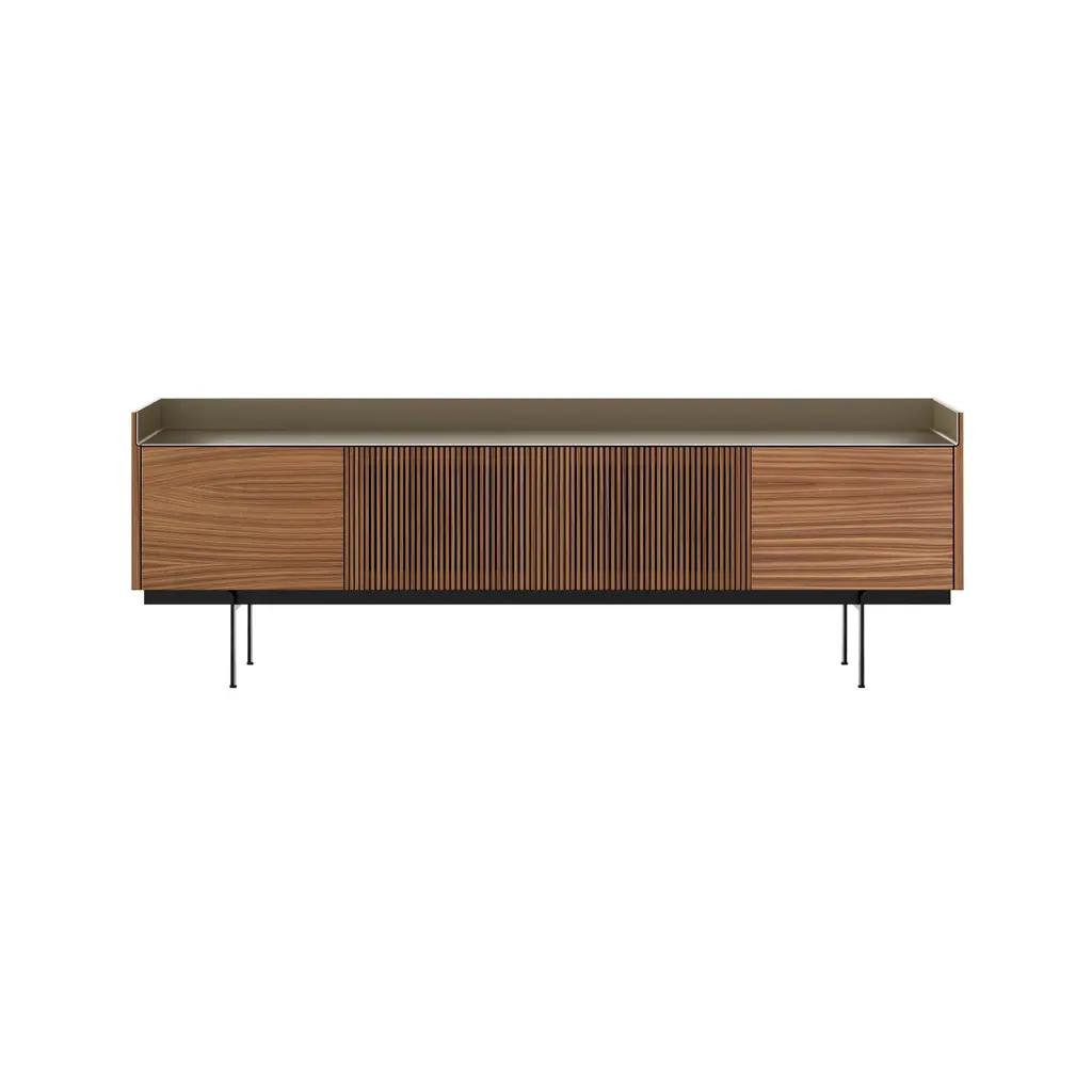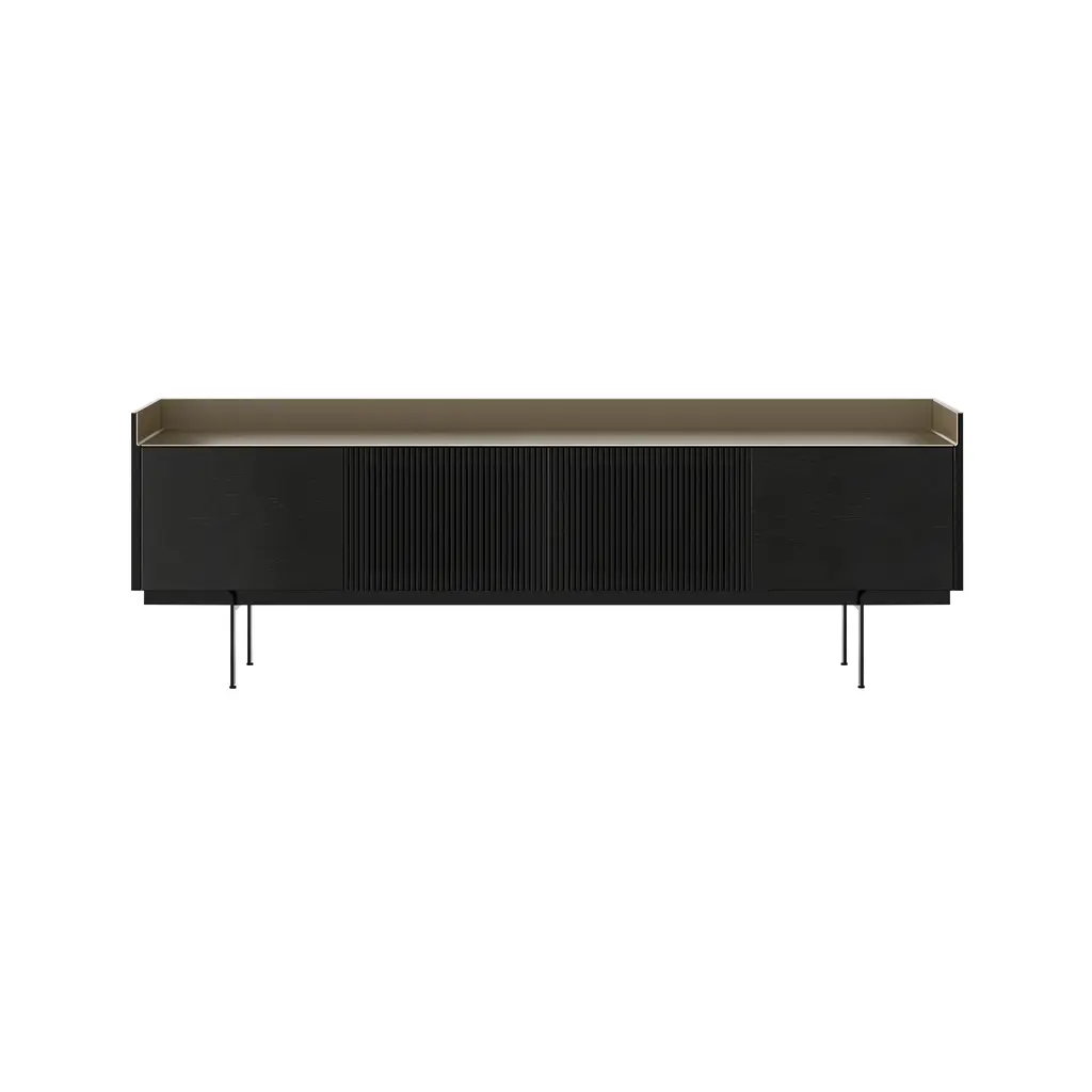 Behind 4 slatted TV doors, this version of Stockholm Technic reveals a number of storage compartments with adjustable shelves as well as cable management and rear plug access. Designer Mario Ruiz’ sleek sideboard offers a range of fine oak and walnut veneer finishes, topped with the series’ lustrous aluminum top surface and situated on a slender metal base.