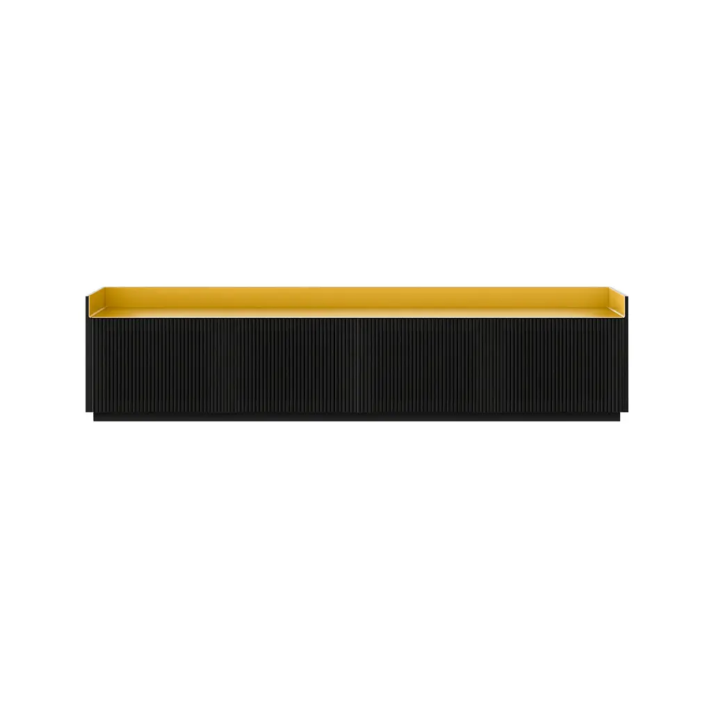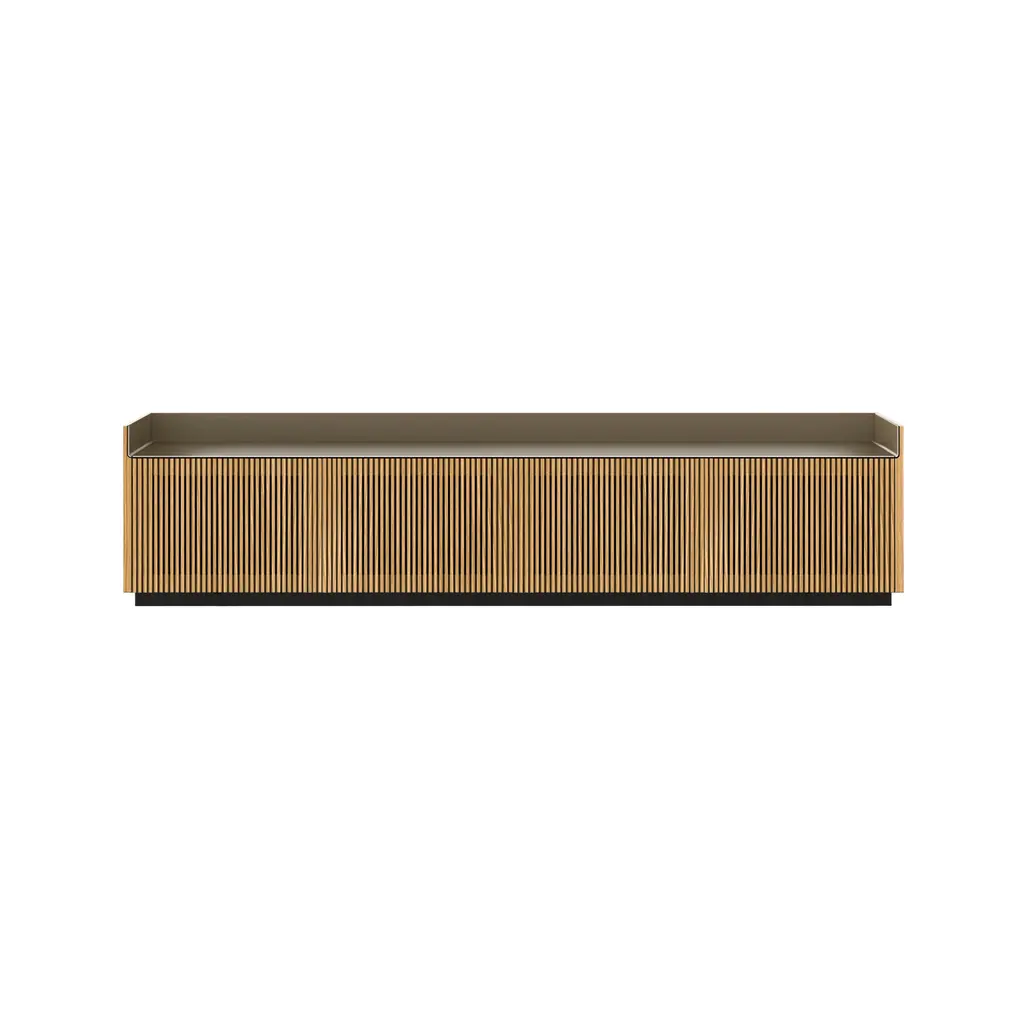 With a unified facade of 4 TV doors with open slats opening to separate compartments, this Stockholm Technic Sideboard brings generous storage space and entertainment-friendly cable management and rear plug access. The cabinet’s range of oak and walnut veneer finishes is topped by a lustrous aluminum top surface and sits on a slender metal base.