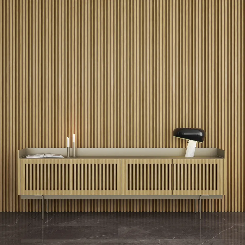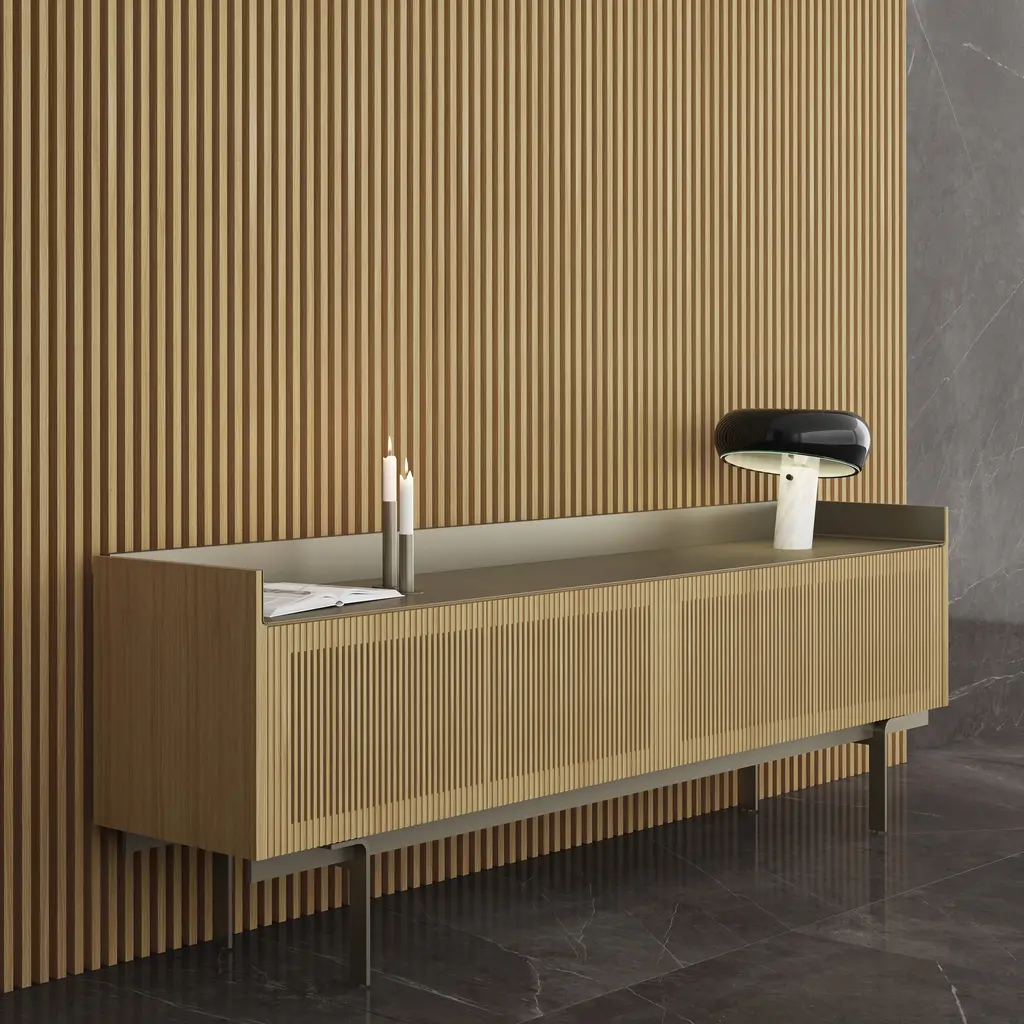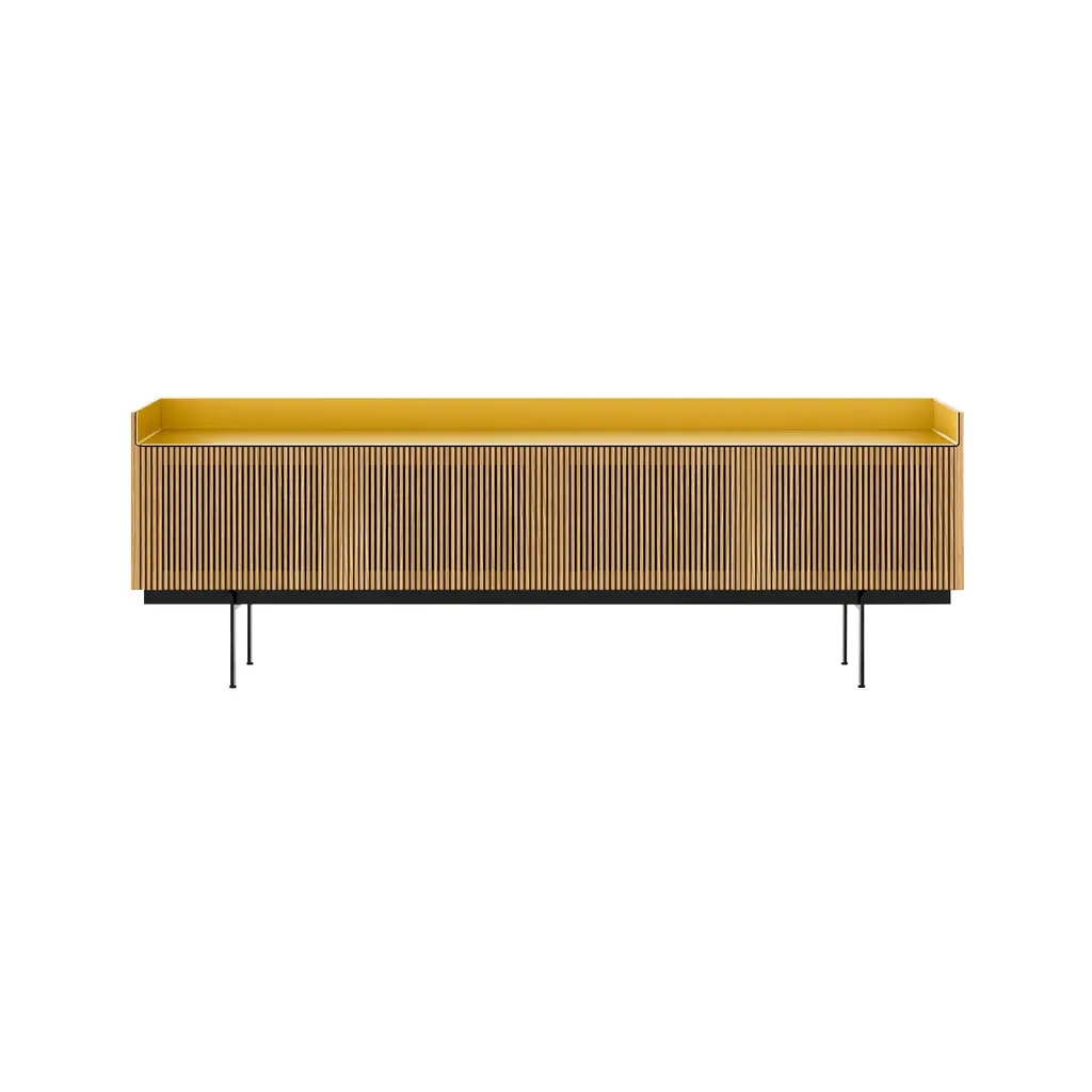 With a unified facade of 4 TV doors with open slats opening to separate compartments, this Stockholm Technic Sideboard brings generous storage space and entertainment-friendly cable management and rear plug access. The cabinet’s range of oak and walnut veneer finishes is topped by a lustrous aluminum top surface and sits on a slender metal base.