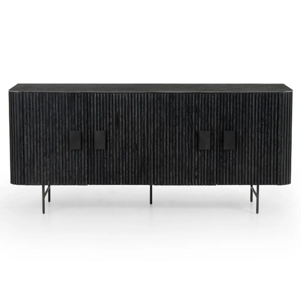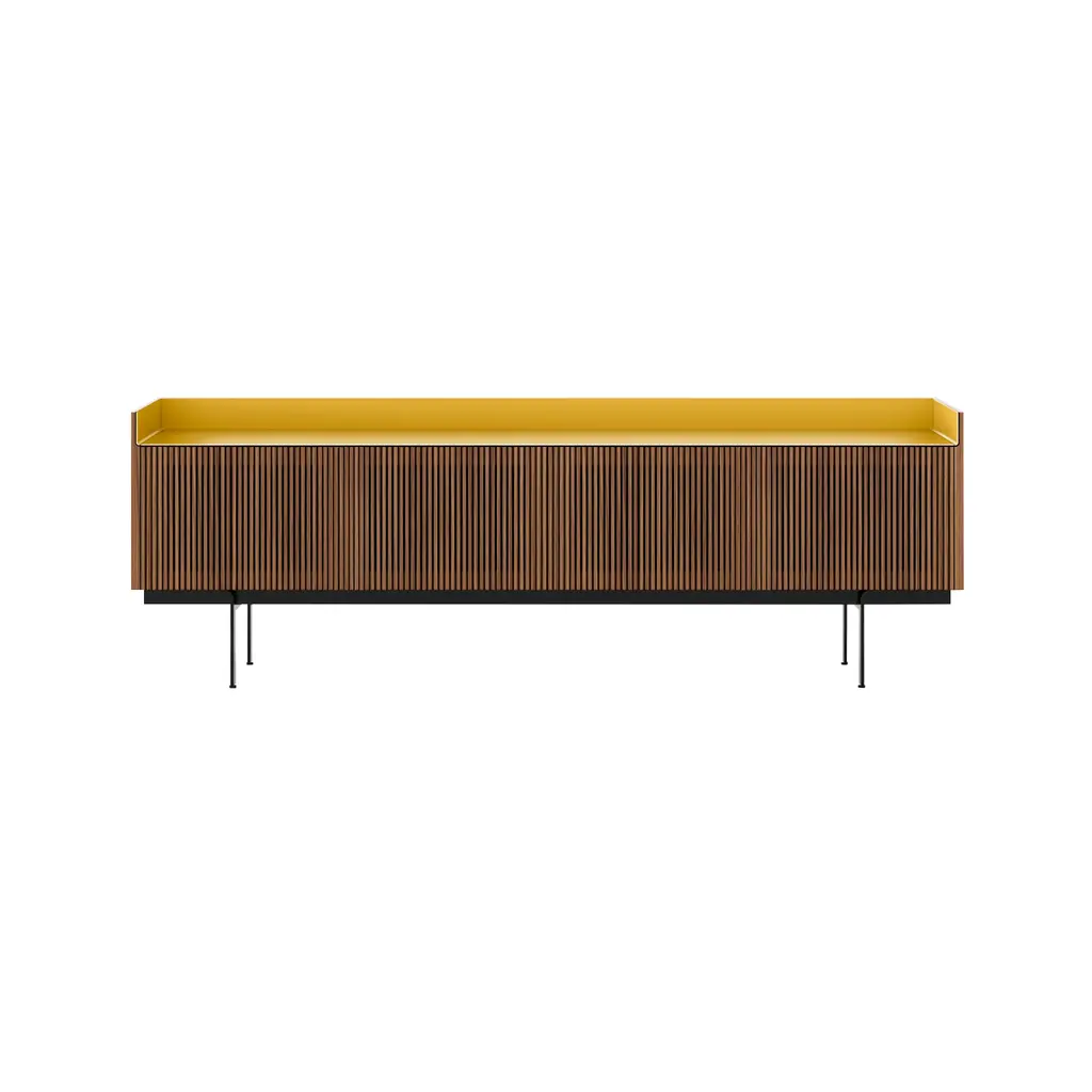With a unified facade of 4 TV doors with open slats opening to separate compartments, this Stockholm Technic Sideboard brings generous storage space and entertainment-friendly cable management and rear plug access. The cabinet’s range of oak and walnut veneer finishes is topped by a lustrous aluminum top surface and sits on a slender metal base.