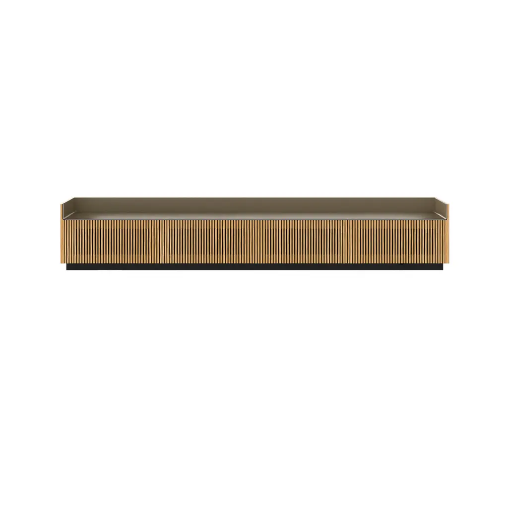With well-balanced, most generous dimensions, a flatscreen-friendly height and cable management, this version of Stockholm Slim also boasts a storage compartment with a height-adjustable shelf behind each of the 4 drop-down doors with slatted fronts. Designer Mario Ruiz’ signature flourish comes in the anodized aluminum top in one of several metallic hues that makes an intriguing complement to the clean-lined cabinetry in oak or walnut veneer finishes—the sideboard resting on a plinth-style metal base in epoxy bronze or black powder coat.