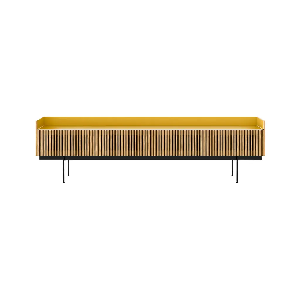 With well-balanced, most generous dimensions, a flatscreen-friendly height and cable management, this version of Stockholm Slim also boasts a storage compartment with a height-adjustable shelf behind each of the 4 drop-down doors with slatted fronts. Designer Mario Ruiz’ signature flourish comes in the anodized aluminum top in one of several metallic hues that makes an intriguing complement to the clean-lined cabinetry in oak or walnut veneer finishes—the sideboard resting on a plinth-style metal base in epoxy bronze or black powder coat.