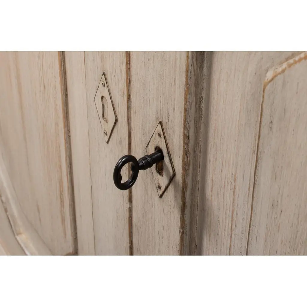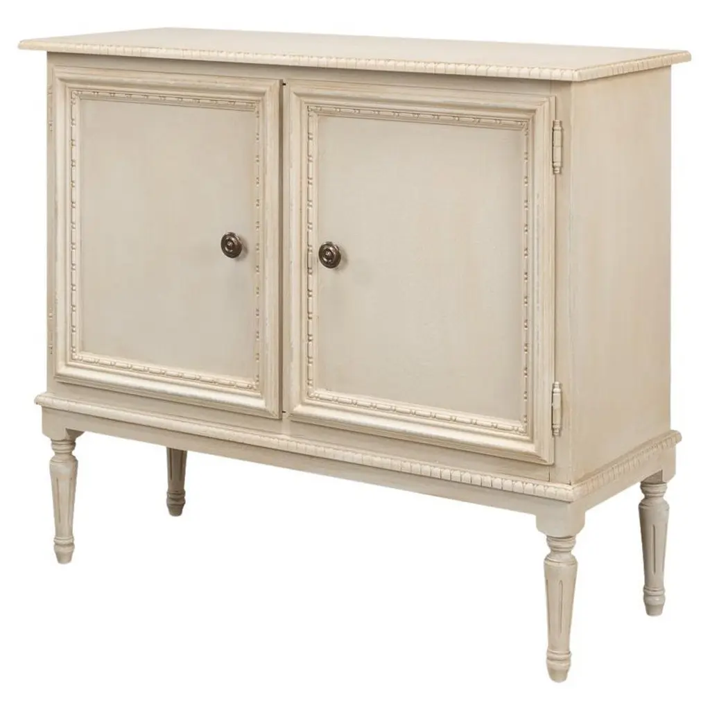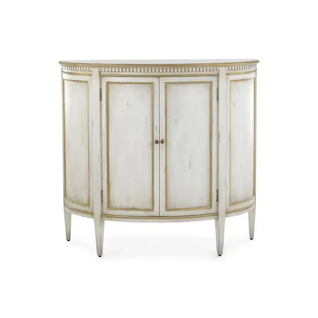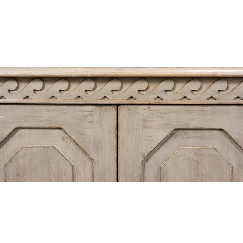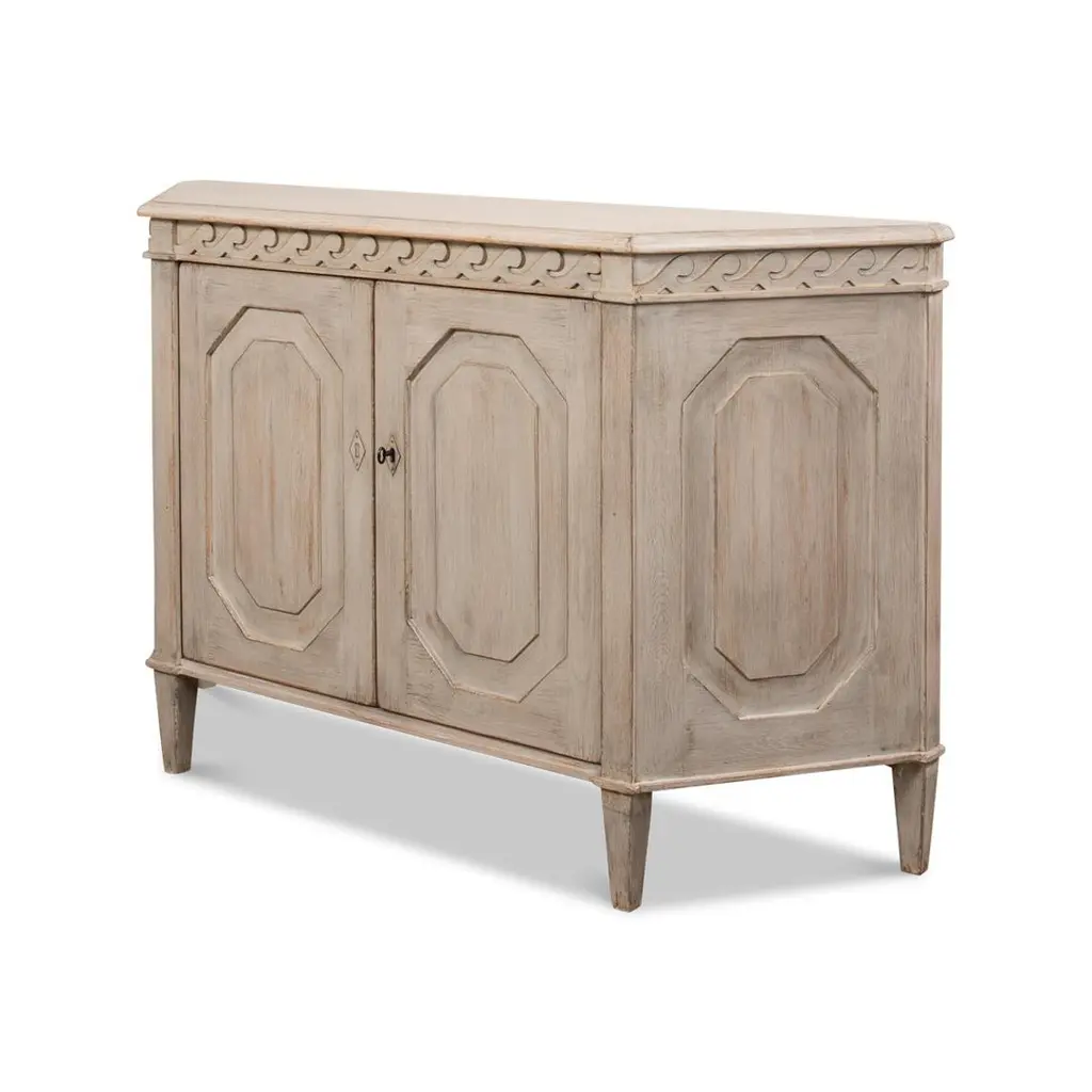 Finished in an exquisite hand-rubbed Stone Grey finish, is a statement of timeless elegance. Crafted from reclaimed pine, this sophisticated piece features canted ends and intricate Vitruvian scrolls, adding a refined architectural element to any interior.With ample storage behind two central cupboard doors. Raised on square tapered legs, it exudes a delicate balance of strength and grace. Dimensions: 58" W x 16" D x 36" H