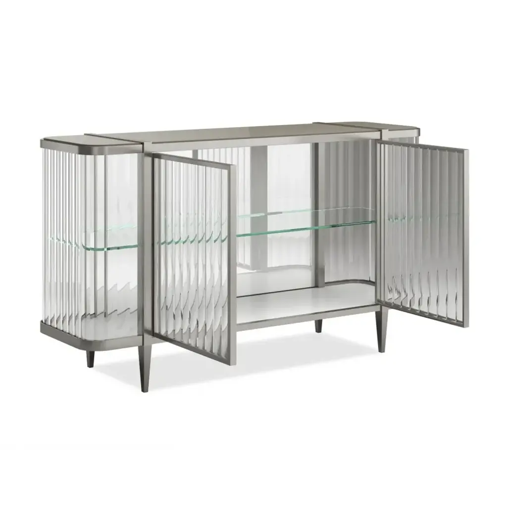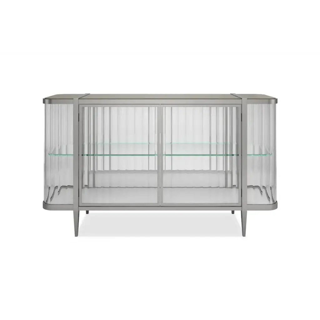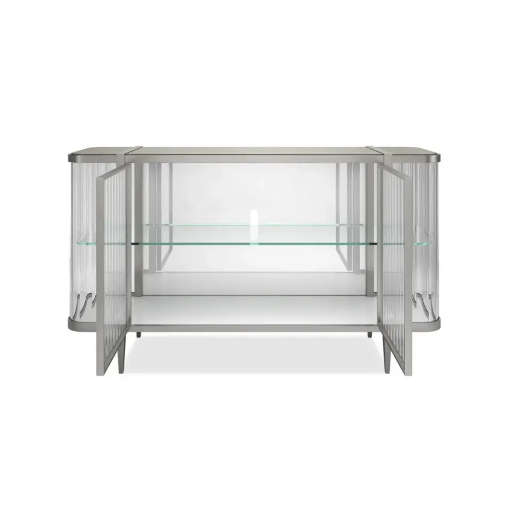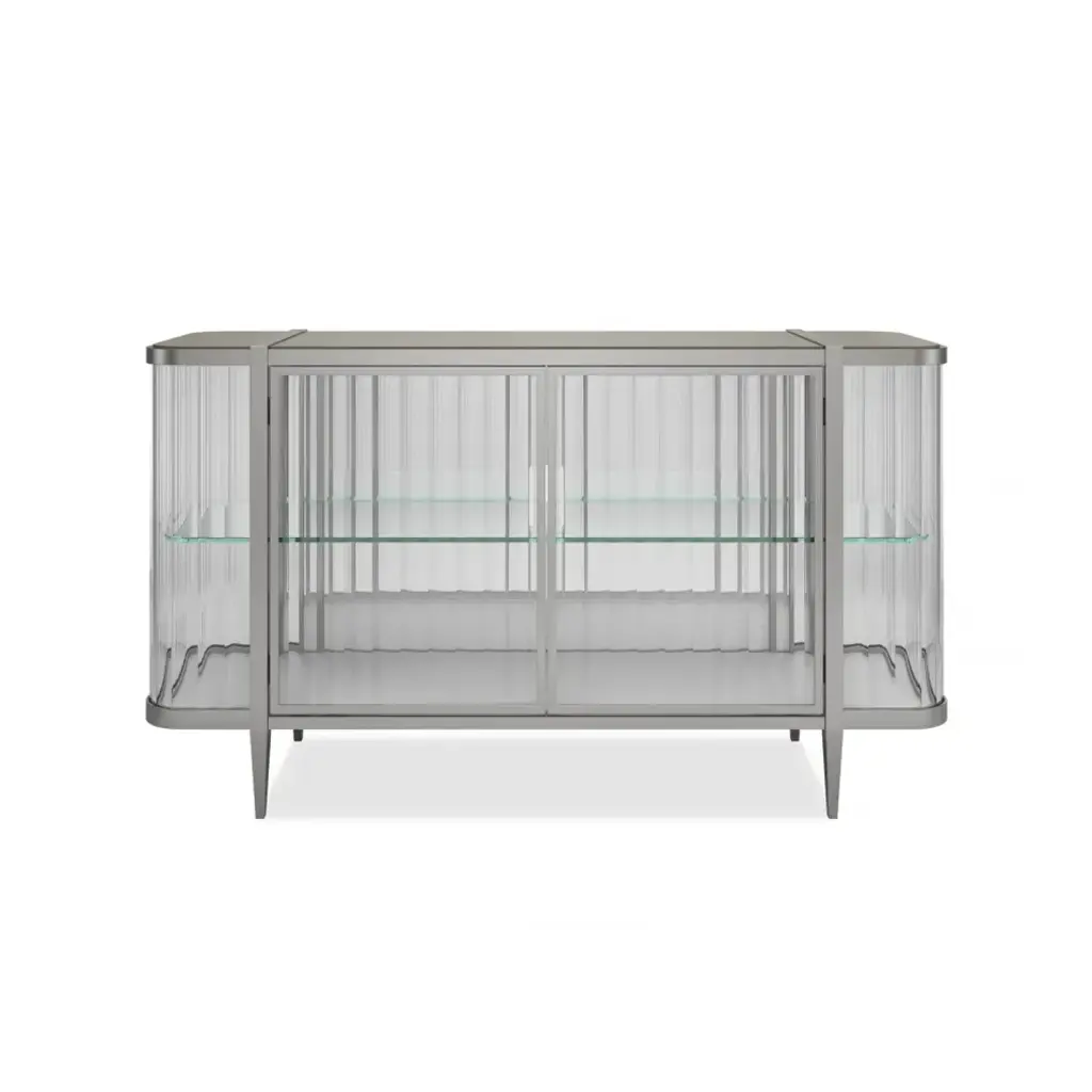 It’s true, this console is so extraordinary, you can’t help but Stop And Stare. It’s an instant source of brightness and reflectivity that creates a natural focal point. A wavy acrylic exterior mirrors the undulating patterns of sand and sea while its top adds another layer of organic splendor. The mirrored interior back and bottom panels are designed to reflect light as it pours in from every angle as well as mirror the beauty of the treasures you display. Glass shelves ensure unobstructed views as do its touch-latch doors with concealed hinges. A Lightly Brushed Chrome finish outlines its rounded silhouette and four tapered feet, imparting the overall luxe feeling of a diamond in a platinum setting.