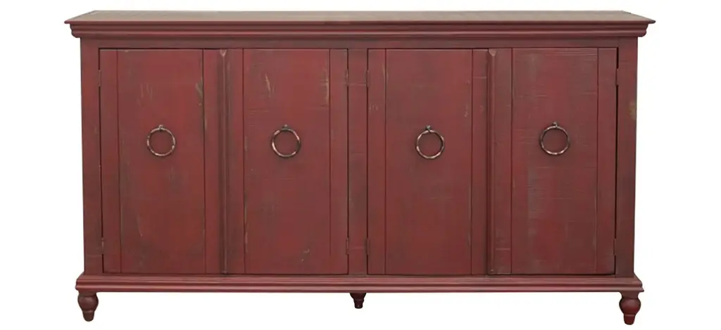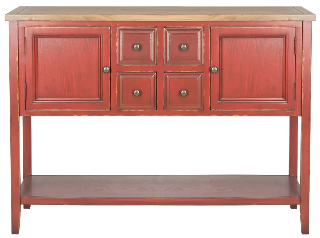 The sideboard by is a godsend for those in dire need of extra storage. With wine-toned cabinetry and weathered oak top, this casual sideboard proves the perfect companion to country styled kitchens, living rooms and dens.Crafted from elm and pine, features four drawers, two cabinets and a bottom shelf. Wood is a natural material with variations of color shade, configuration, streaks, and grain structure. Each individual piece of furniture has characteristic markings that will differ from photo and showroom Samples. Regular attention and maintenance of fine furniture can ensure it's beauty for years to come. Always use felt pads under all articles to prevent discoloration or softening of the lacquer. Plastic and rubber bases on items can discolor wood. Some assembly required.