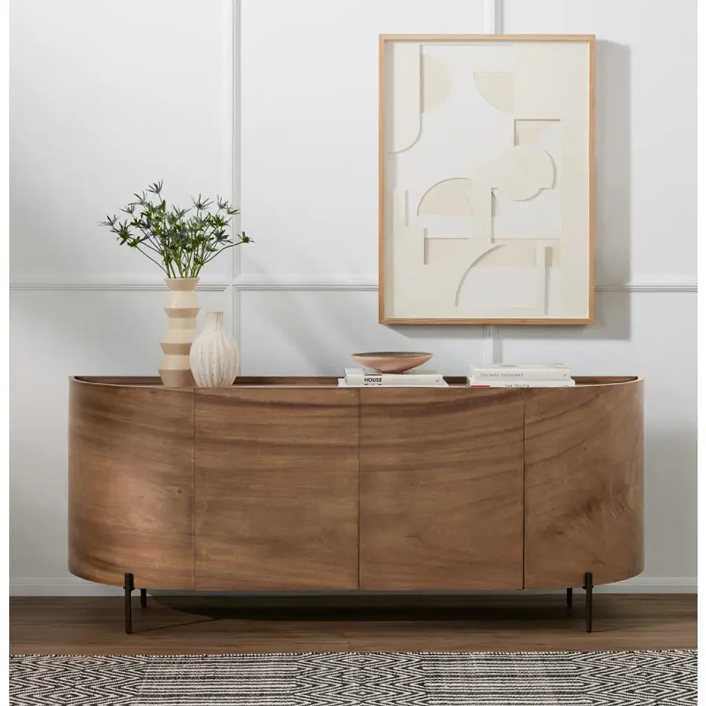 This 82” wide sideboard is crafted from metal in warm hues of brown and ombre and is supported by an iron frame. The four cabinet doors have a distinctive hand-rubbed appearance that reads as artfully aged. Inside, eight shelves provide ample room for storing everything from serving pieces to media consoles. The absence of hardware creates a streamlined silhouette, while cutouts on the back keep cords and cables tidy and tangle-free.