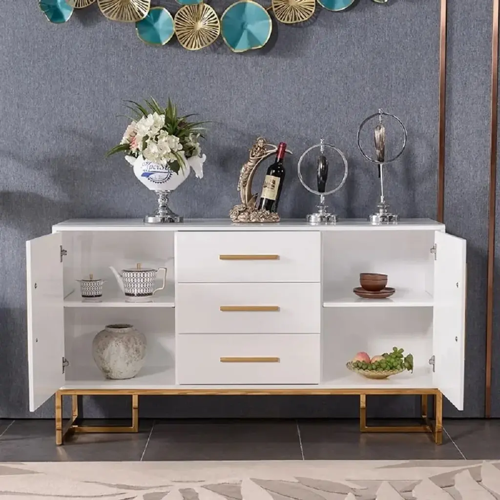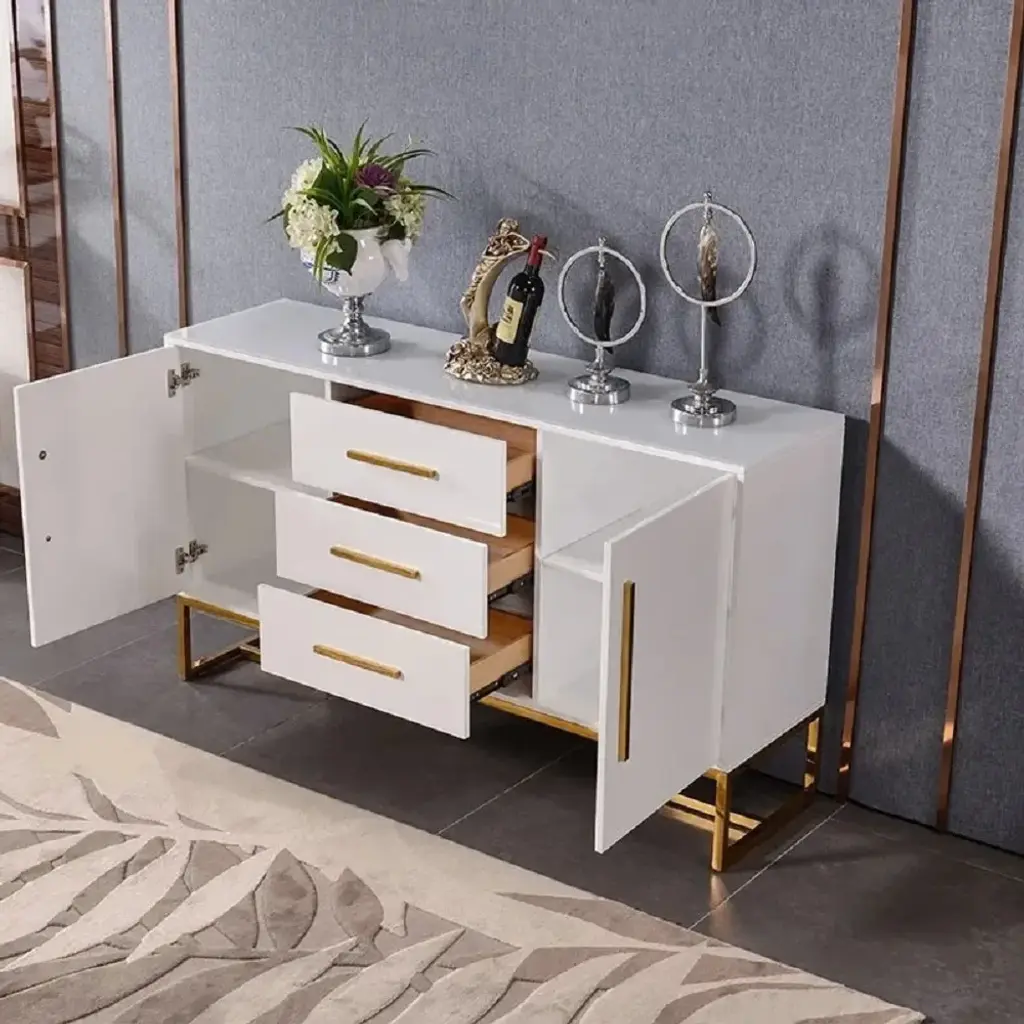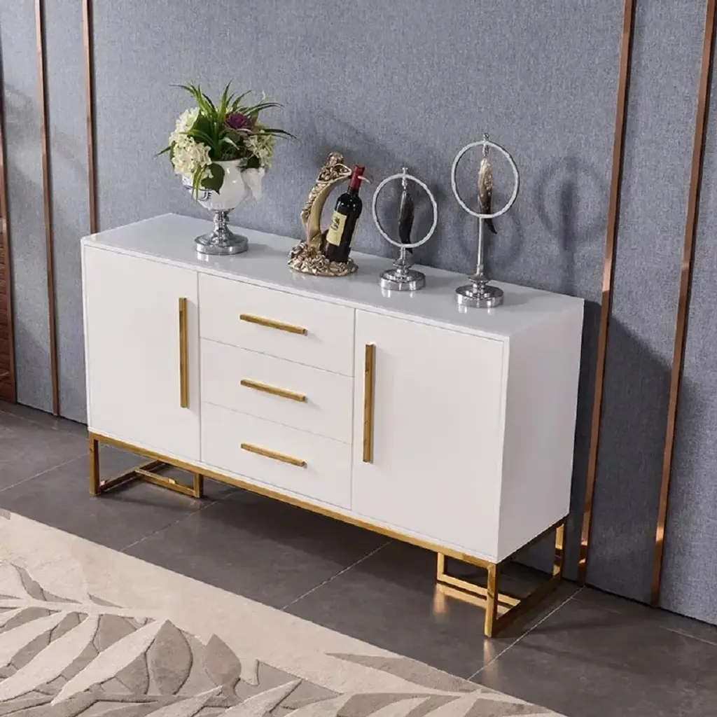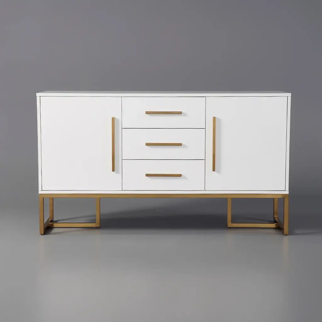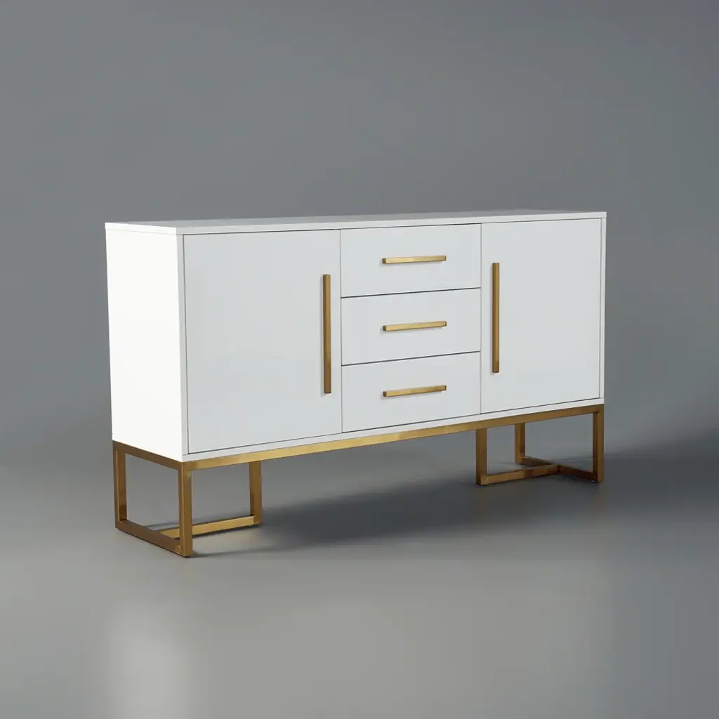 This elegant white sideboard combines clean modern design with practical functionality. Crafted from white MDF with golden stainless steel handles and legs, it features two spacious doors and three smooth-gliding drawers. The minimalist aesthetic makes it a versatile storage solution for contemporary living spaces.