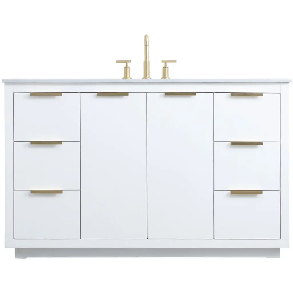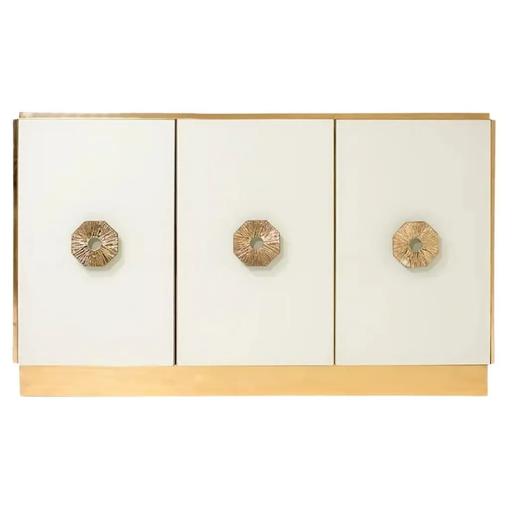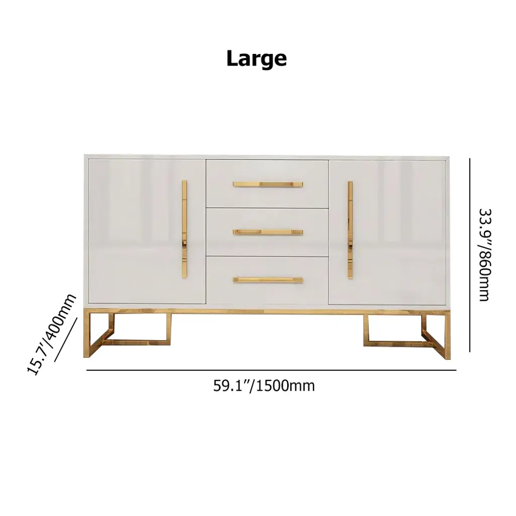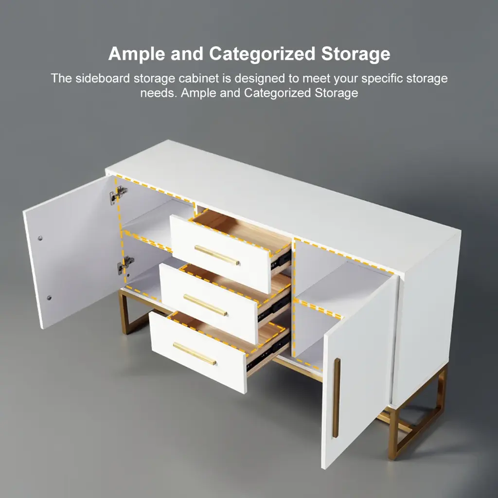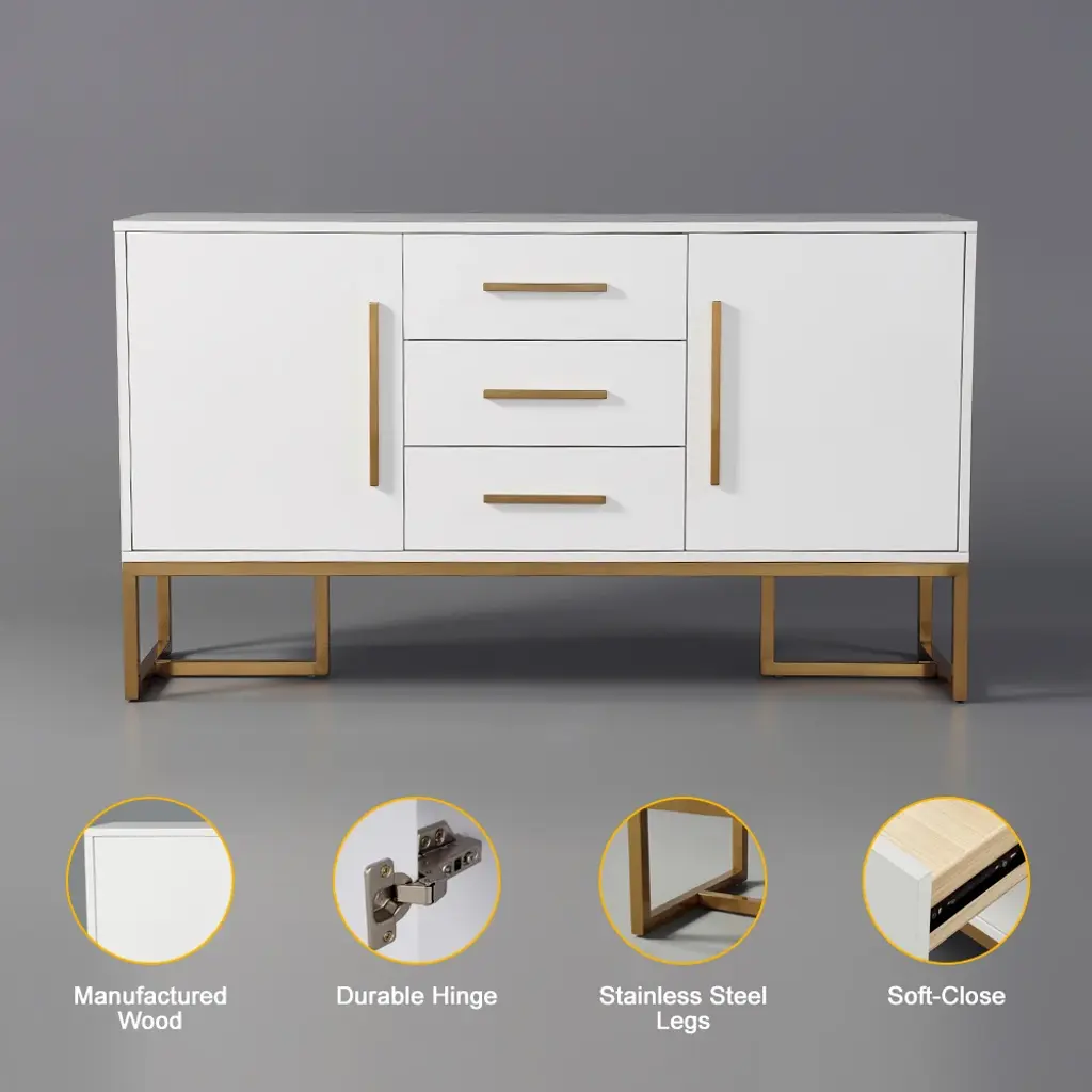 This elegant white sideboard combines clean modern design with practical functionality. Crafted from white MDF with golden stainless steel handles and legs, it features two spacious doors and three smooth-gliding drawers. The minimalist aesthetic makes it a versatile storage solution for contemporary living spaces.