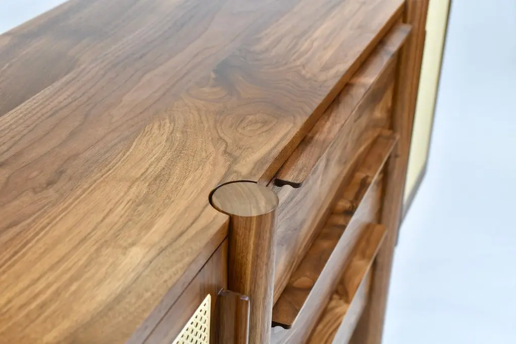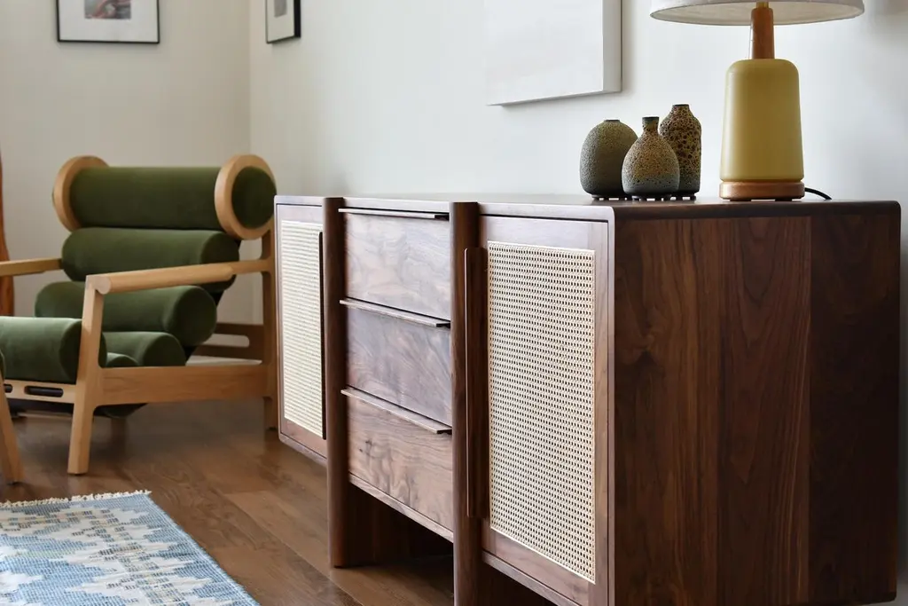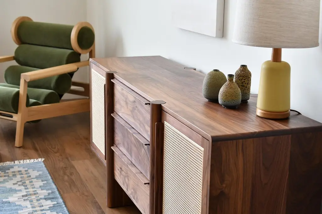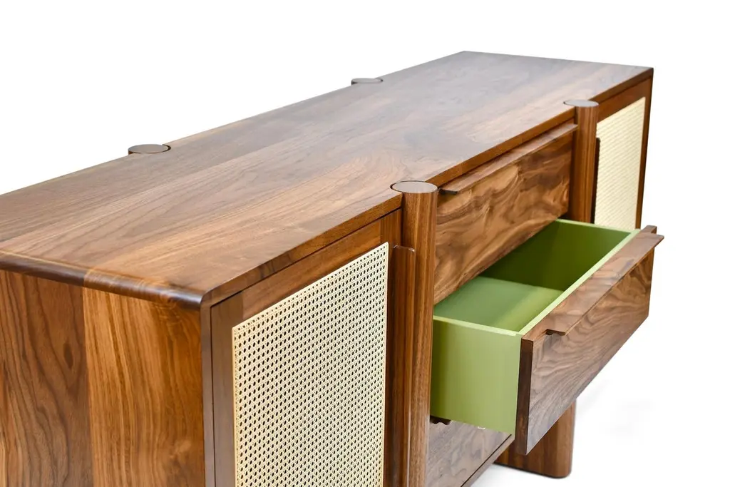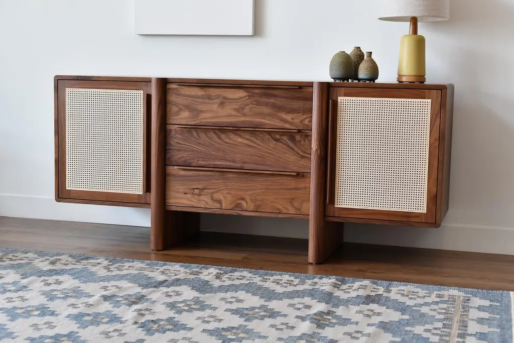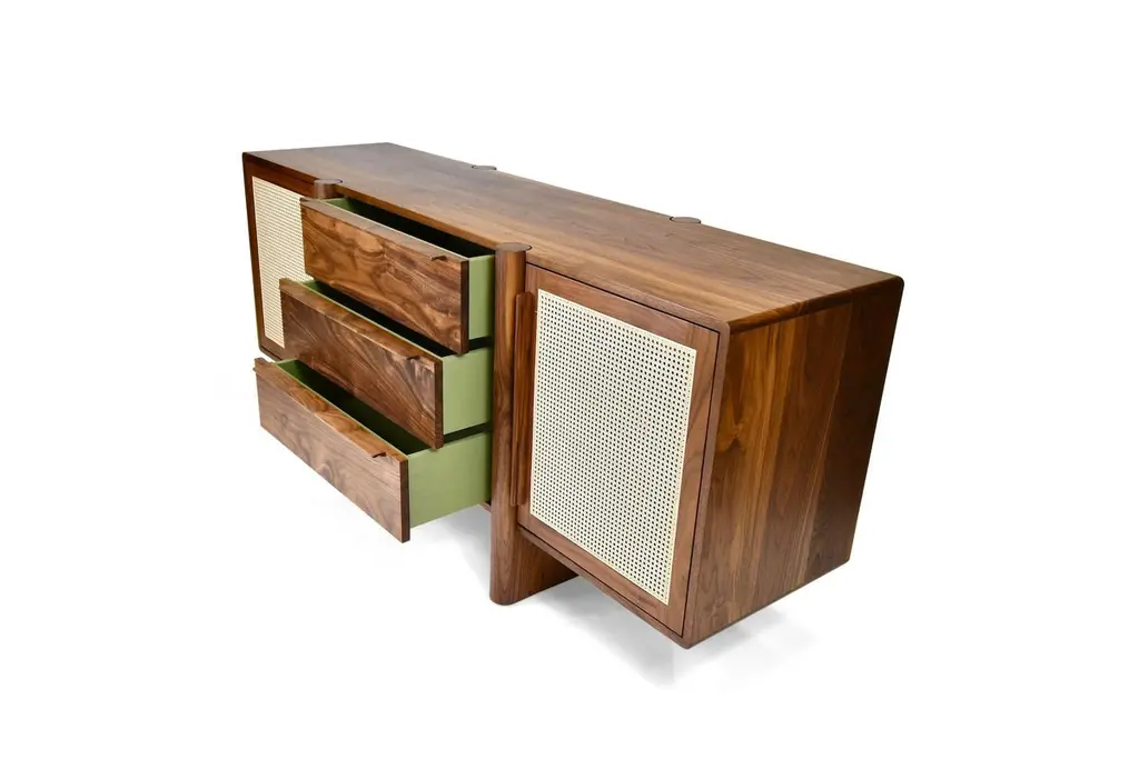The Sulaco Sideboard champions the foundations of the Danish Modern Movement. Rooted in functionality, every curve and feature is meticulously crafted to ensure aesthetics and utility go hand in hand. A modern sculpted design that embraces the traditions of natural materials applied in a sustainable and timeless approach. Featuring two natural woven caned panel doors and three drawers.FSC certified solid wood construction. Made to OrderAvailable in three wood types and seven standard finishes. Customization available per approval.Handcrafted in Los Angeles