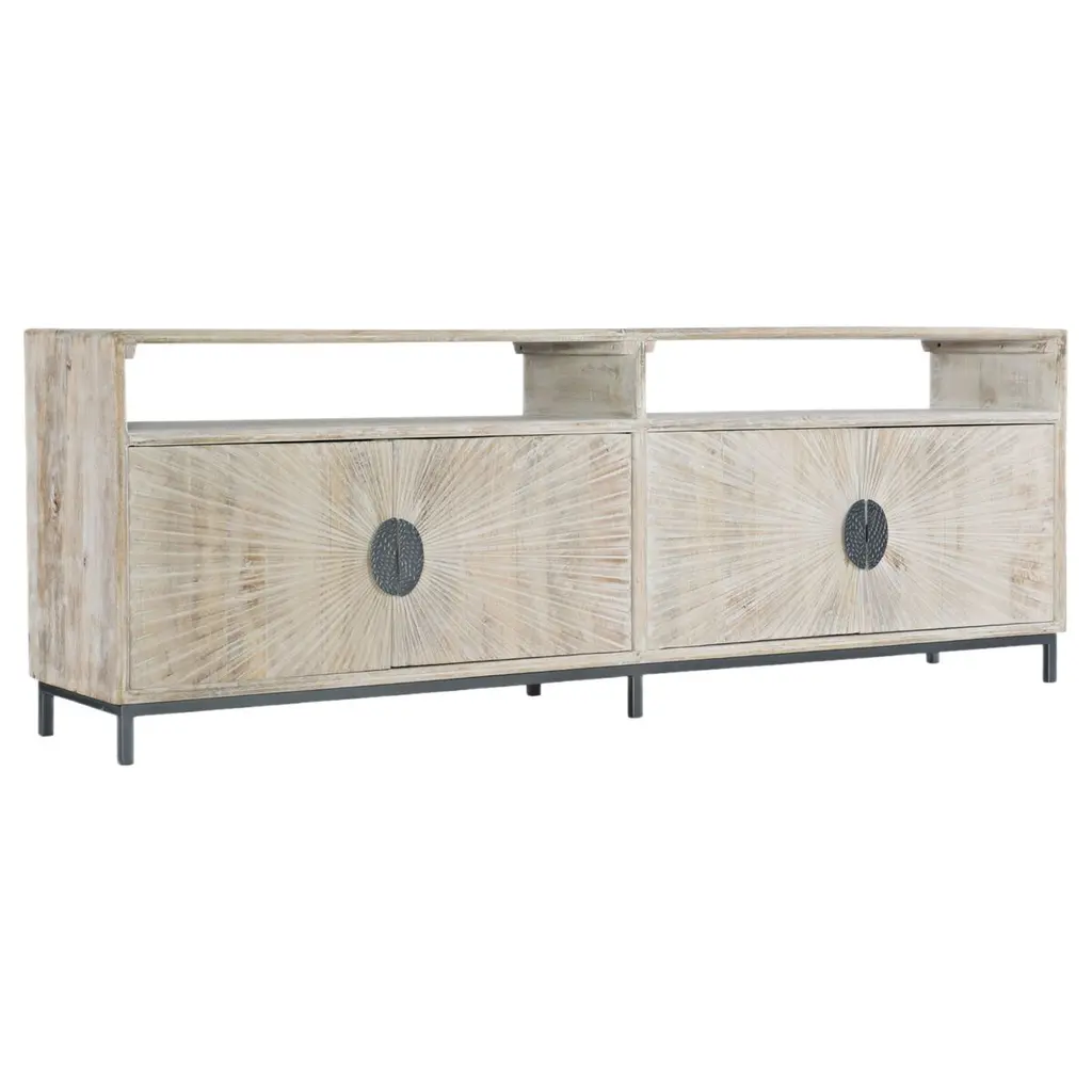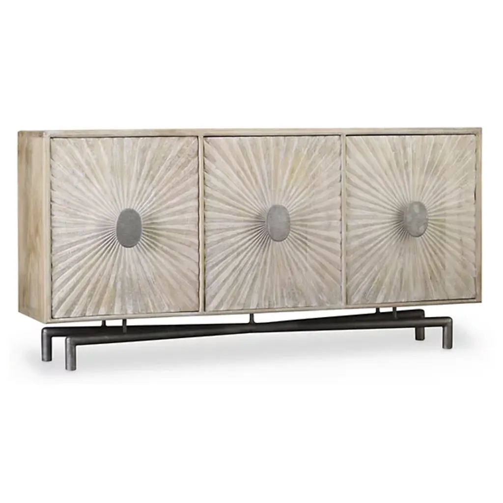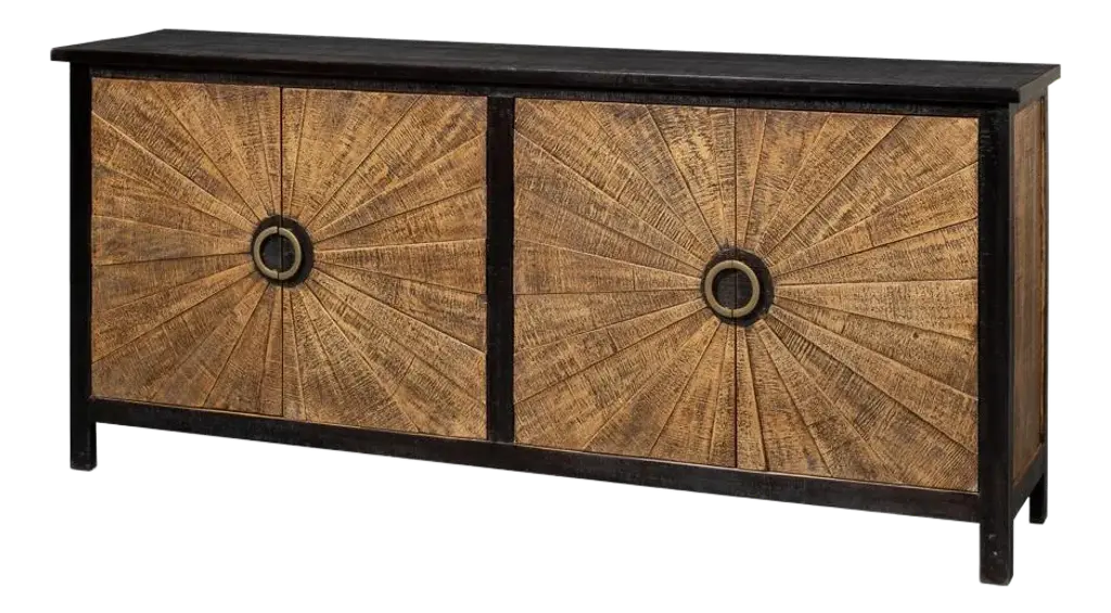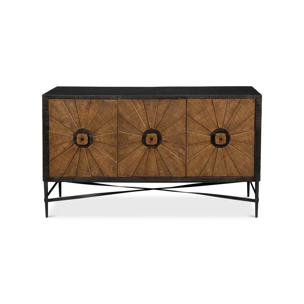 Crafted from reclaimed wood, each door features an intricate sunburst pattern that radiates warmth and texture, while the deep black frame enhances its sculptural presence. The sideboard is supported by a sleek, crisscross metal base, adding an industrial touch that balances its organic character. Behind the three doors, ample storage ensures both beauty and practicality, making it a perfect statement piece for dining rooms, living areas, or entryways. Its artisanal craftsmanship and eco-conscious materials make this sideboard a timeless investment for those who appreciate luxury with a sustainable edge. Dimensions: 60" W x 18" D x 34" H