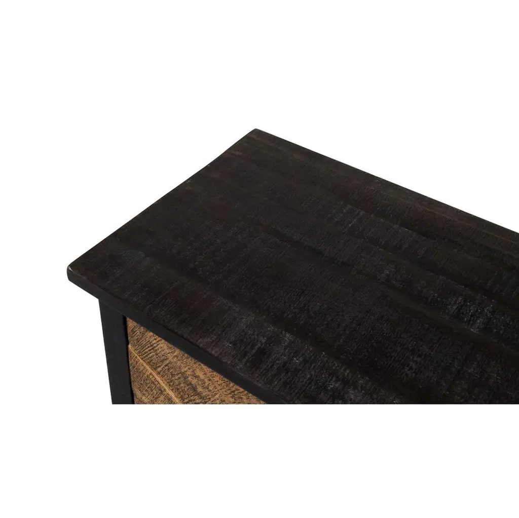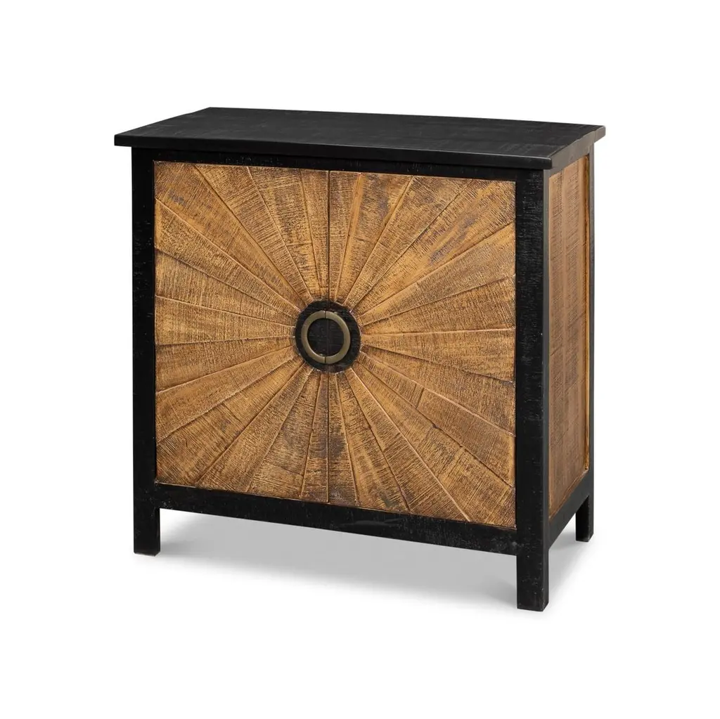 This beautifully handcrafted piece features bold sunburst patterns on its front, composed of intricately arranged wood panels that radiate from a central circular metal pull. The warm finish highlights the rustic natural grain, while the contrasting black frame and top add a refined, contemporary edge. A perfect blend of rustic artistry and modern sophistication, this buffet sideboard serves as both a functional storage solution and a statement piece. Designed for versatility, the cabinet effortlessly complements a range of interiors, from traditional to eclectic and contemporary. Its spacious interior provides ample storage, making it ideal for entryways, living rooms, or dining spaces. Whether used as a focal point or as part of a curated aesthetic, this cabinet brings timeless craftsmanship and bold design into any home. Dimensions: 77" W x 18" D x 34" H