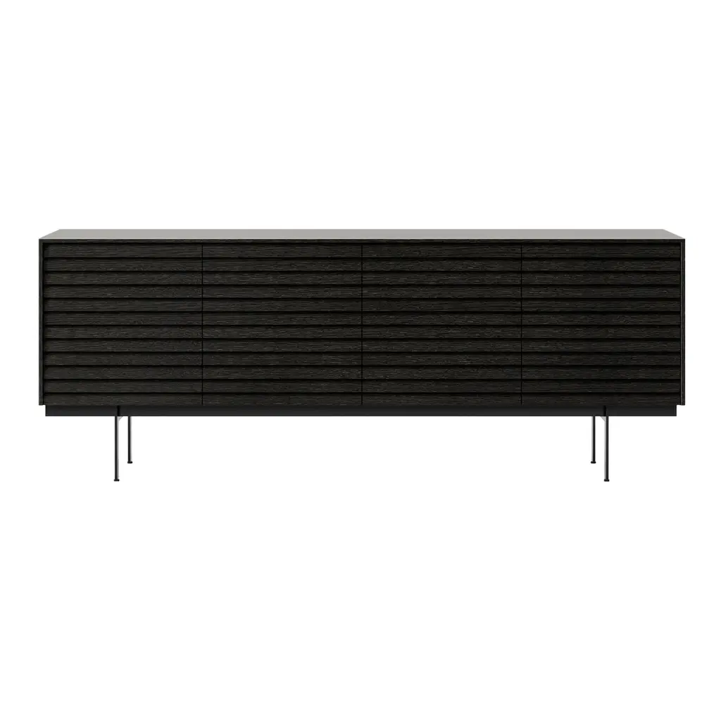 Designed by Terence Woodgate, this version of Sussex 12 positions a single drawer above each door hiding an adjustable shelf inside in each of its 4 storage multiples, elegantly united behind a horizontally slatted front. Rendered in oak or walnut, Punt’s cabinetry rests on a slim steel base in black or bronze powder coat for an impression of visual lightness.