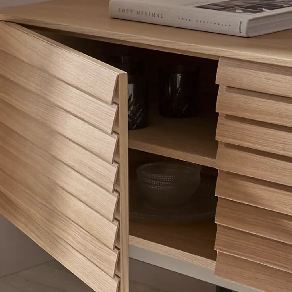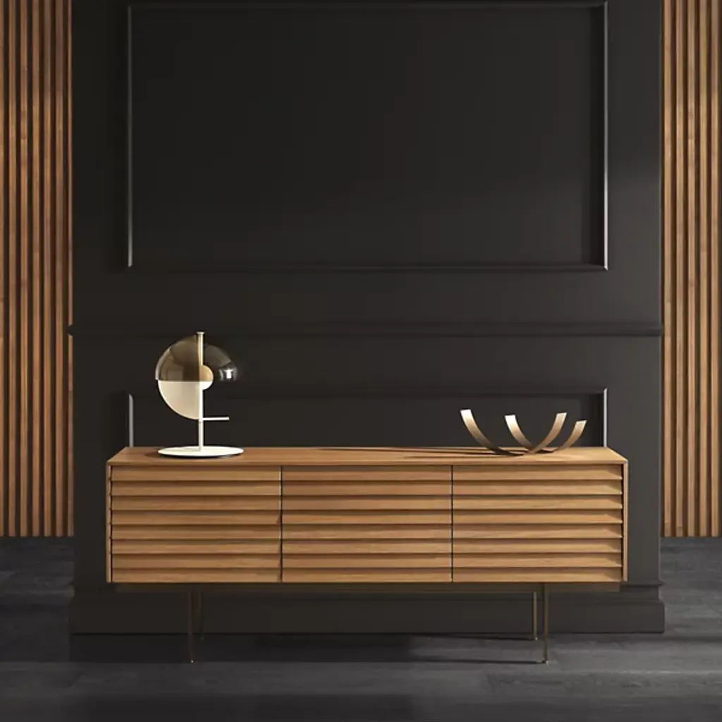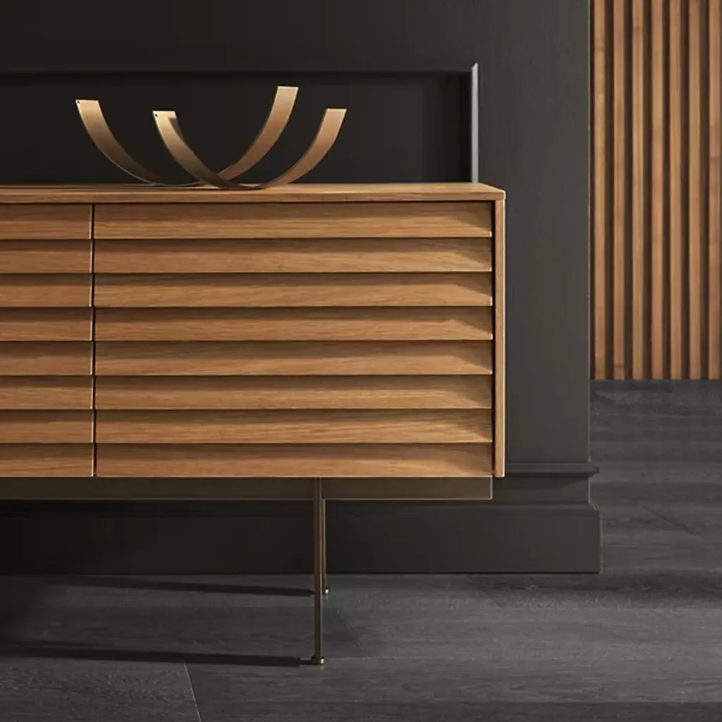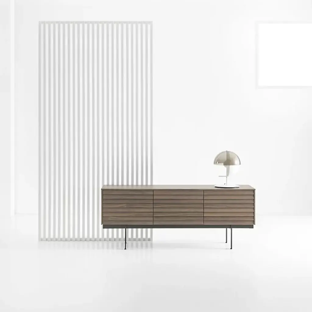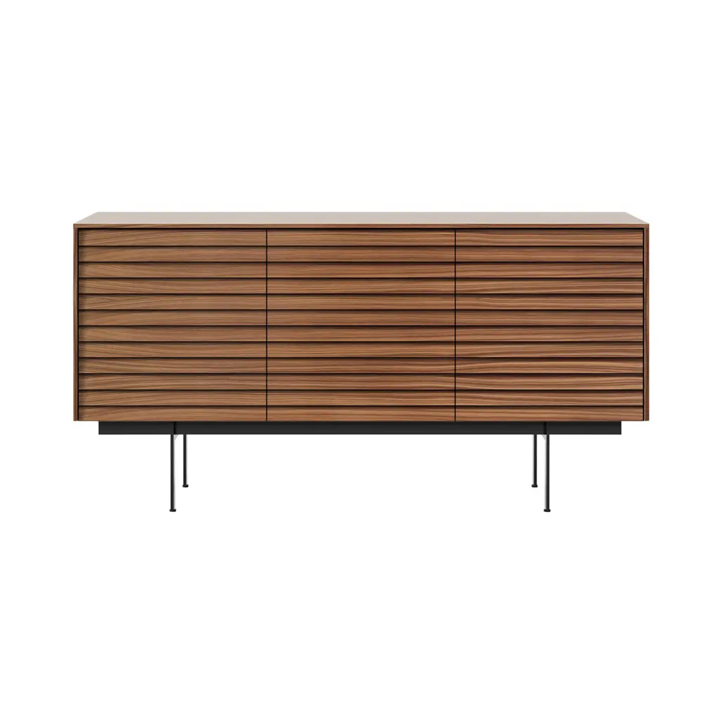 Decorate your living space with the handsome Sussex Sideboard from Punt Mobles. This furnishment is designed by Terence Woodgate. Your sideboard is defined by its slatted appearance and wood composition. A streamlined frame provides foundational support, allowing this sideboard to be balanced by slim legs of steel. Sussex features height-adjustable shelving to help you stay organized. Set up the Sussex sideboard with adjustable feet or on the wall for your convenience. Multiple doors keep your possessions concealed for a neat appearance.