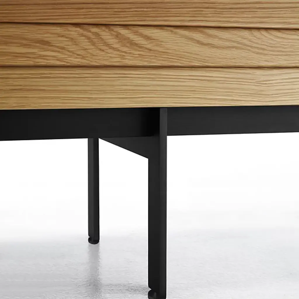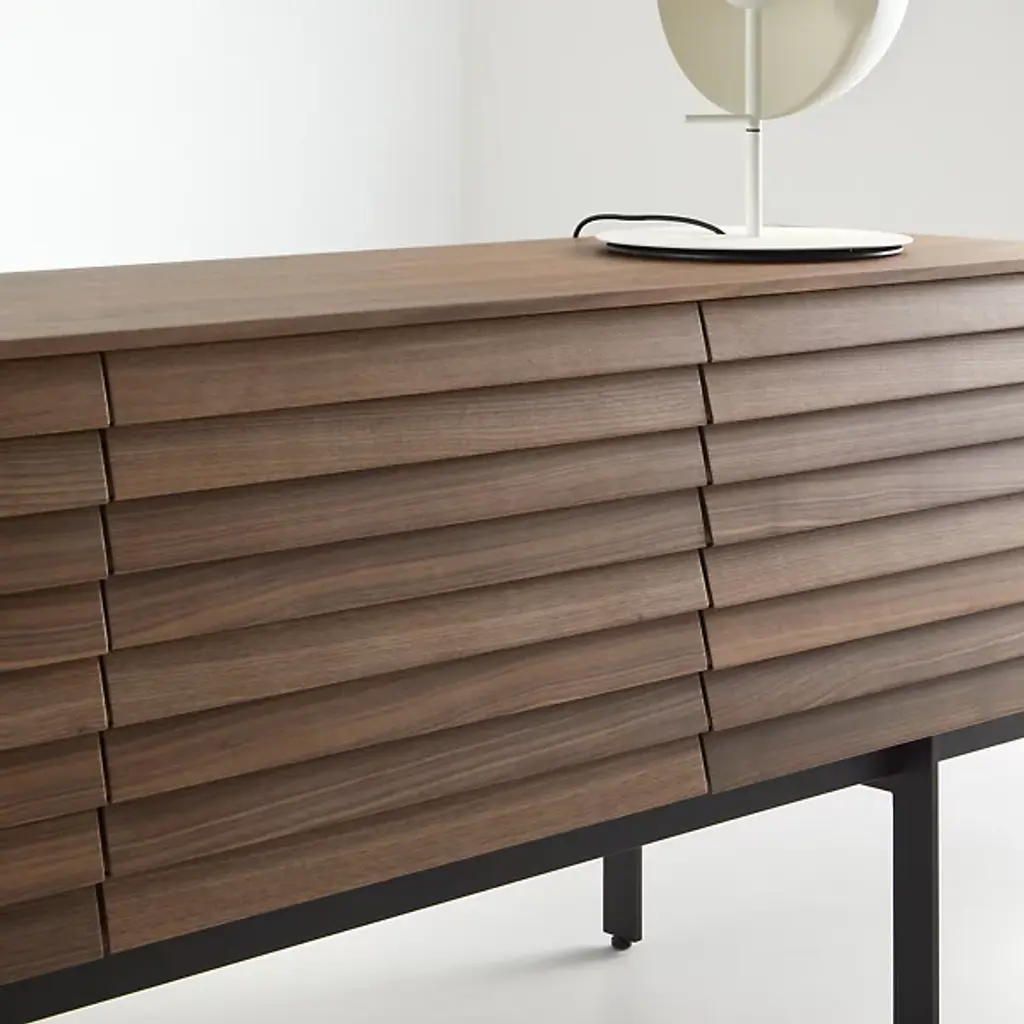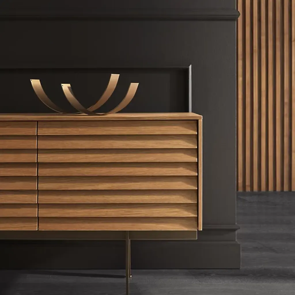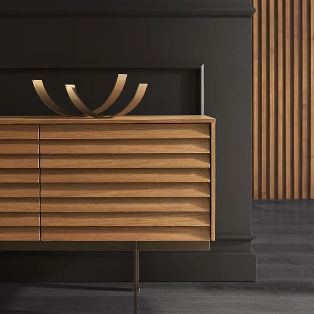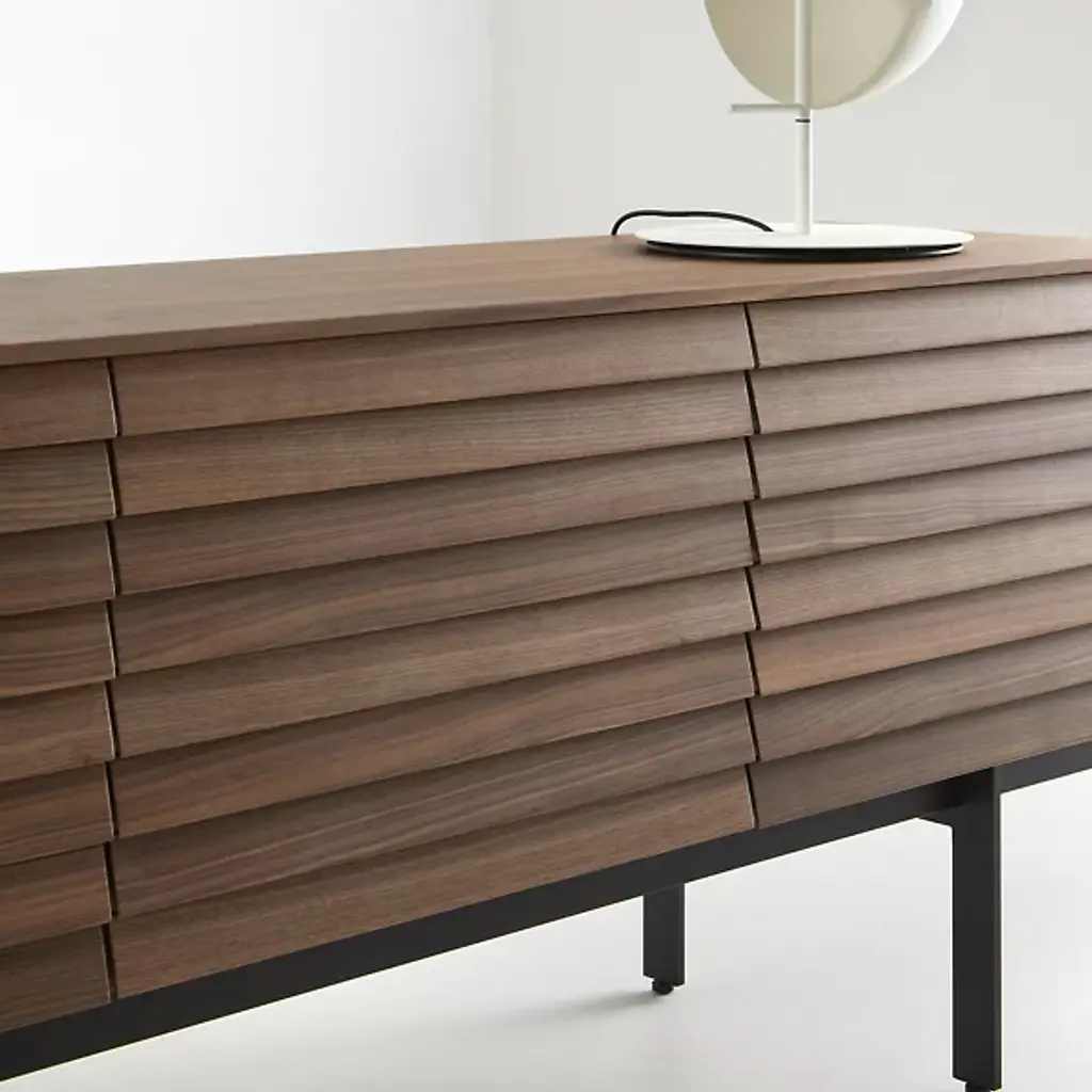 Decorate your living space with the handsome Sussex Sideboard from Punt Mobles. This furnishment is designed by Terence Woodgate. Your sideboard is defined by its slatted appearance and wood composition. A streamlined frame provides foundational support, allowing this sideboard to be balanced by slim legs of steel. Sussex features height-adjustable shelving to help you stay organized. Set up the Sussex sideboard with adjustable feet or on the wall for your convenience. Multiple doors keep your possessions concealed for a neat appearance.