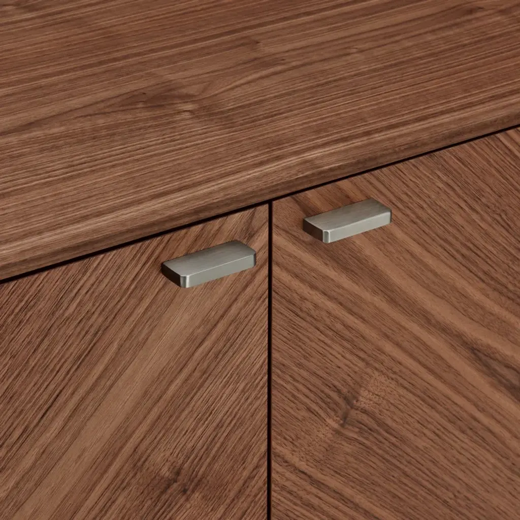 The Alvarado Sideboard, with its contemporary lines, is as stunning as it is functional. This 40-inch sideboard features an American walnut veneered MDF outer frame and brushed stainless steel legs and handles. There are two compartment doors, designed with a chevron pattern, that enclose ample space and shelves for convenient storage.