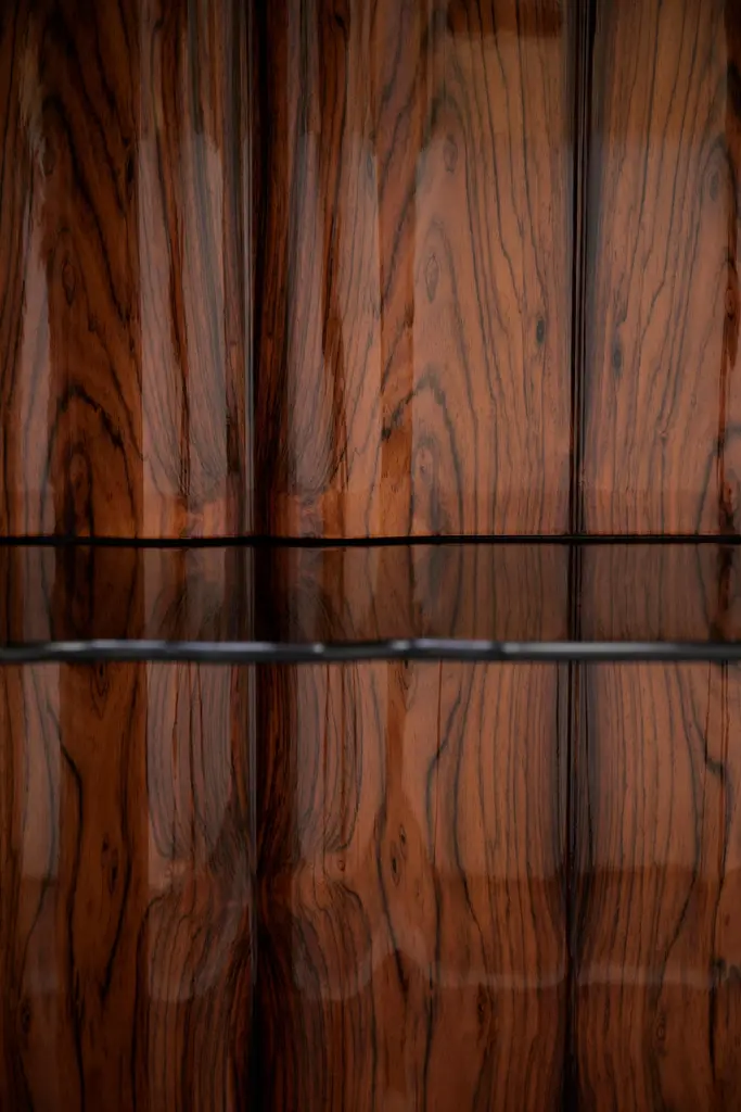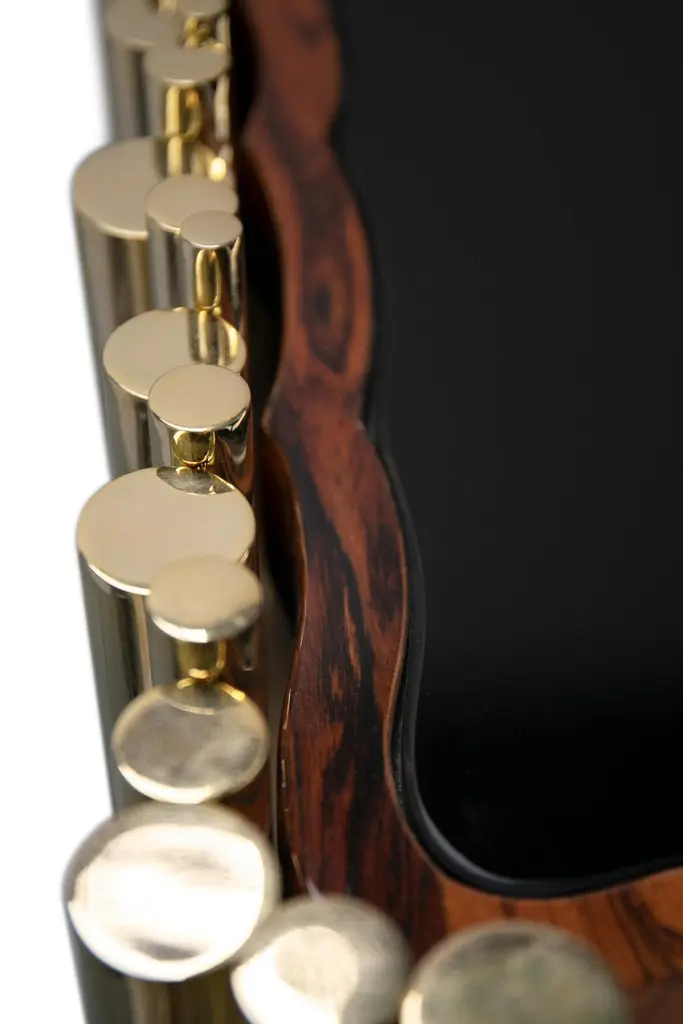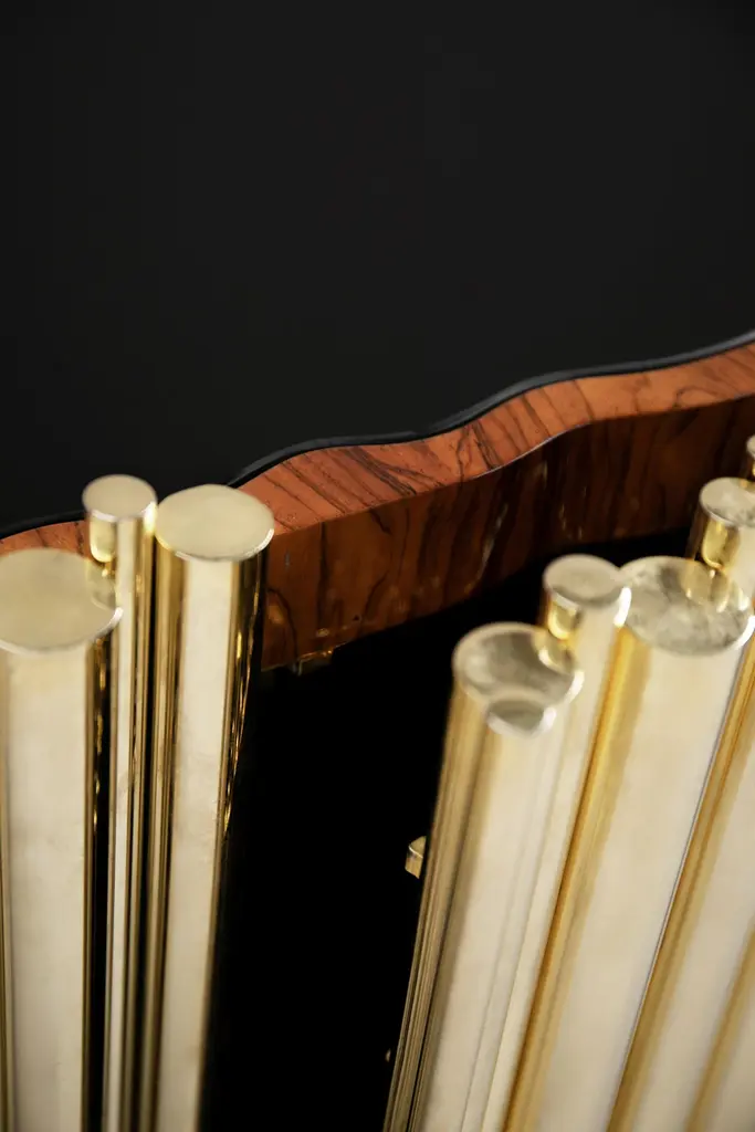The Symphony sideboard is a statement piece whose modern design emulates the grandeur of classic church organ pipes. Synonym of innovation and flawless execution, the Symphony is one of the most exquisite pieces to grace the Limited Edition collection. It is methodically handcrafted by different master artisans, from specialized goldsmiths to the passionate wood carving craftsmen.Available in three different lengths, with two, four or six overlay doors, the interior is finished in sleek ebony veneer and boasts a central smoked glass shelf that brings practicality to an accent case piece able to break the silence in the quietest of rooms.