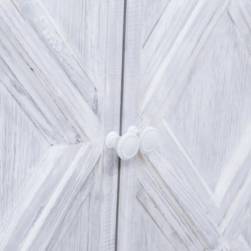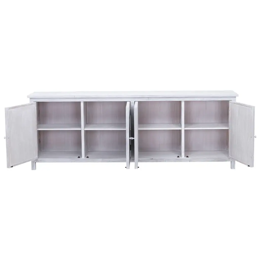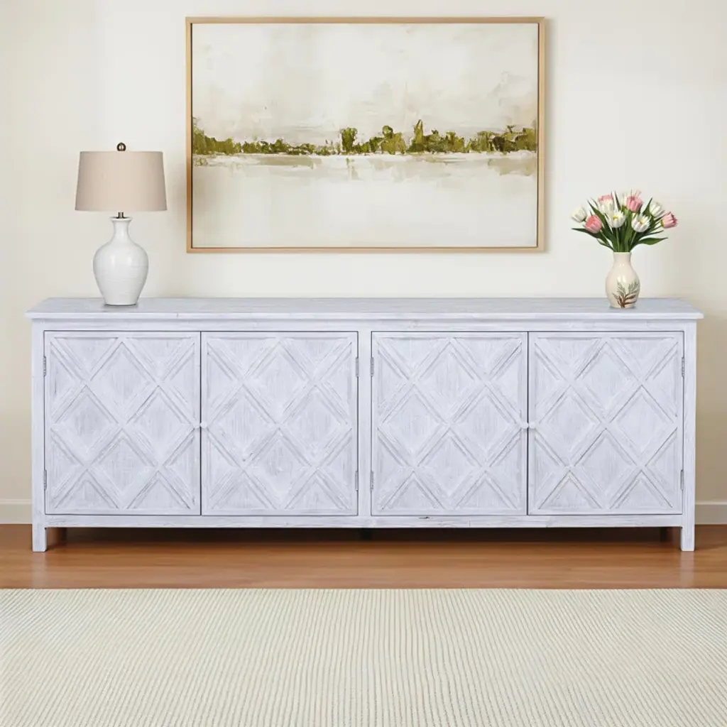 This extra-long sideboard stretches 94" in wide. It is made from solid reclaimed pine hardwood and finished with a beautiful, whitewashed finish and hand-carved door fronts in an elegant and fun crisscross pattern with an understated door pull that opens to large storage compartments. Inside are built-in shelves with magnetic closures for secure closure. This piece will add a fun flare to any home.