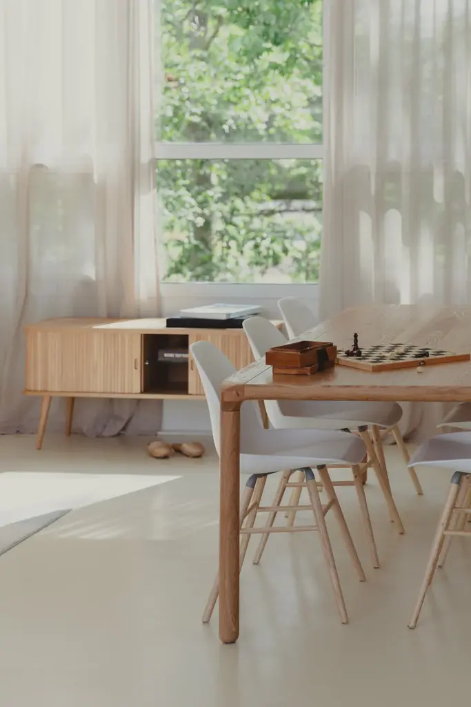One sideboard, two sliding doors, two glass shelves, and a lot of elegance. That’s Zuiver Barbier sideboard in a nutshell. But of course, Barbier is way more than that! It brings warmth and femininity into your interior. Look at the doors with their delicate vertical lines. Slide them back, and two compartments arise in which you can store whatever you like. And that includes audio and TV media, because Barbier sideboard has holes in the bottom and back.
