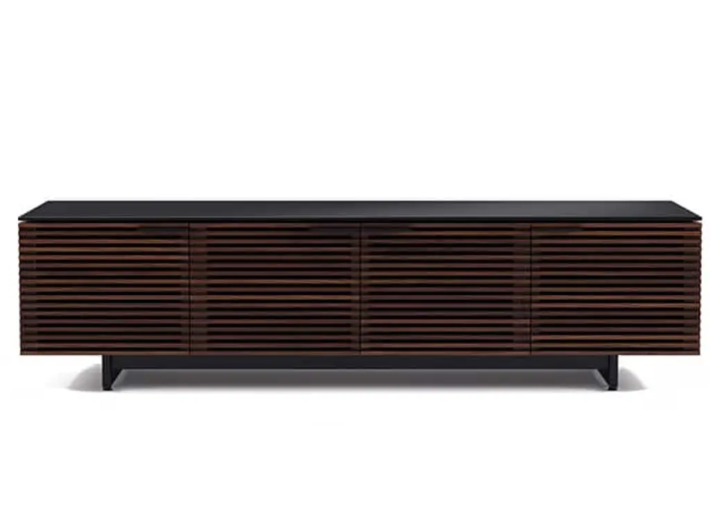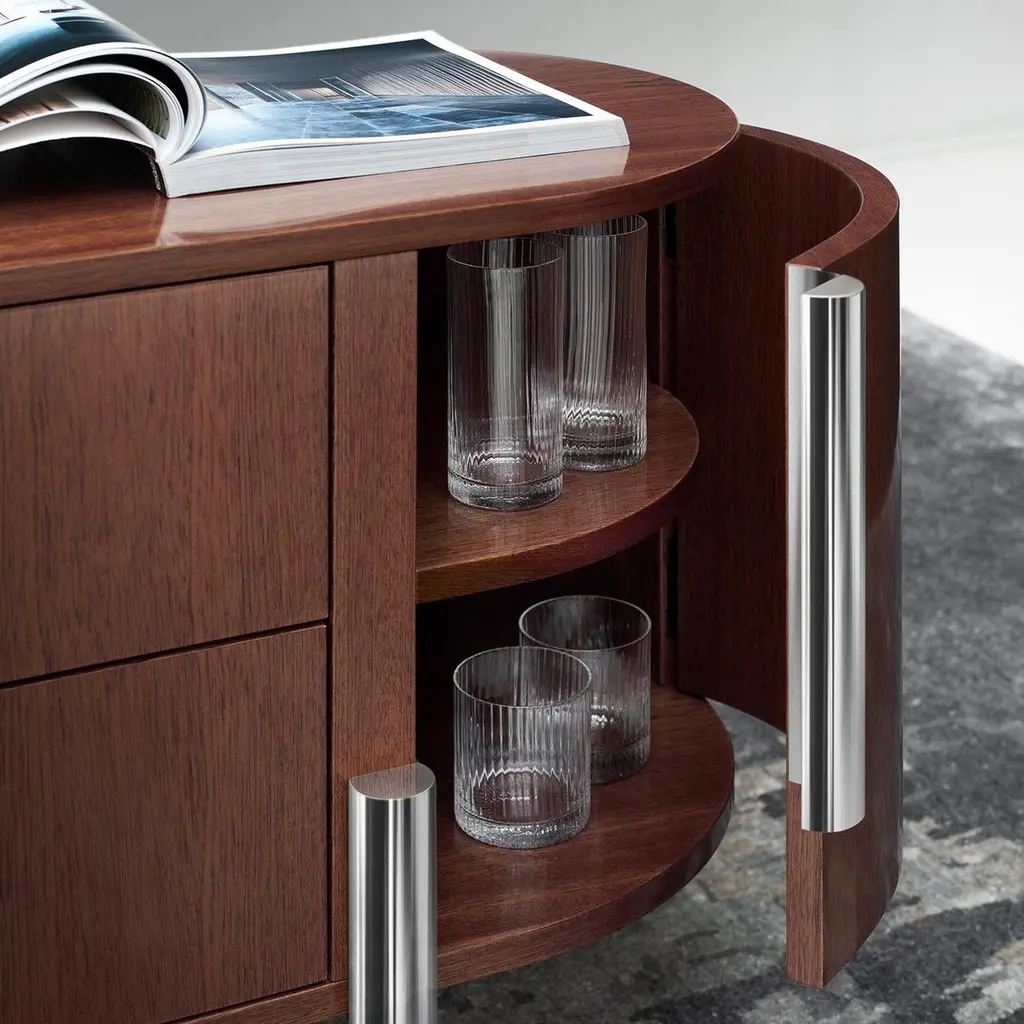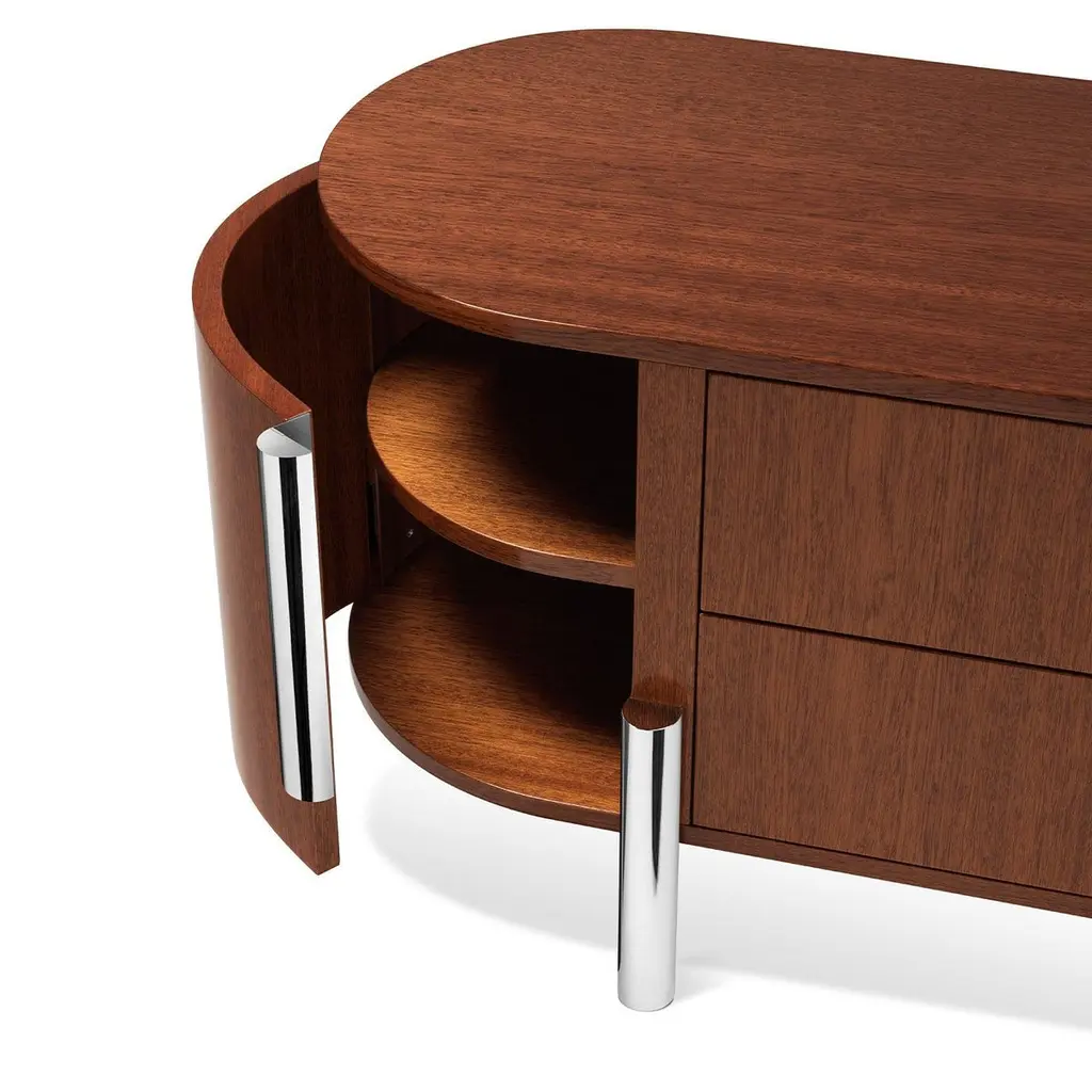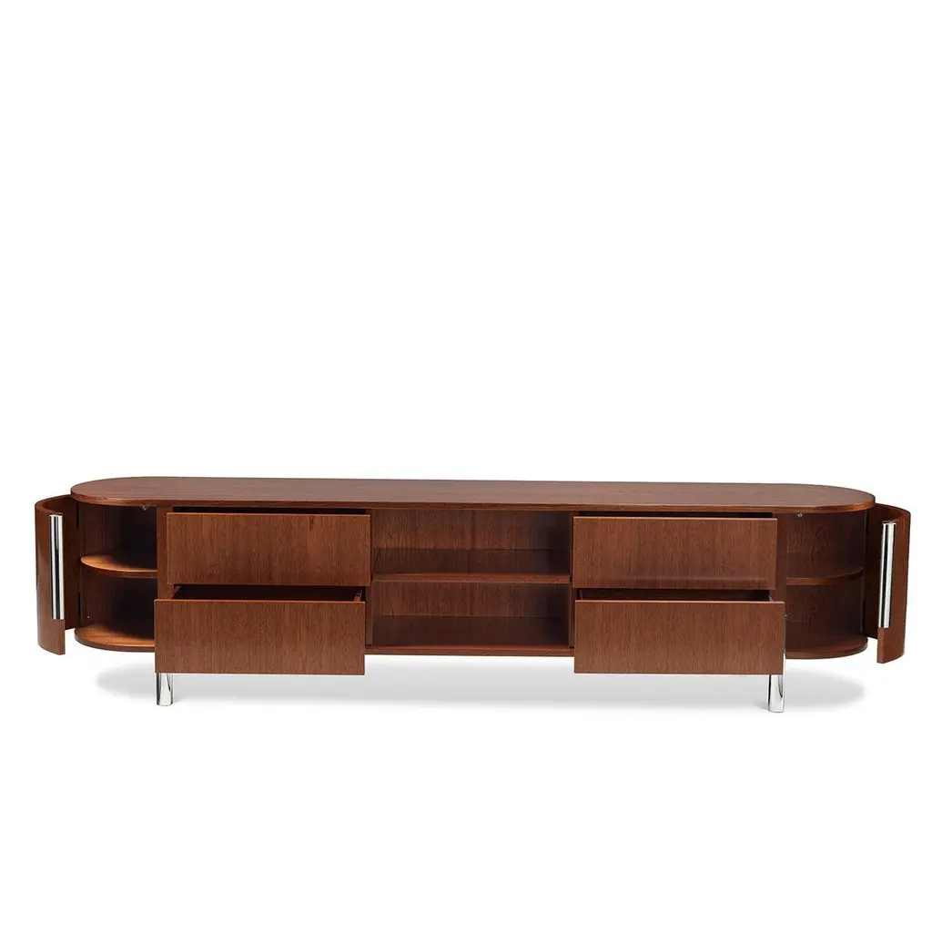 A design Lorenza Bozzoli conceived to enrich sophisticated modern living rooms for many years to come, this sideboard stands out for the intensely curved sides and glistening chrome-finished metal elements that extend from the top to create sleek legs that dynamically contrast with the textural of the wood grain. The two open compartments are set in between four drawers in turn flanked by curved doors.