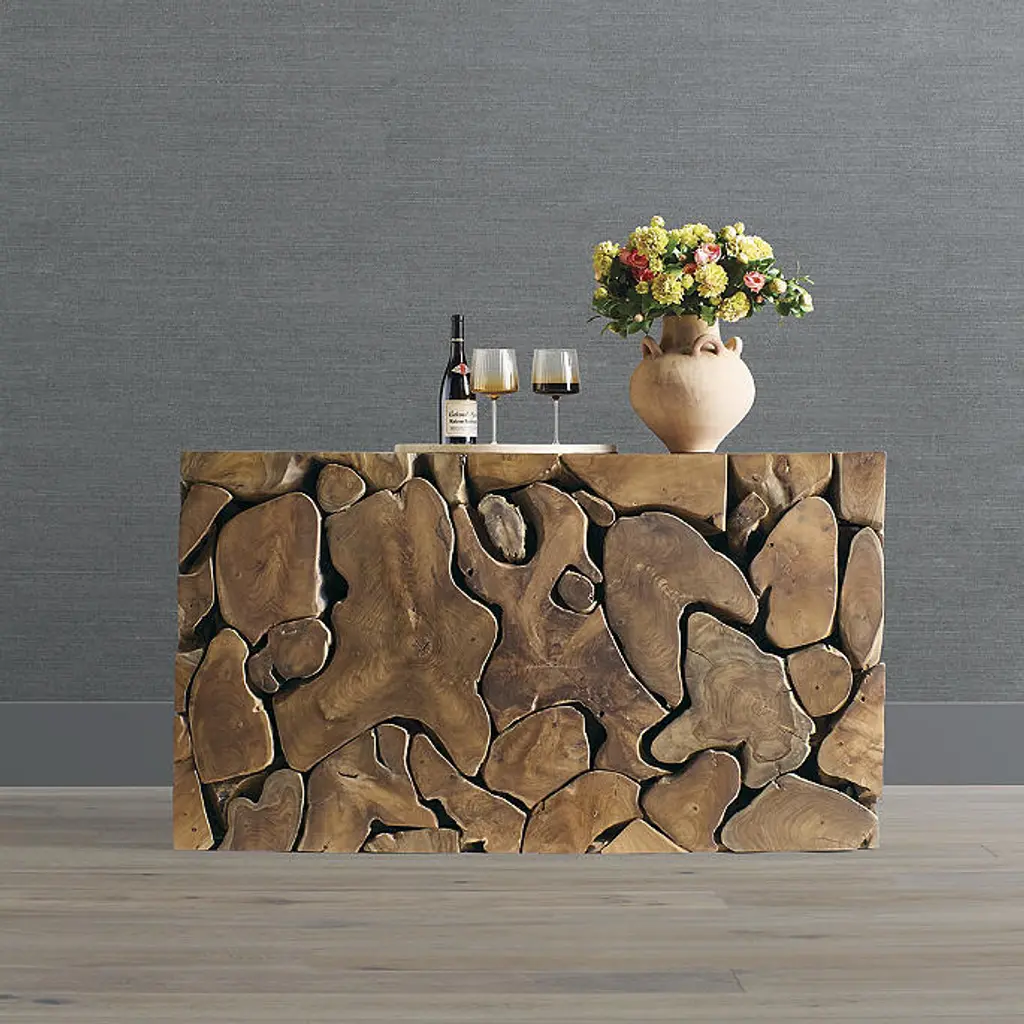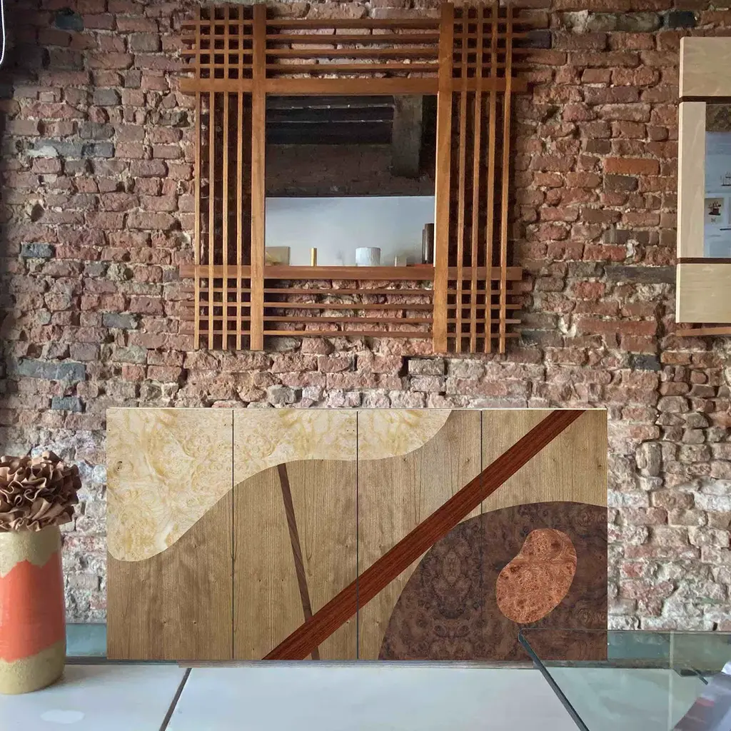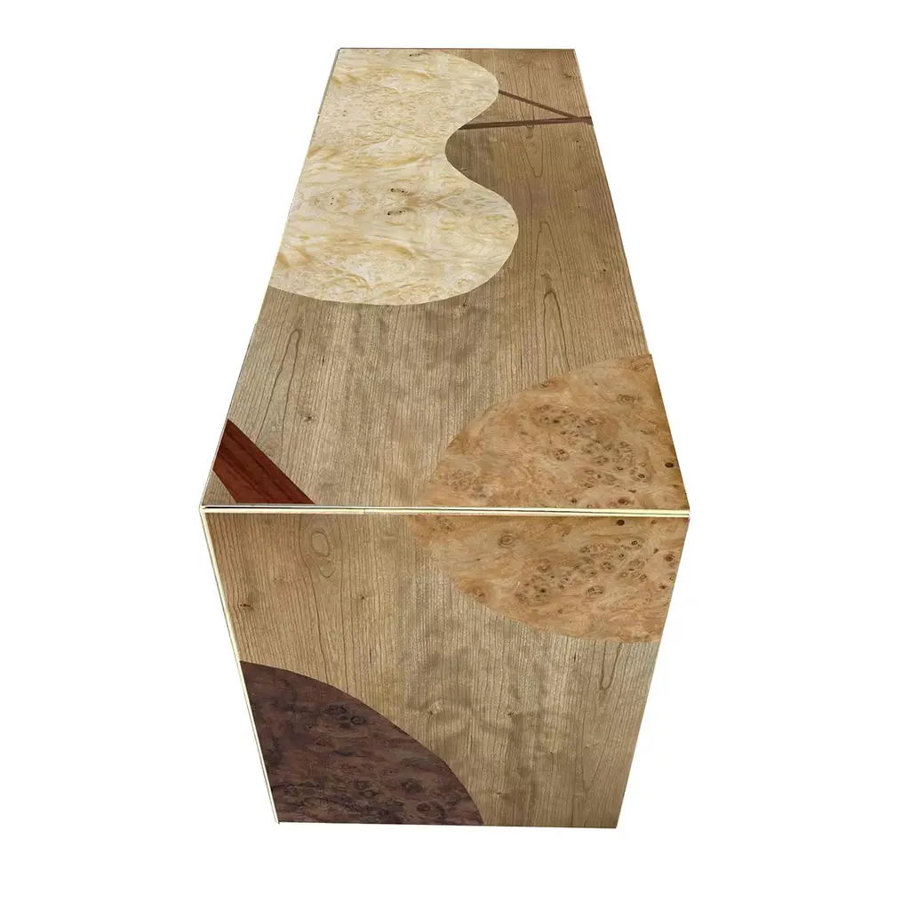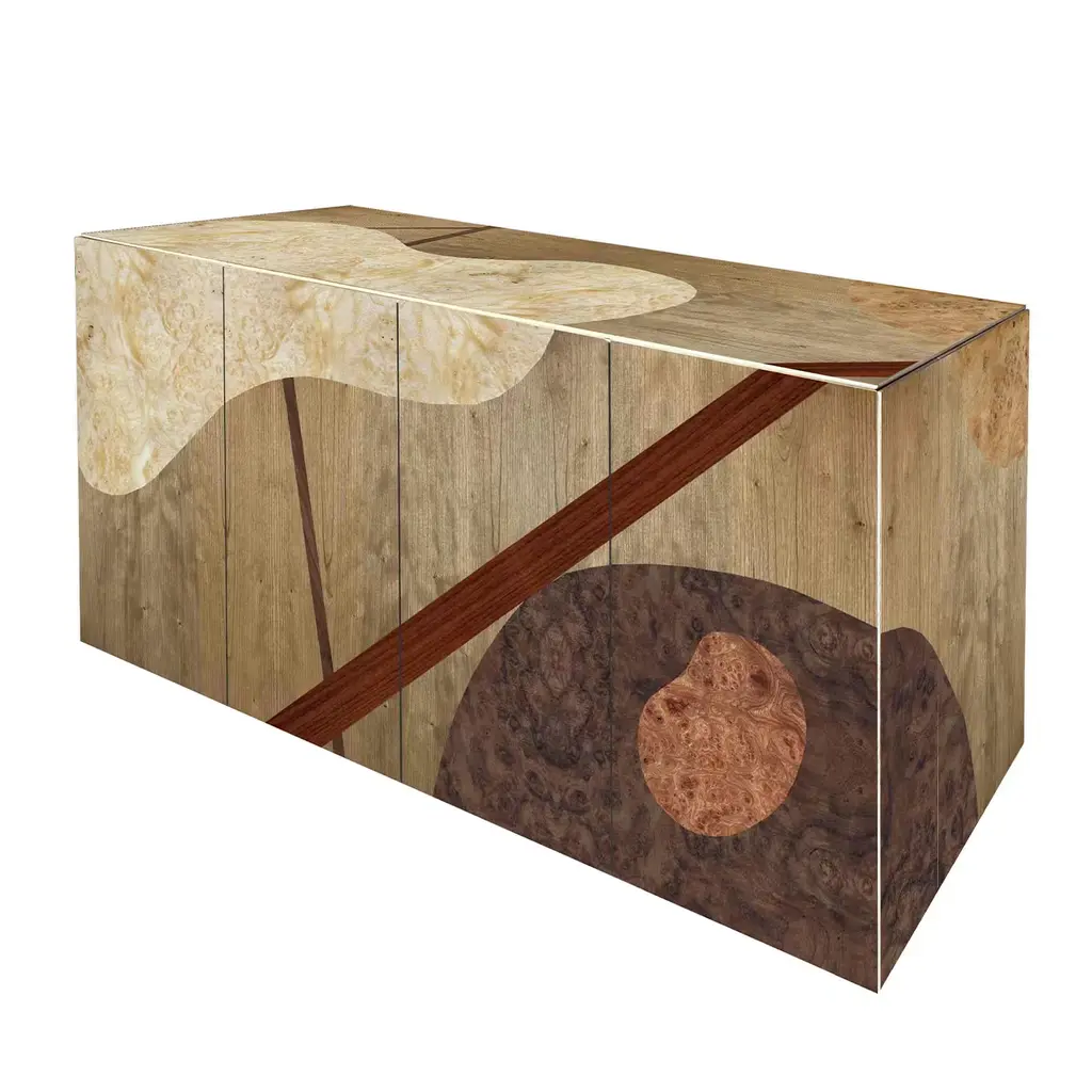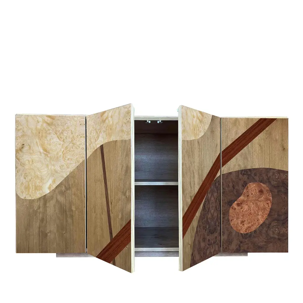 Contrasting abstract marquetries - seemingly hinting at Cubism and obtained by combining precious timbers - characterize this singular sideboard. Entirely crafted by hand, it belongs to the Tarsia Sideboards Collection of designs inspired by the minute inlays of ancient monastery furniture, here reinterpreted in a modern artistic key. Coming signed, the piece is supple with a label with a date.