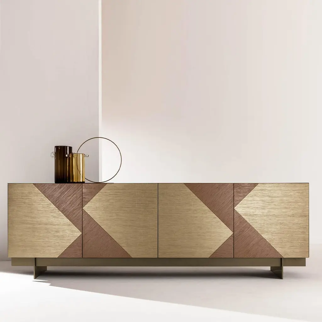 Sideboard with 4 hinged doors and push-pull opening, equipped with 2 internal drawers. “Tatami” decoration on plaster in 2 color combinations: “Bronze”/”Ionized Gold” Top and sides with monochrome Tatami decoration Wengé wooden inside and internal fittings. Metallic base with lacquered finish.