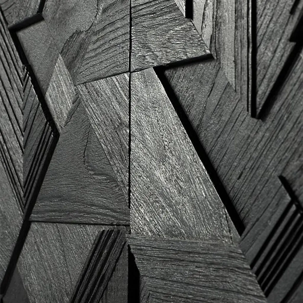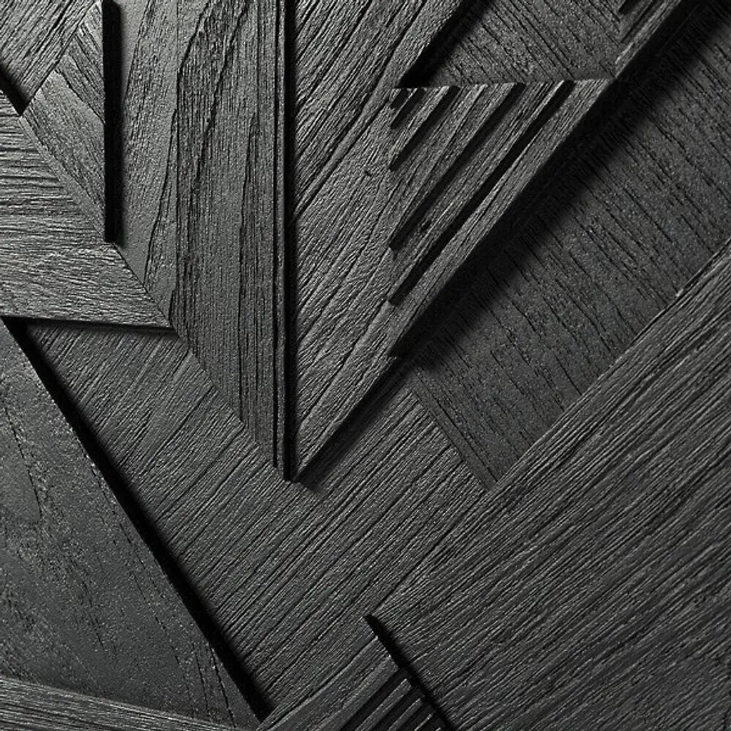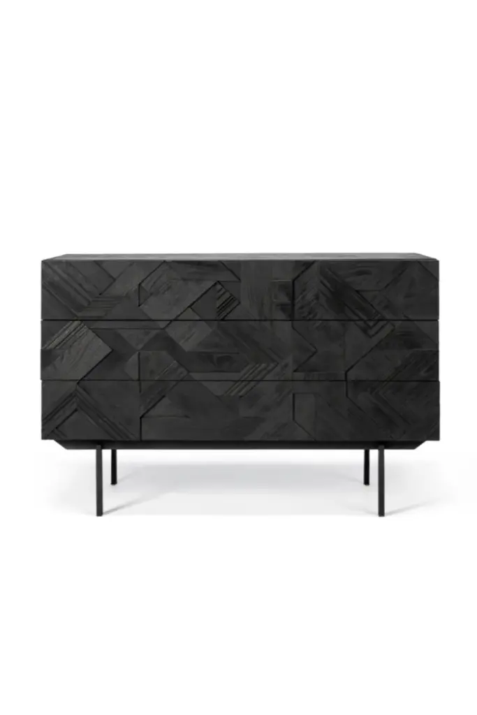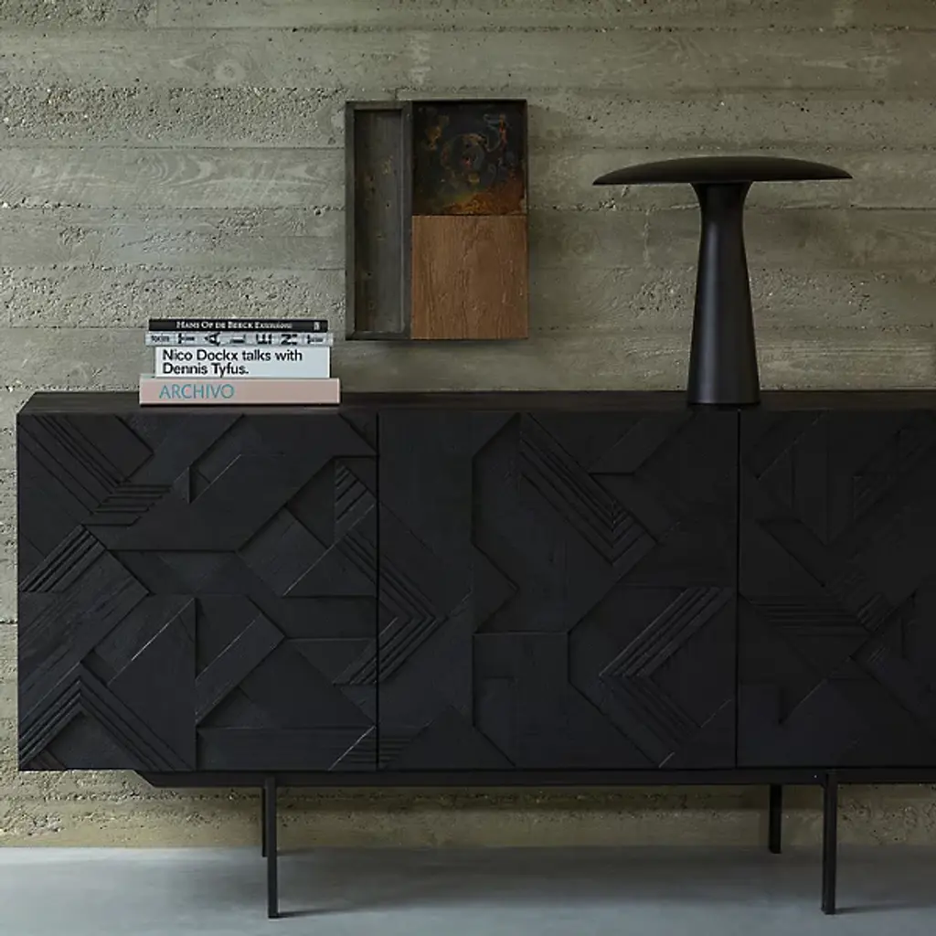 Amp up your indoor style with the angular form and abstract accents of the Teak Graphic Sideboard - 3 Doors from Ethnicraft. Designed by Alain van Havre and made in Indonesia, it rests a rectangular teak frame on a powder-coated steel support structure, while exterior door panels use multiple stacked layers of teak formed into simple geometric shapes to create a deep, dynamic mood. The piece features two shelves inside, providing flexible, concealed storage options for all manner of accessories.