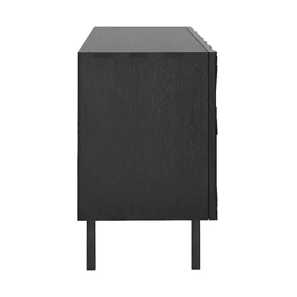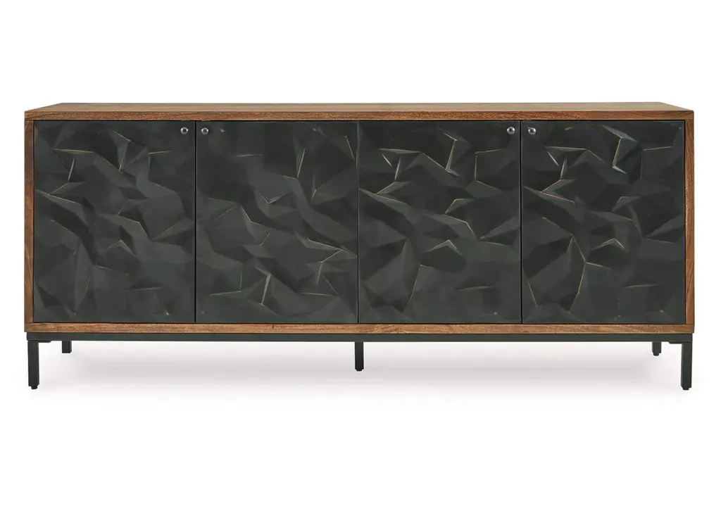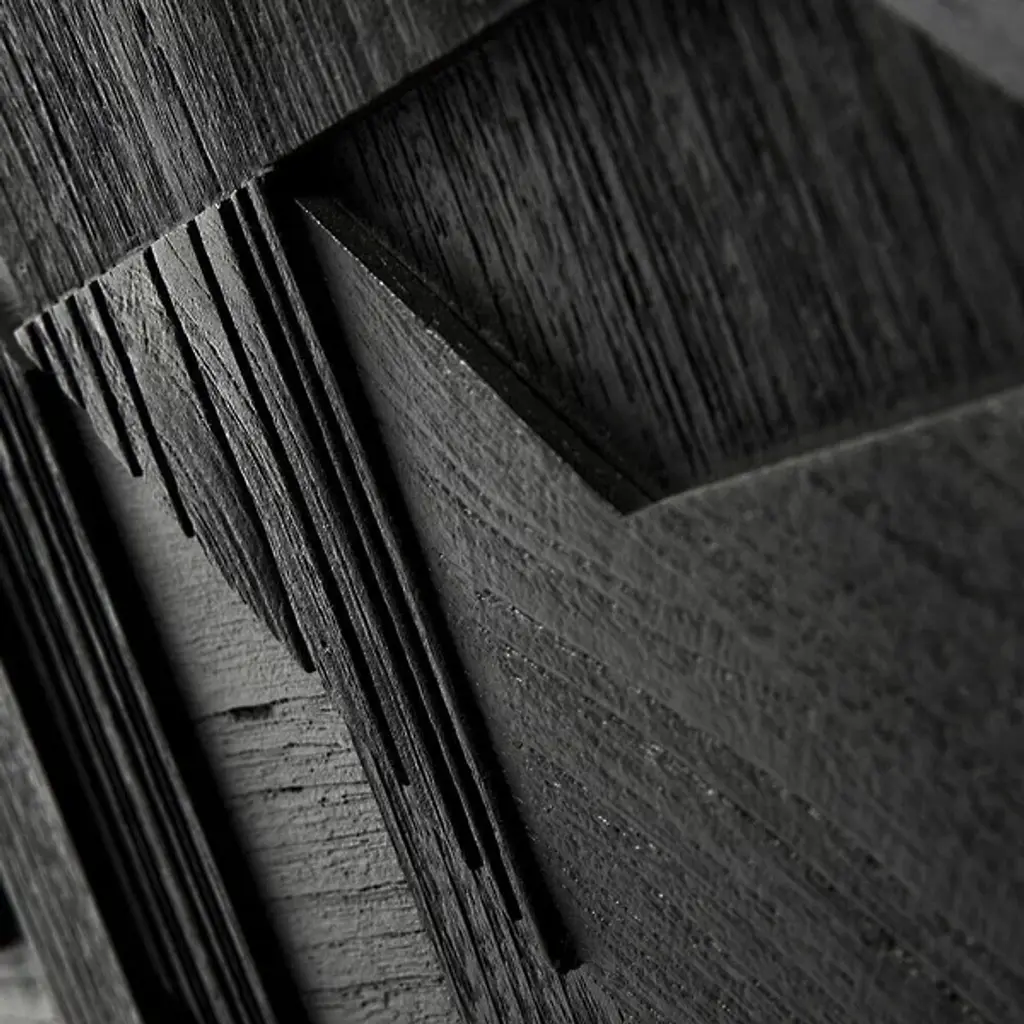 Amp up your indoor style with the angular form and abstract accents of the Teak Graphic Sideboard - 3 Doors from Ethnicraft. Designed by Alain van Havre and made in Indonesia, it rests a rectangular teak frame on a powder-coated steel support structure, while exterior door panels use multiple stacked layers of teak formed into simple geometric shapes to create a deep, dynamic mood. The piece features two shelves inside, providing flexible, concealed storage options for all manner of accessories.