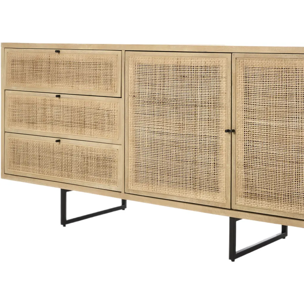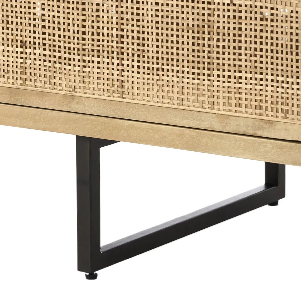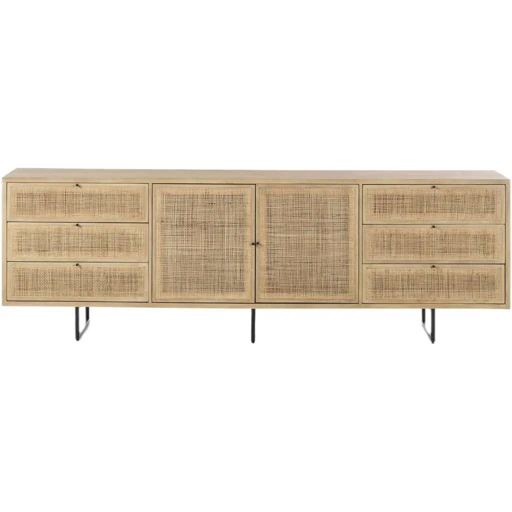 The Tessa Sideboard 96" - Natural Cane is a stunning piece that embodies midcentury-inspired style with a unique twist. Encased in a beautiful mango wood frame, it features light cane weaves that offer a fresh, natural aesthetic. The design is completed with angular gunmetal-finished iron legs, adding a modern edge to its classic silhouette. This sideboard provides ample interior storage, perfect for organizing your favorite table linens and dinnerware, making it a functional yet stylish addition to any dining space.