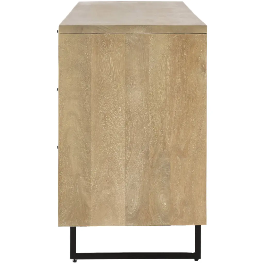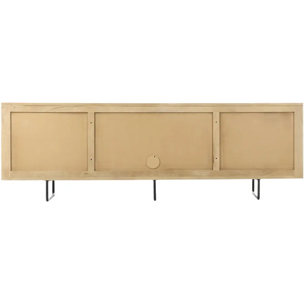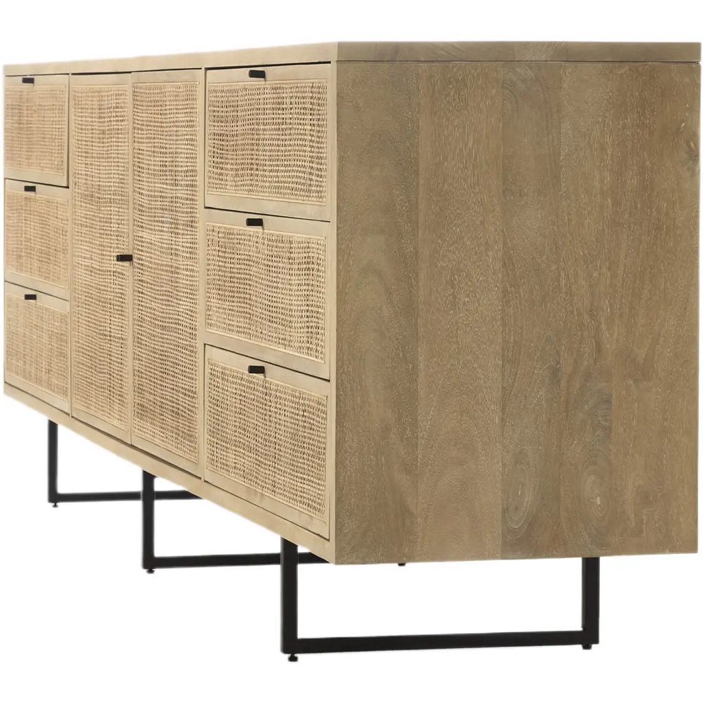 The Tessa Sideboard 96" - Natural Cane is a stunning piece that embodies midcentury-inspired style with a unique twist. Encased in a beautiful mango wood frame, it features light cane weaves that offer a fresh, natural aesthetic. The design is completed with angular gunmetal-finished iron legs, adding a modern edge to its classic silhouette. This sideboard provides ample interior storage, perfect for organizing your favorite table linens and dinnerware, making it a functional yet stylish addition to any dining space.