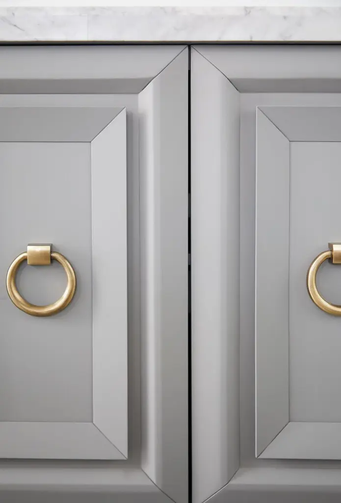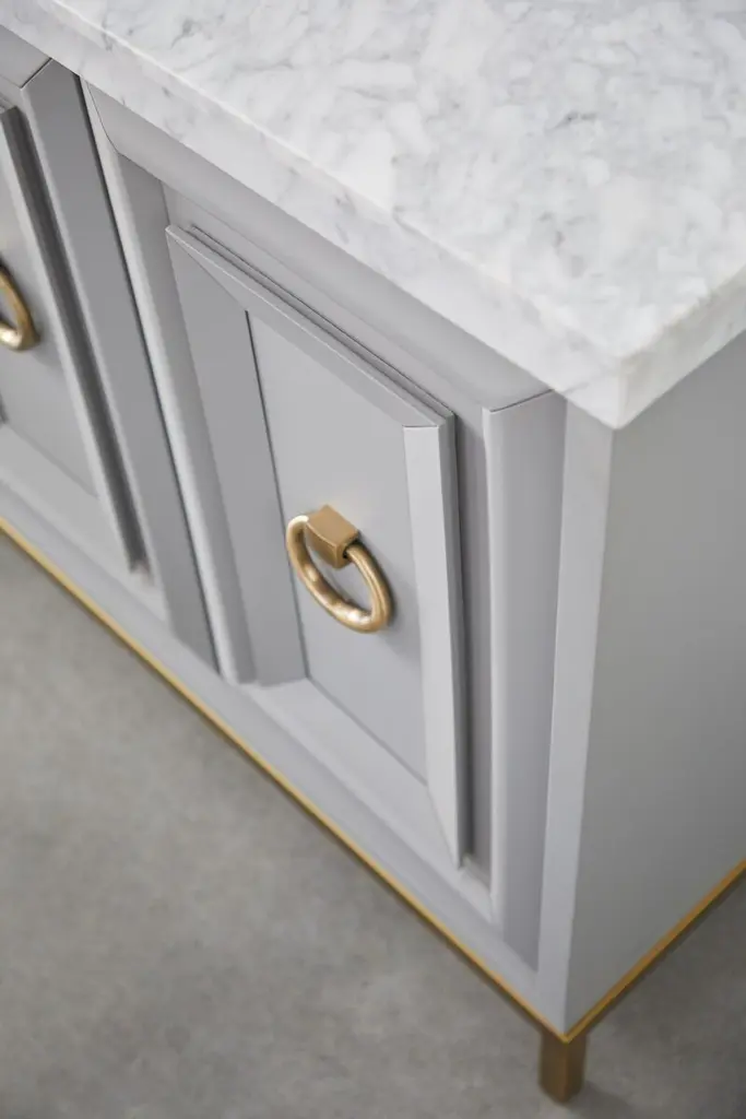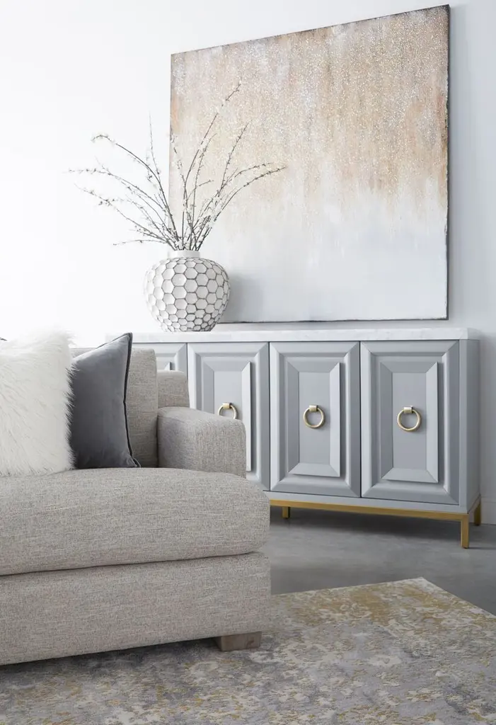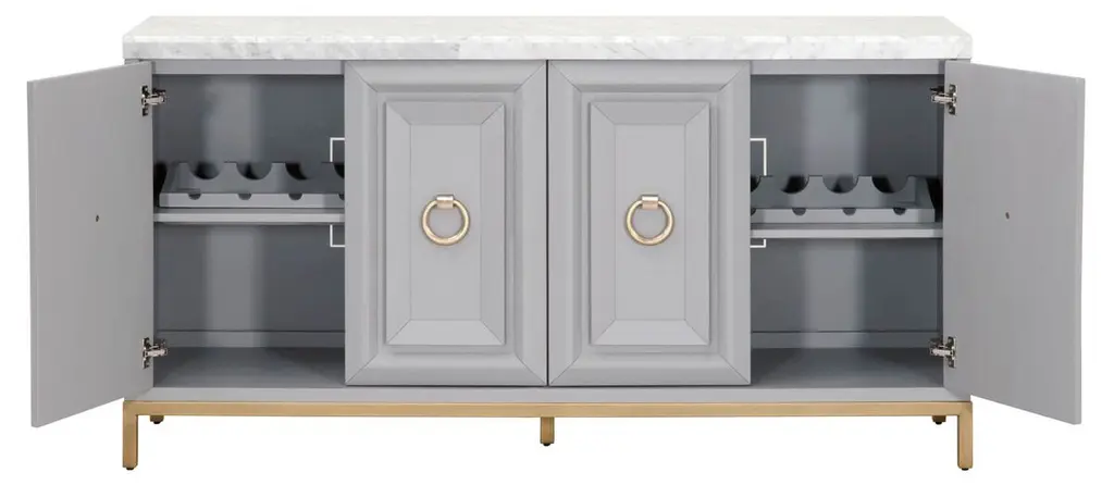 This sideboard is an exemplar of elegance, from its two-inch-thick Carrara marble veneer top to the gold finish of its base. Behind each pair of cabinet doors is an adjustable shelf with a removable seven-bottle wine rack and a cutout for cord management.